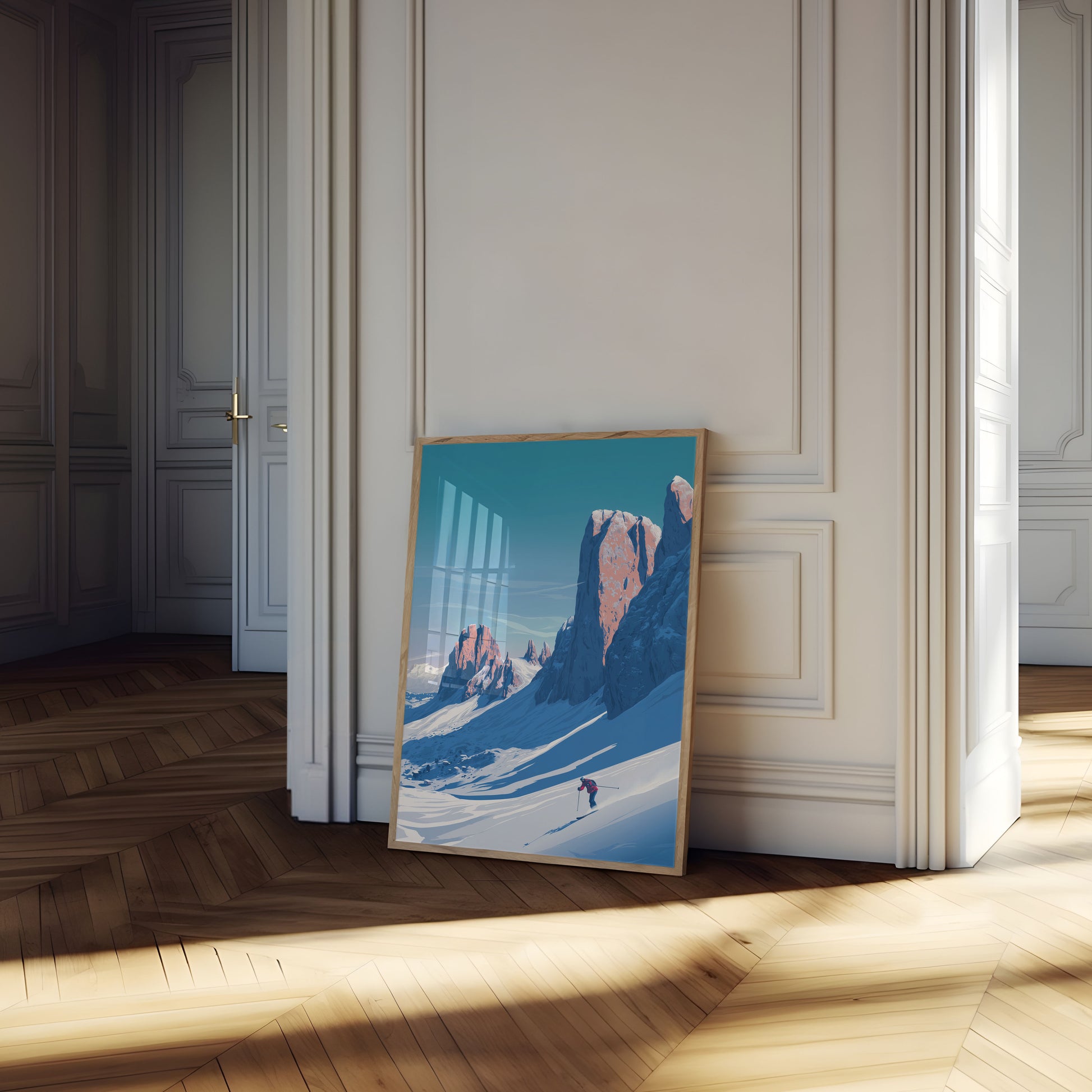 Sumérgete en la imponente majestuosidad de este impresionante paisaje de esquí alpino. Impresionantes picos rocosos proyectan largas sombras azules sobre laderas nevadas prístinas, mientras un esquiador solitario traza un elegante camino a través de la serena naturaleza invernal. La obra de arte captura la sublime belleza y la tranquilidad del aislamiento del esquí de montaña, con una fascinante paleta de azules fríos y agujas rocosas con cálidos toques rosados.