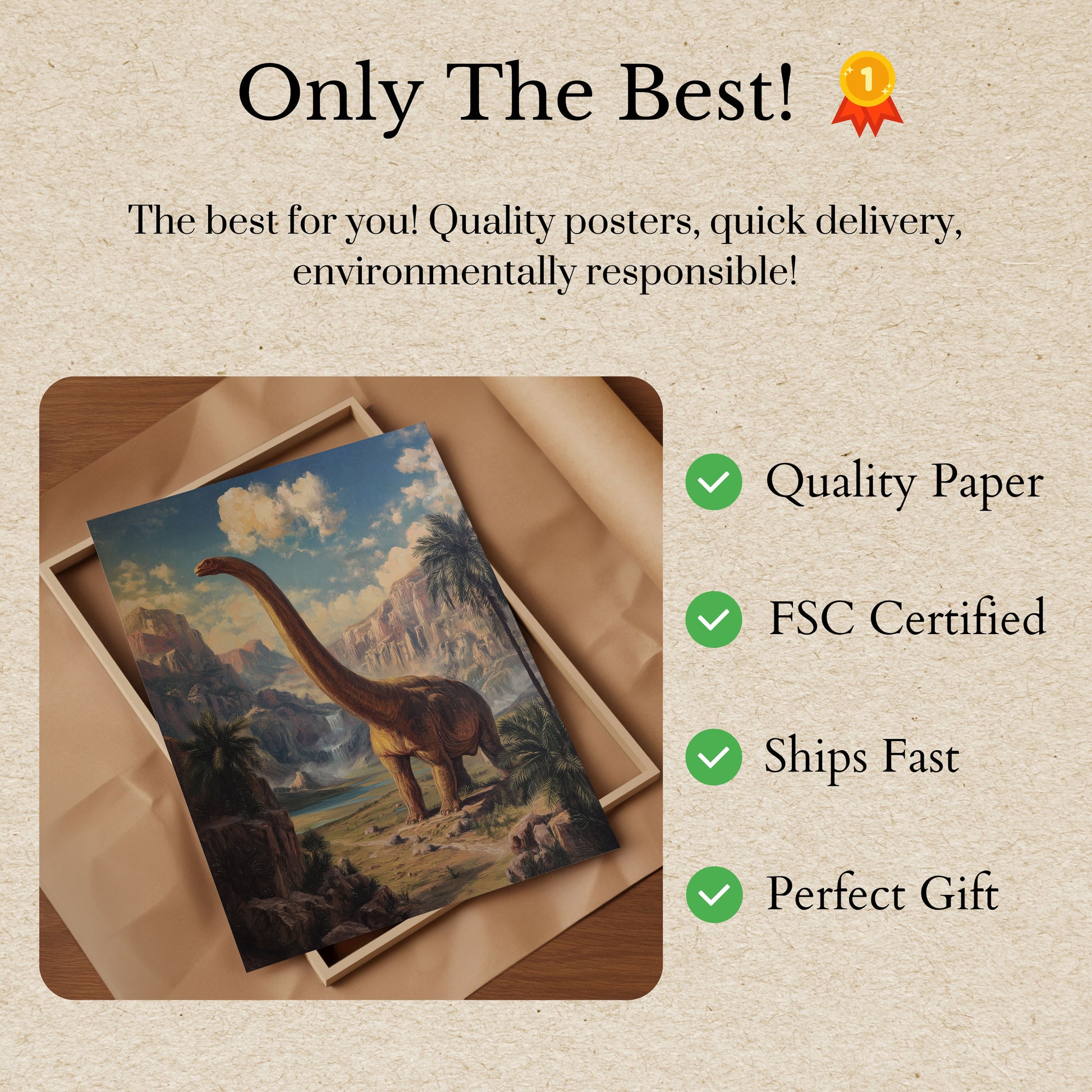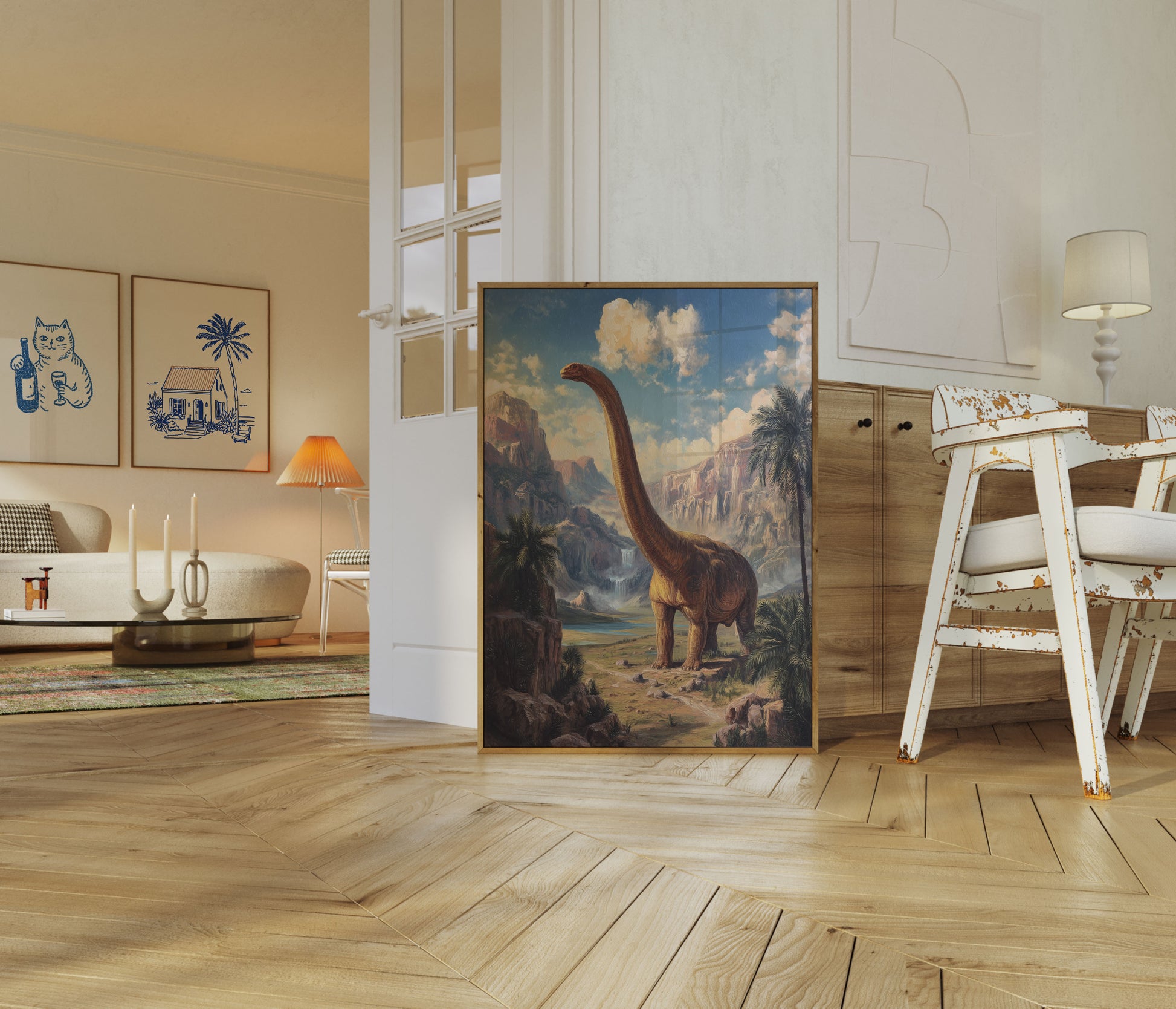 Viaja a la era prehistórica con esta impresionante ilustración de un majestuoso braquiosaurio que se yergue imponente entre espectaculares acantilados rocosos y cascadas. Los colores intensos y cálidos y los intrincados detalles te transportan a un mundo primigenio de maravillas, donde criaturas gigantes vagaban por exuberantes paisajes bajo ondulantes nubes e imponentes palmeras. Esta impresionante obra de arte captura la imponente escala y belleza del pasado remoto de la Tierra.