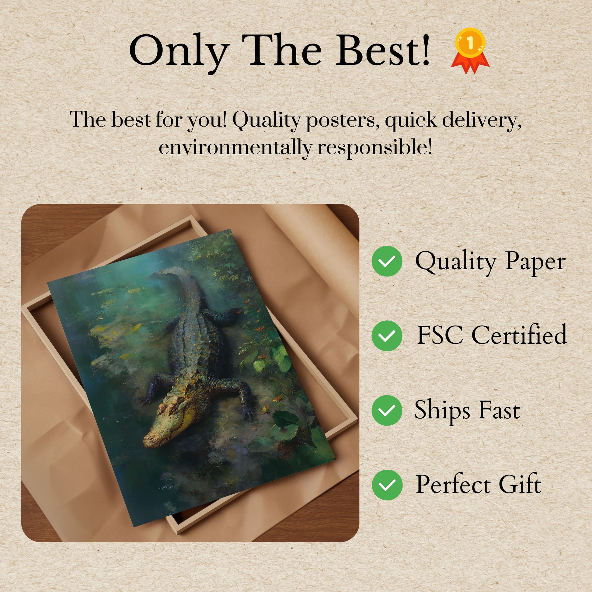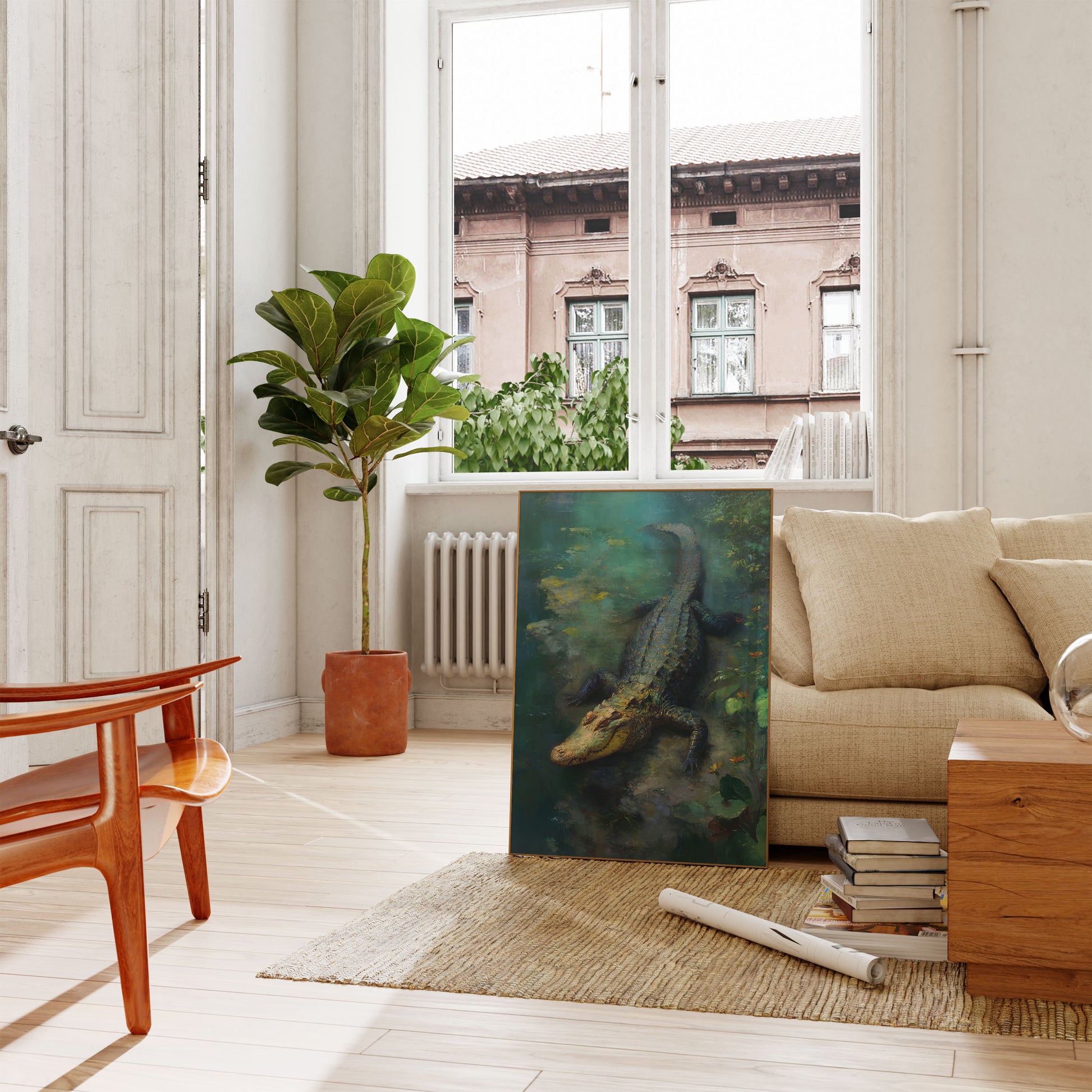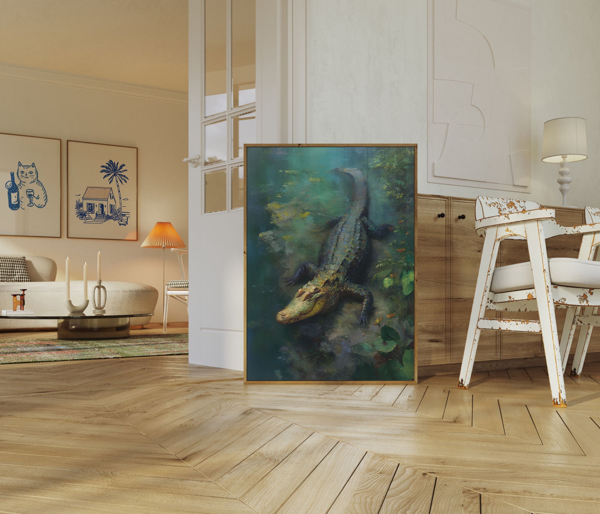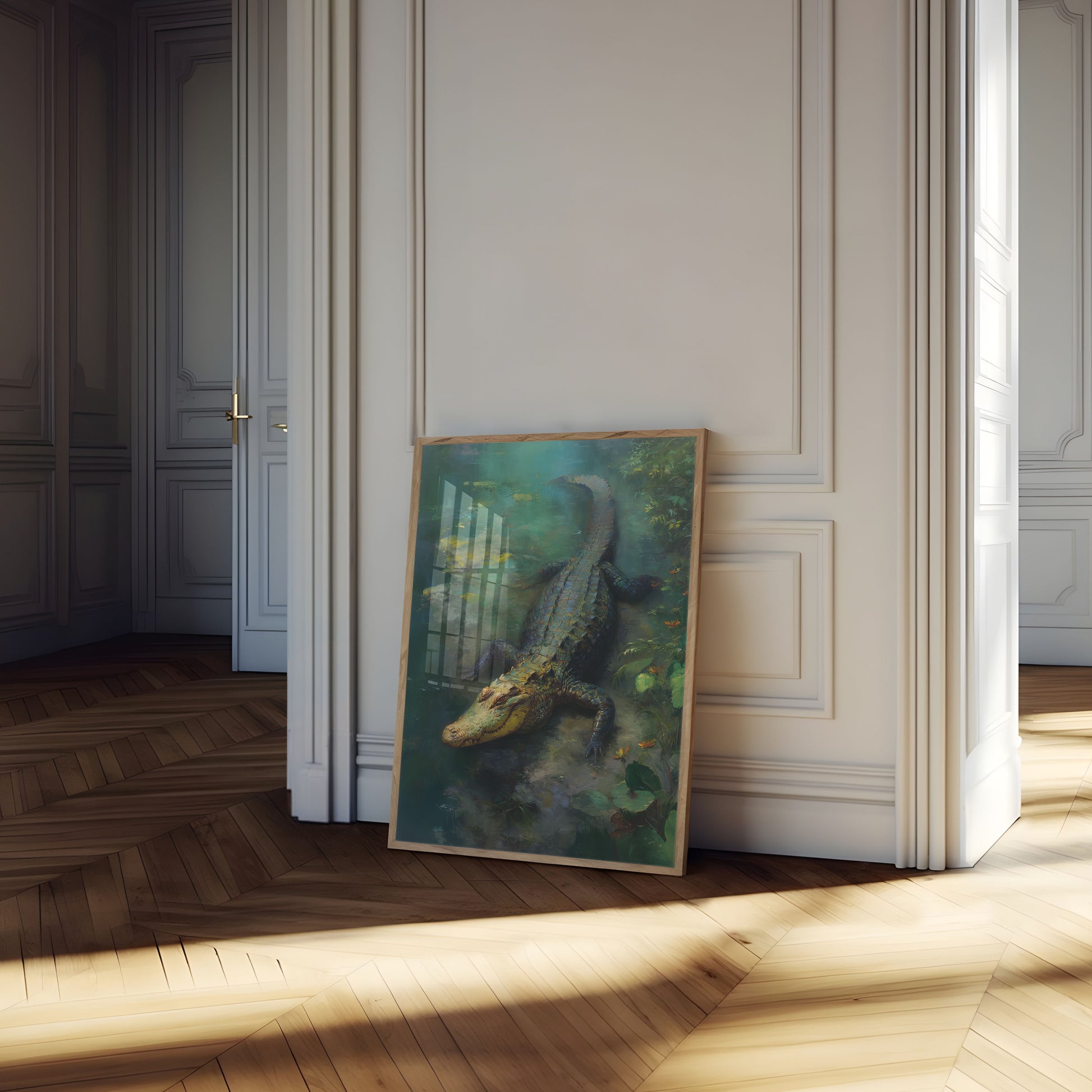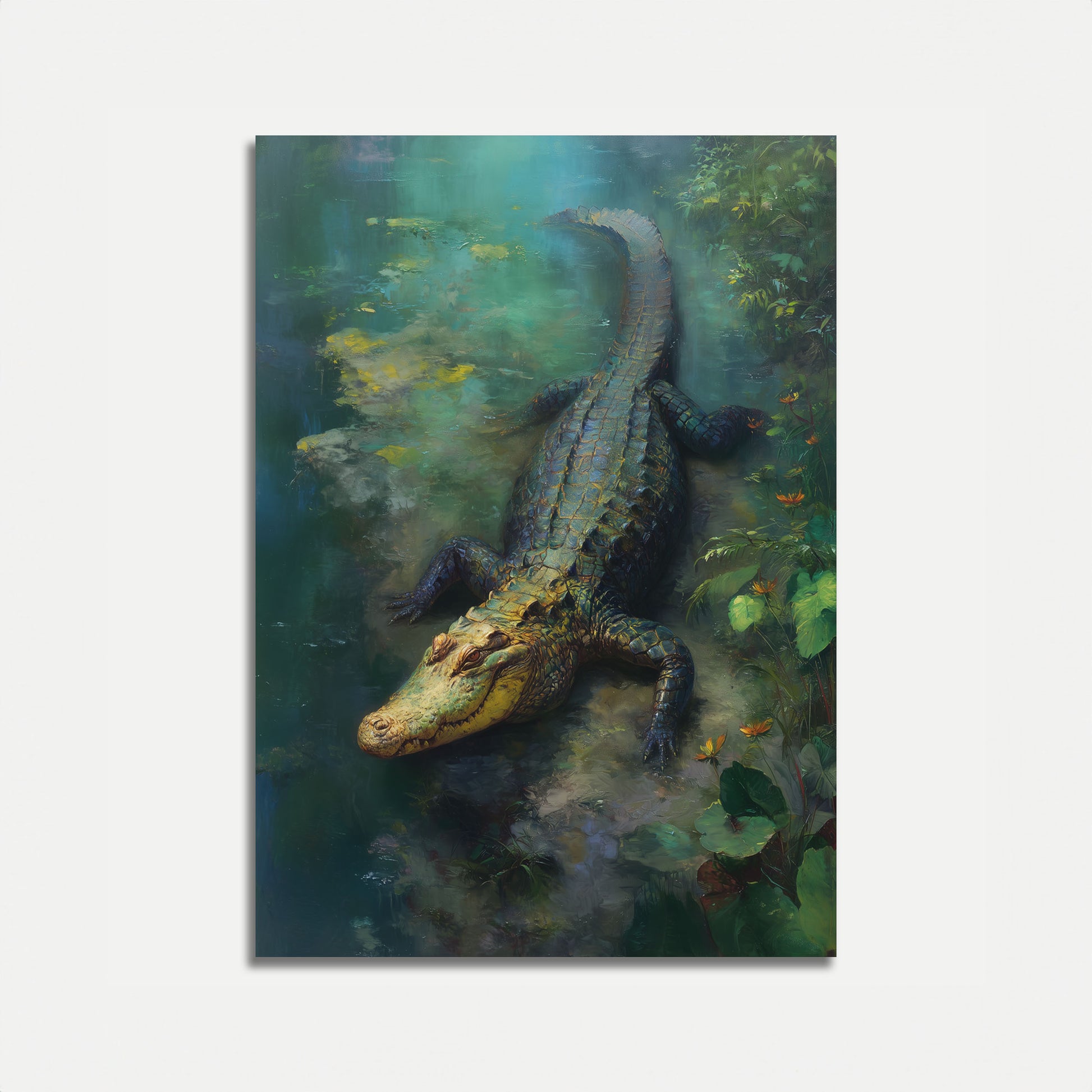 Sumérgete en el mundo místico de esta impresionante obra de arte sobre un caimán, donde las aguas color esmeralda y turquesa se funden a la perfección con la textura de la piel del reptil prehistórico. La pintura captura un momento sereno pero a la vez poderoso, con el cocodrilo descansando entre un suave follaje verde y delicadas flores anaranjadas, creando una atmósfera de naturaleza atemporal y una fuerza serena. Cada pincelada da vida a la esencia ancestral de la criatura, invitando al espectador a un exuberante ecosistema de ensueño.