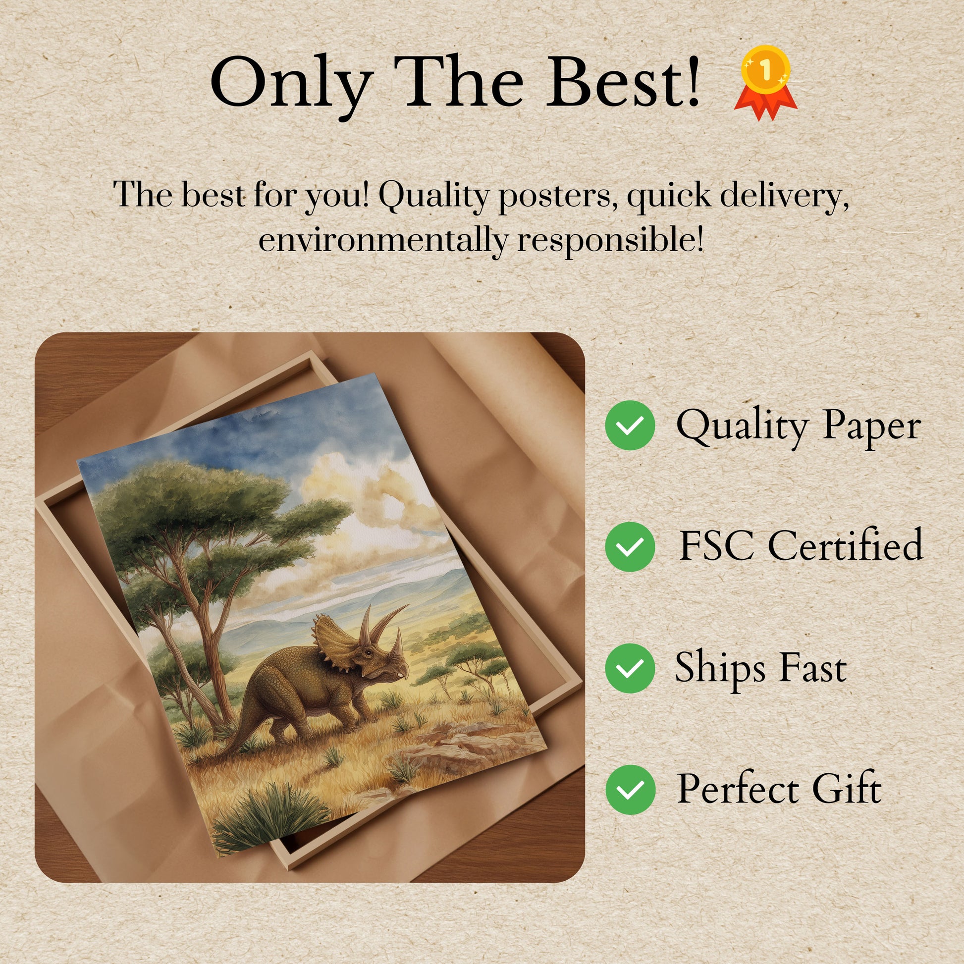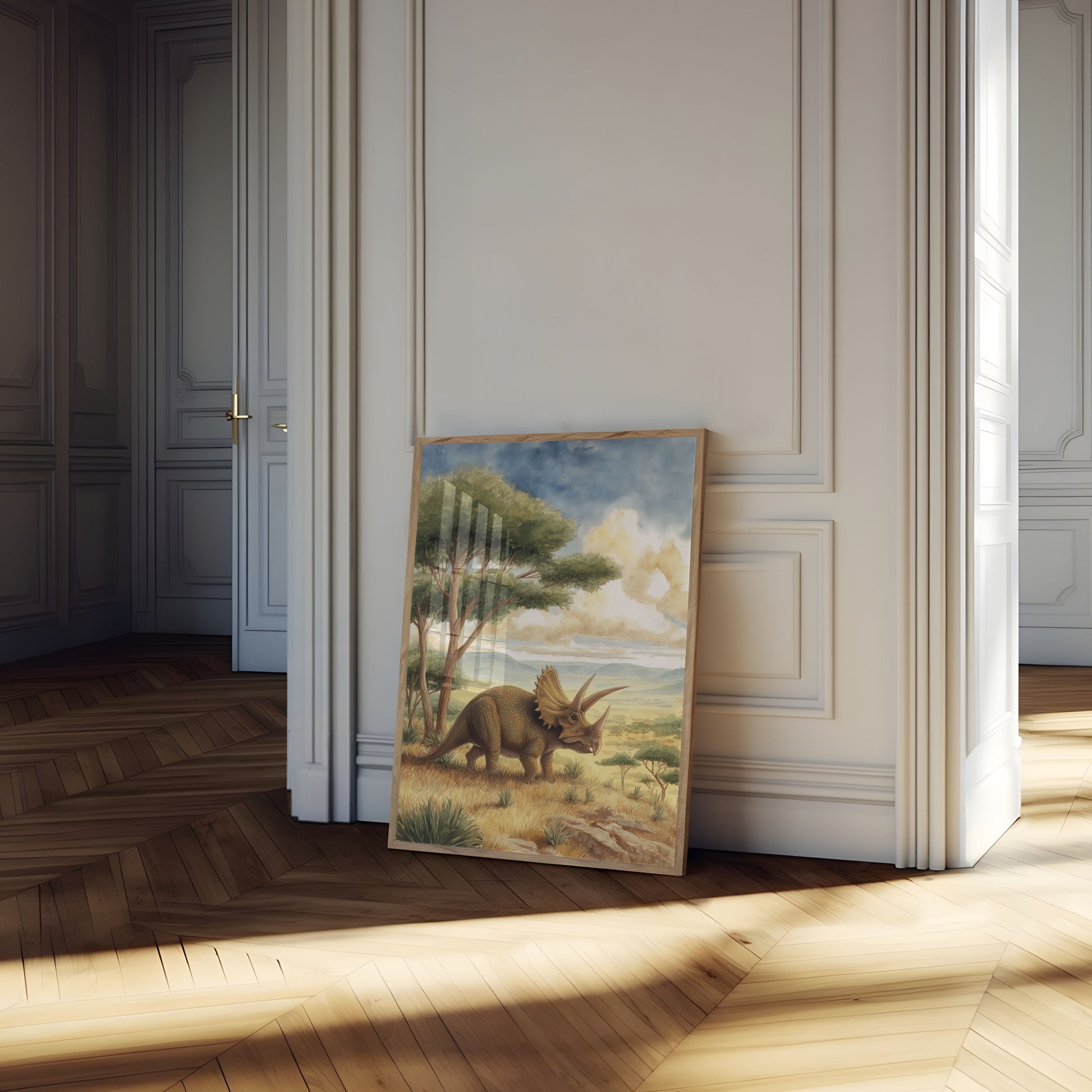 Adéntrate en el fascinante mundo del Cretácico tardío con este impresionante paisaje de dinosaurios. Un majestuoso triceratops se yergue entre acacias, con un telón de fondo de ensueño de suaves nubes doradas y montañas azules y brumosas. La ilustración en acuarela captura la serena belleza del terreno prehistórico con increíble detalle y cálidos tonos terrosos que dan vida a esta antigua escena.
