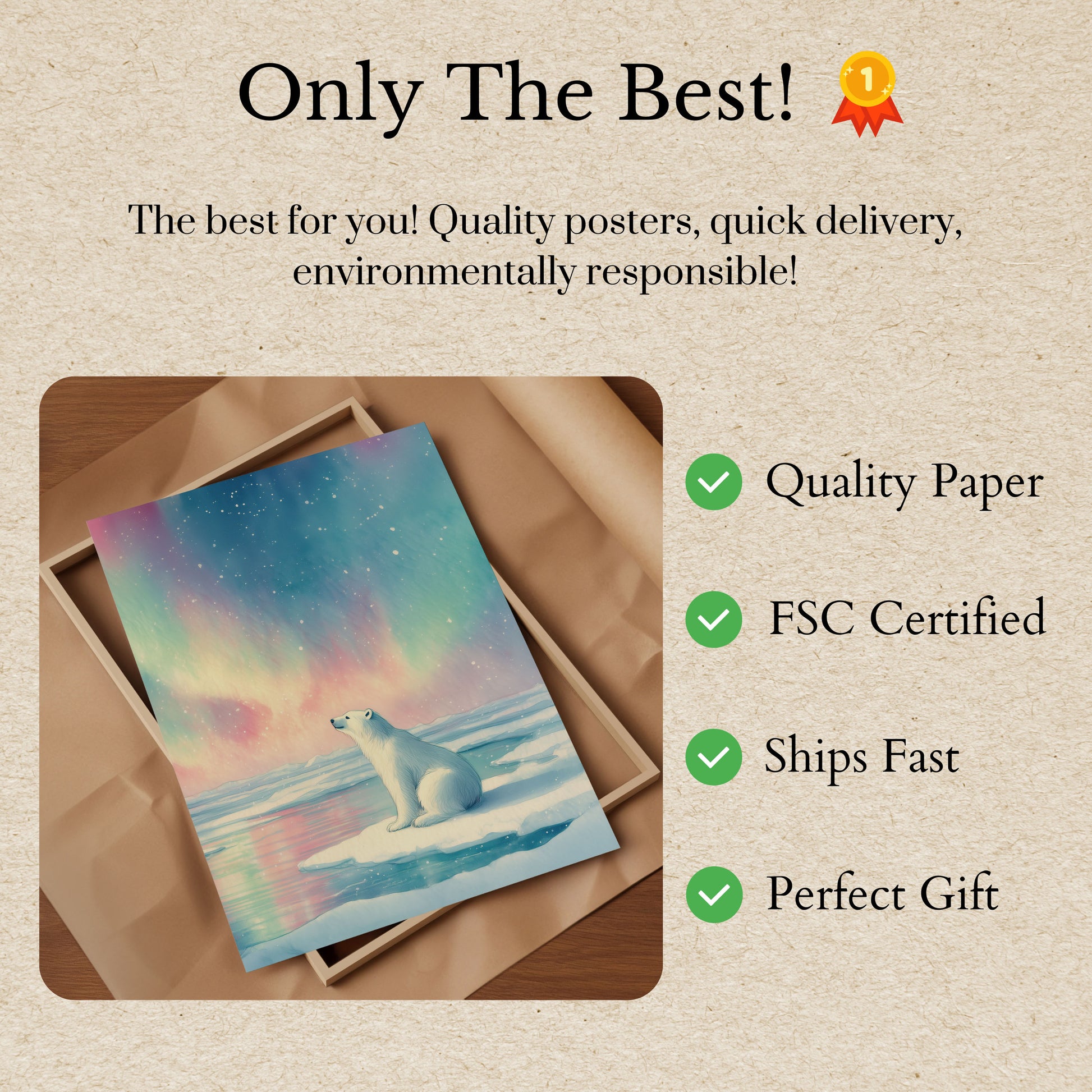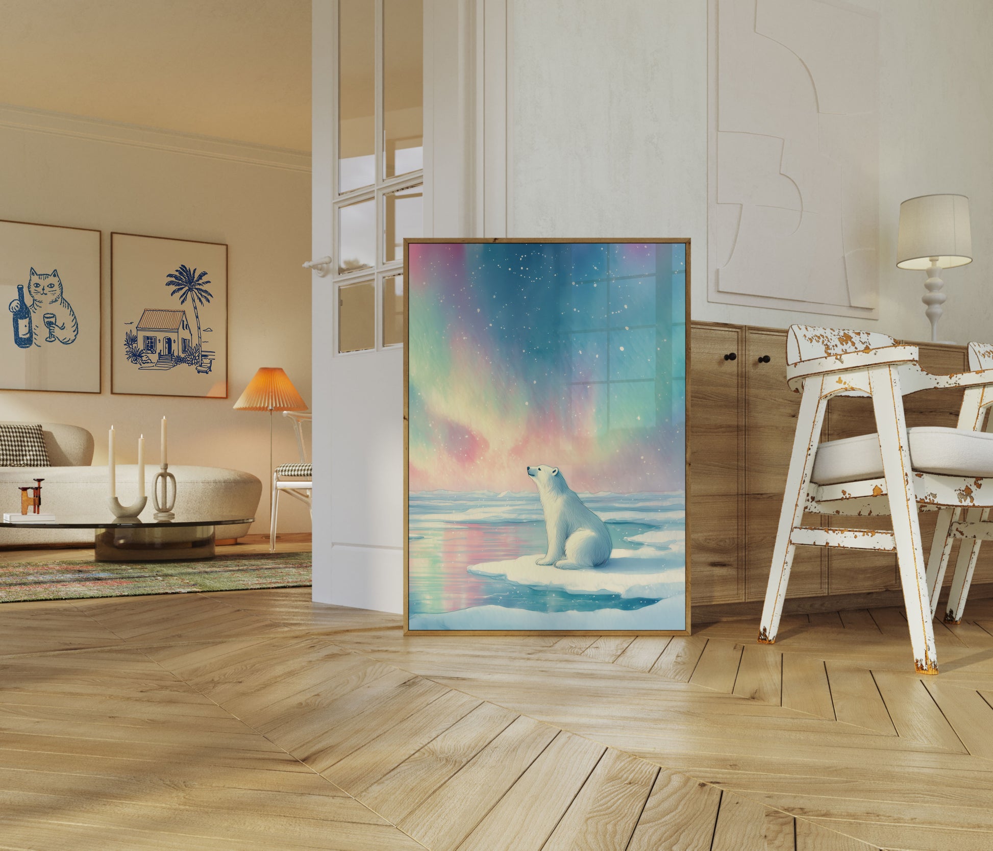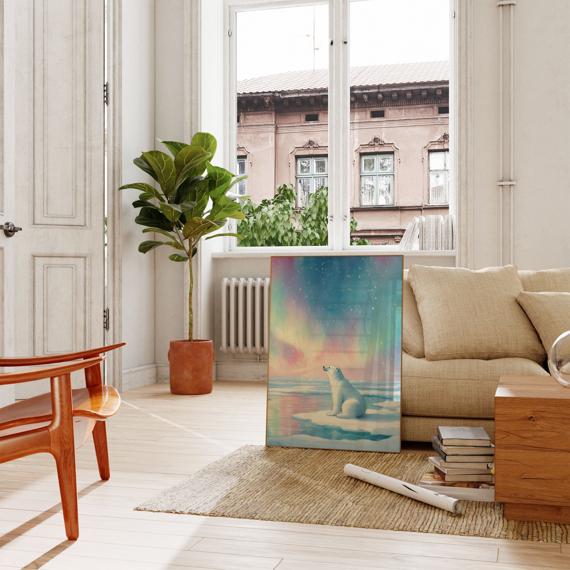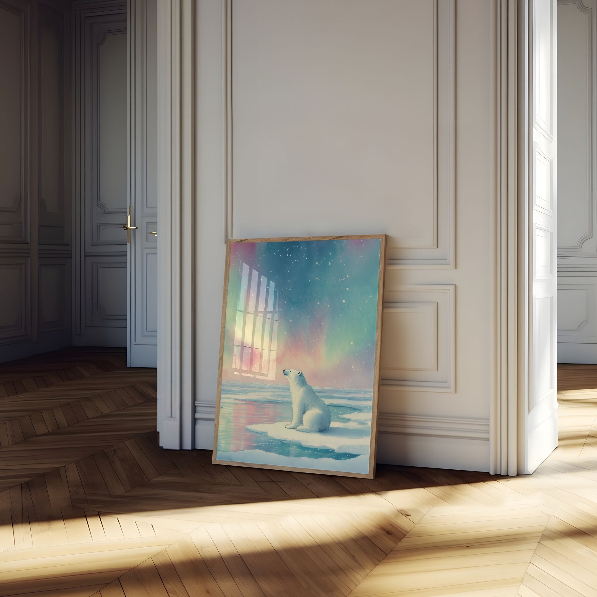 Sumérgete en la belleza etérea del Ártico con esta impresionante obra de arte de un oso polar. Suaves tonos pastel de rosa, azul y verde danzan en el cielo, creando un fascinante telón de fondo de aurora para un sereno oso polar sentado sobre un delicado témpano de hielo. La imagen captura un momento de tranquila contemplación, con suaves copos de nieve brillando alrededor de la majestuosa criatura en un paisaje celestial de ensueño.