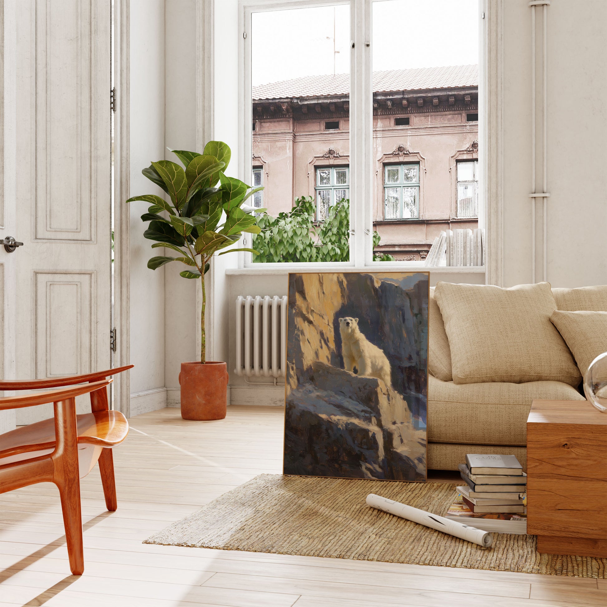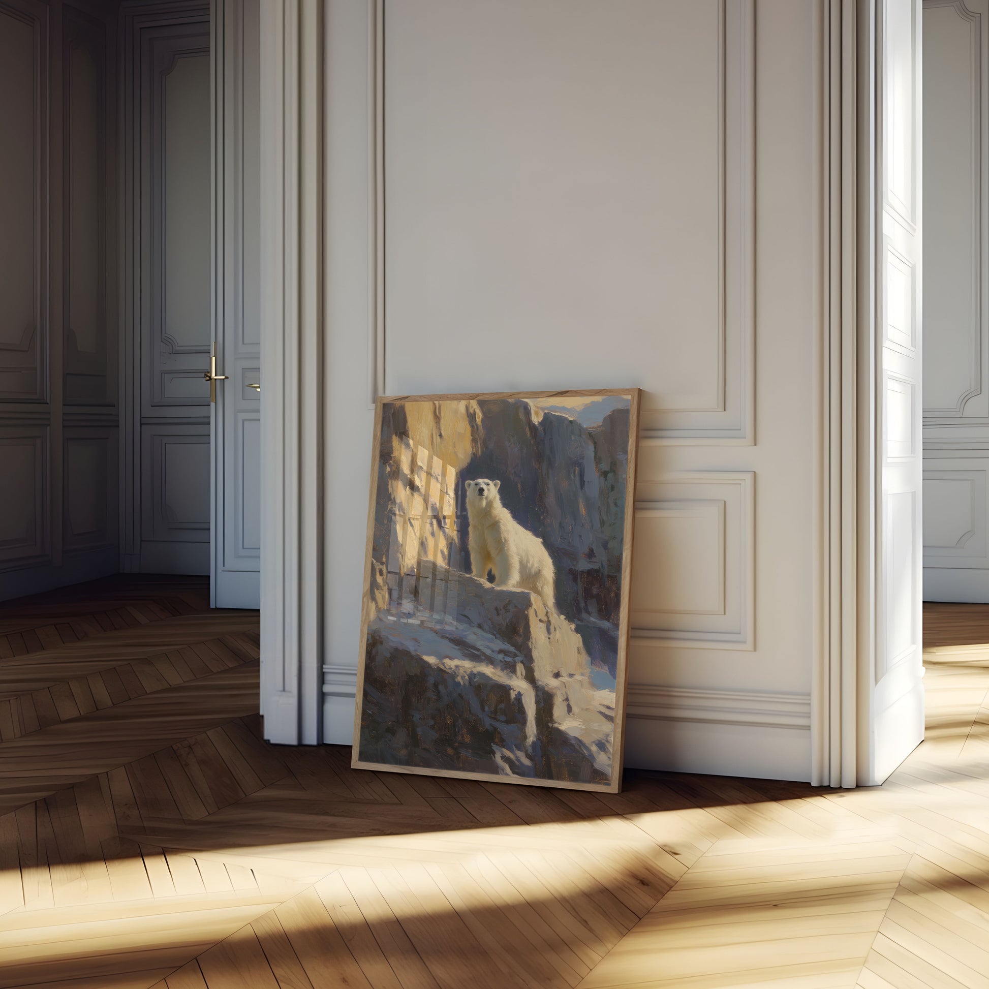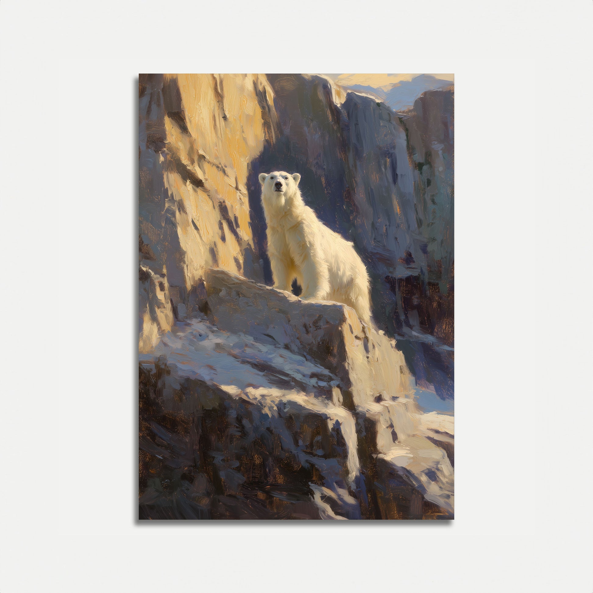 Contemple el imponente poder de la naturaleza en este impresionante retrato de un oso polar con un espectacular paisaje rocoso como telón de fondo. La pintura captura la esencia serena y feroz del depredador ártico, erguido con orgullo sobre un escarpado acantilado bañado por la dorada luz del sol y las profundas sombras azules. Cada pincelada evoca la fuerza y la soledad del majestuoso oso blanco en esta increíble obra de arte de la vida silvestre.