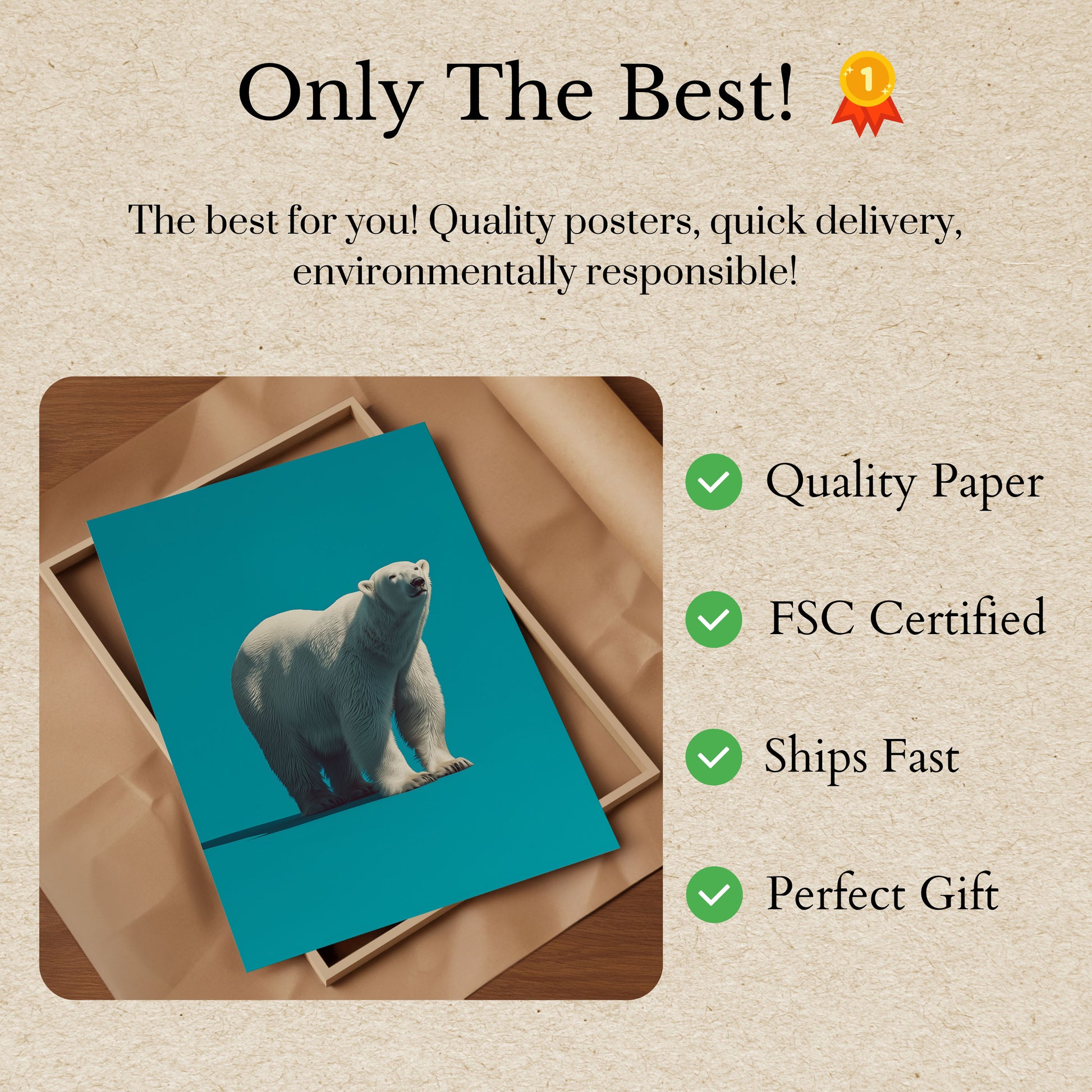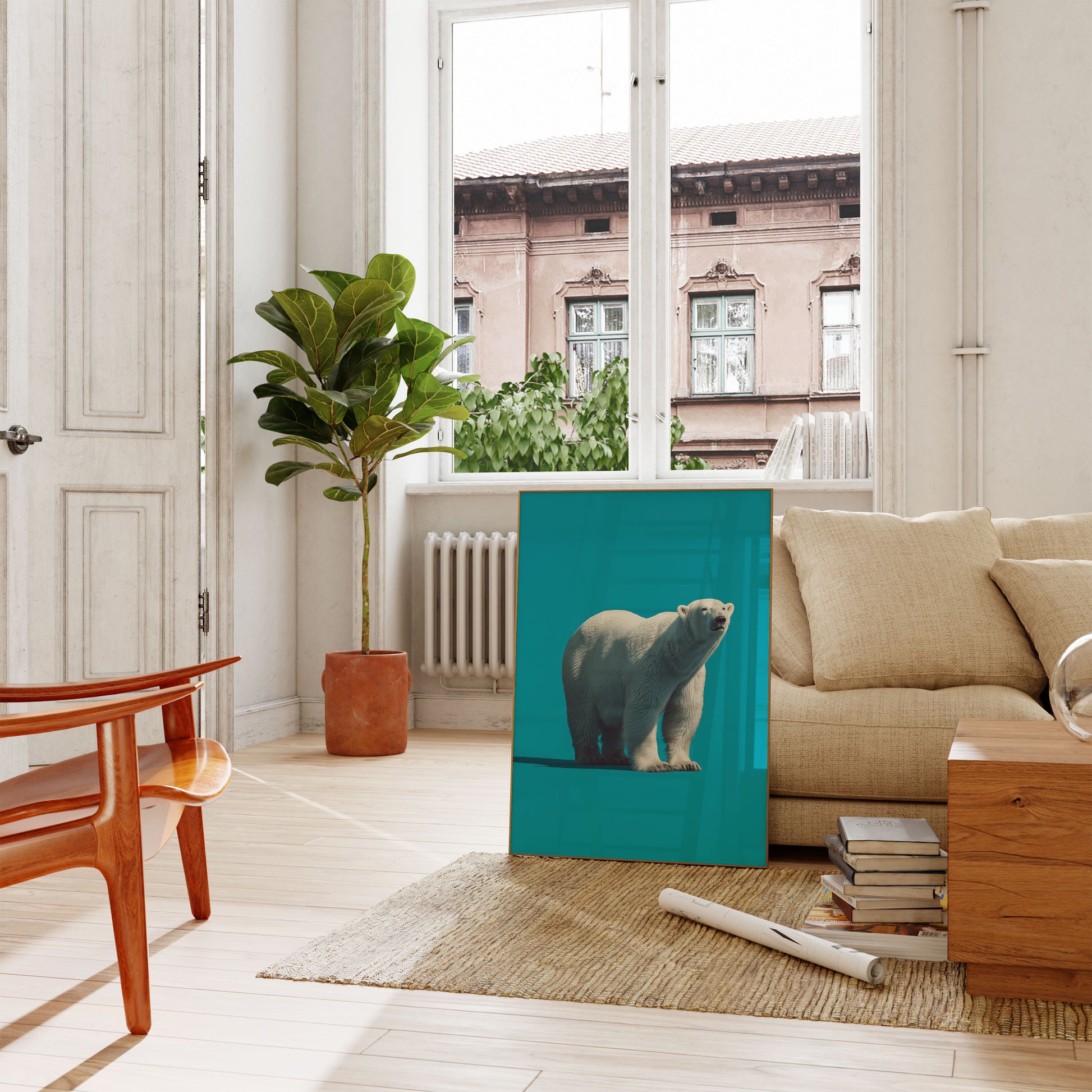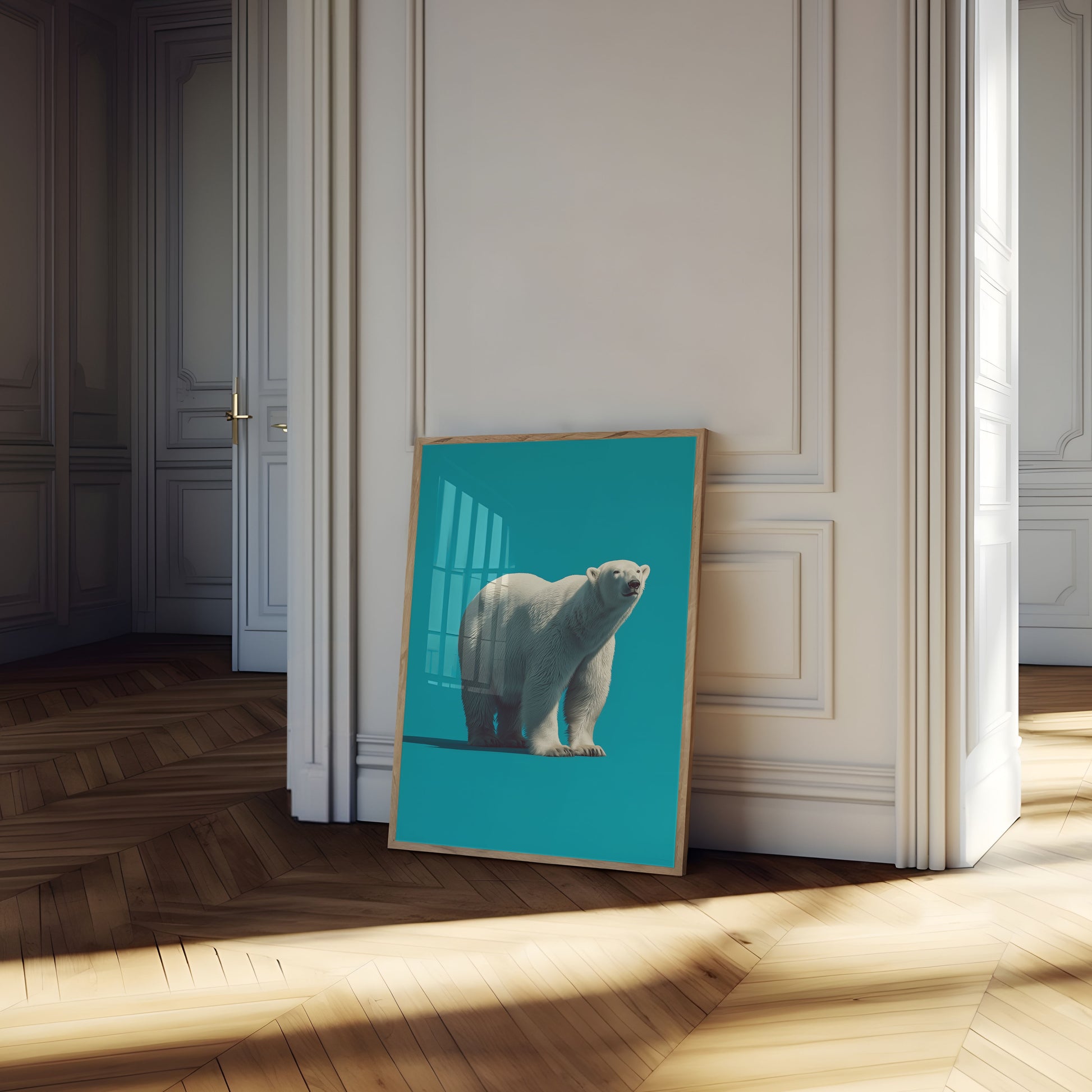 Contemple al magnífico oso polar en esta impresionante lámina minimalista. Sobre un vibrante fondo verde azulado, esta majestuosa criatura emerge con increíble detalle, mostrando la belleza y el poder de la fauna ártica. Su pelaje blanco nítido y las sutiles sombras crean una imagen cautivadora que captura la esencia de la naturaleza en un instante único e impresionante.