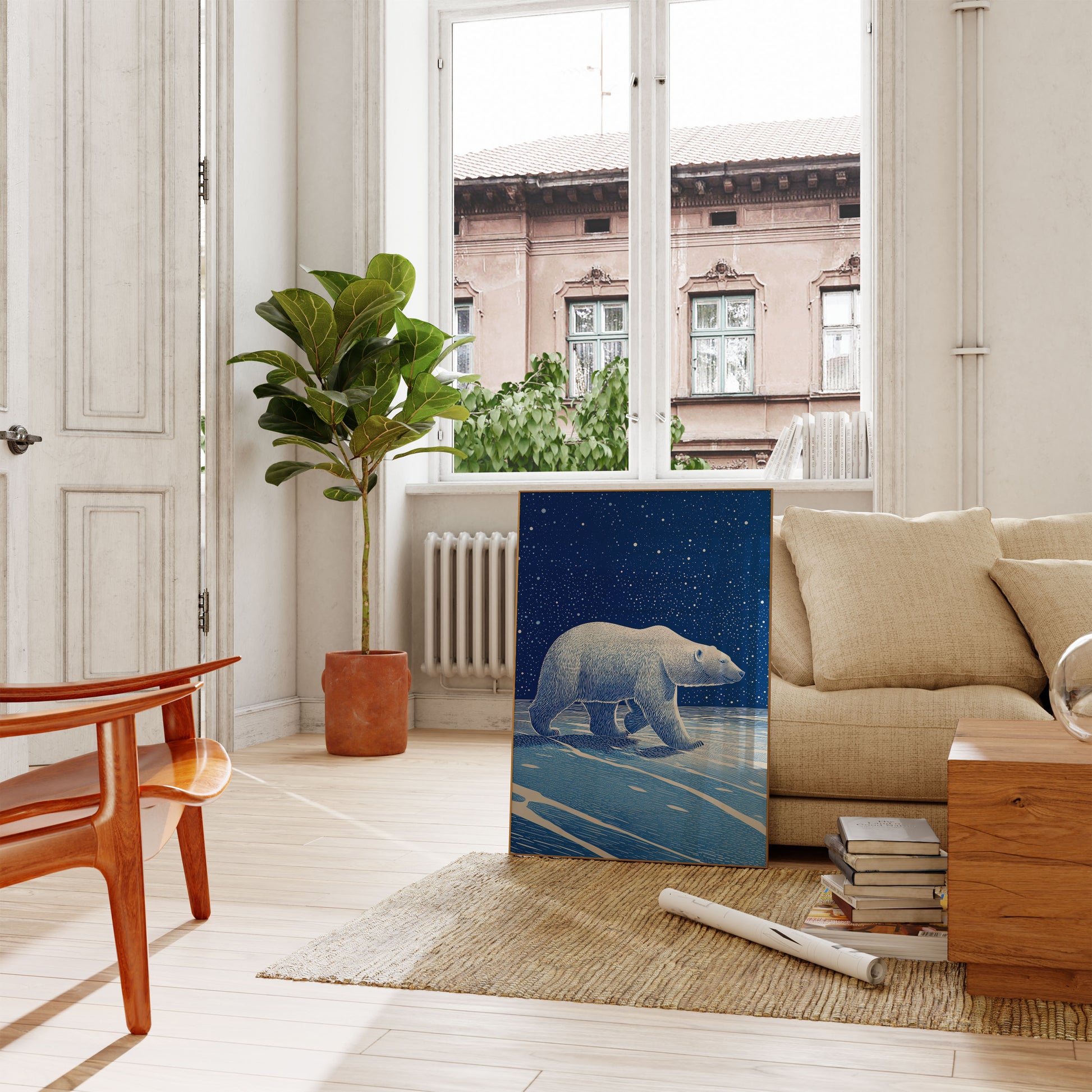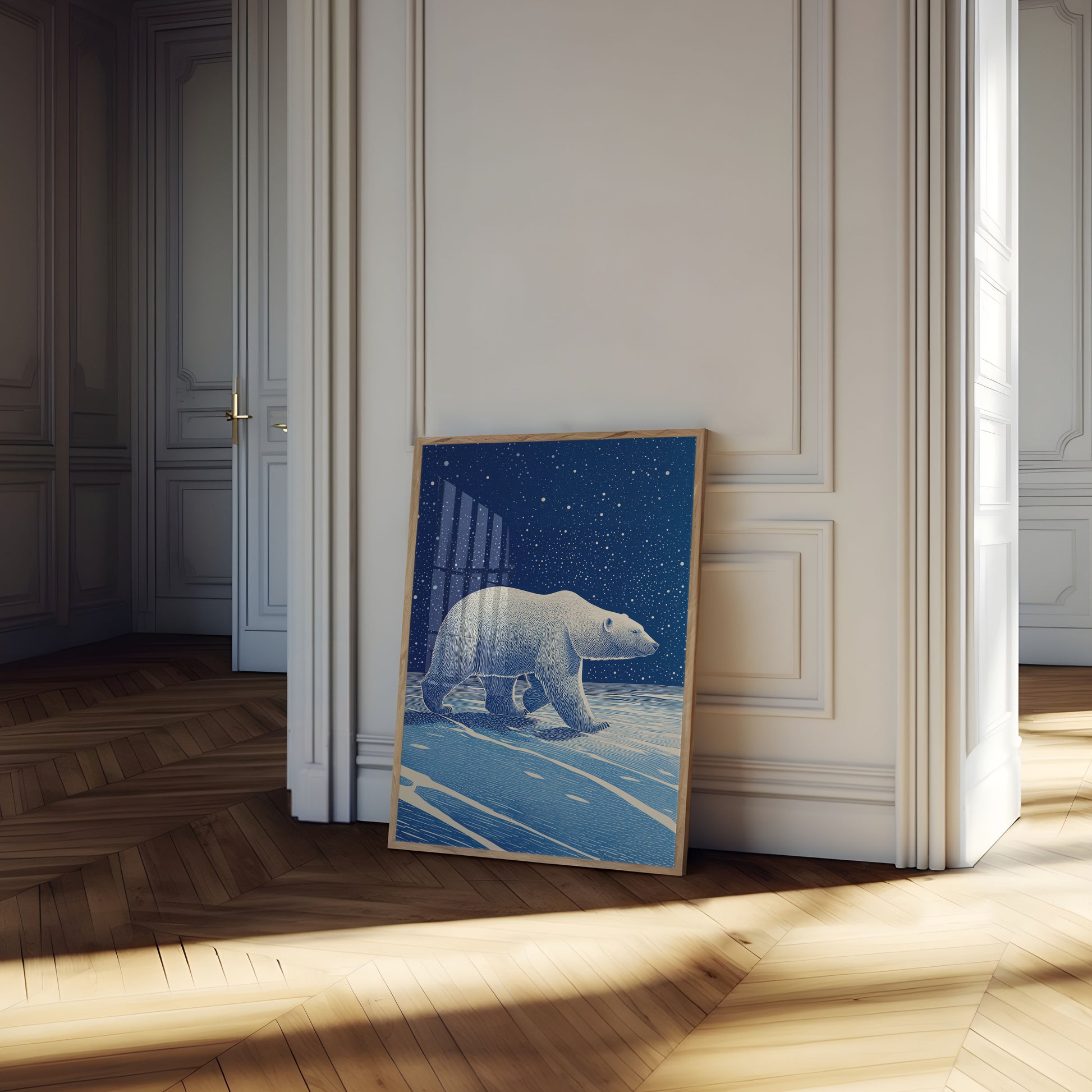 Adéntrate en un mundo fascinante de azul profundo y blanco plateado con esta impresionante ilustración de un oso polar. Con el cielo estrellado de medianoche como fondo, el majestuoso oso recorre un paisaje sereno y gélido, mientras su pelaje texturizado crea una sensación de movimiento y gracia. El intrincado trazo y el fondo celestial capturan la belleza etérea y la soledad de la naturaleza ártica.