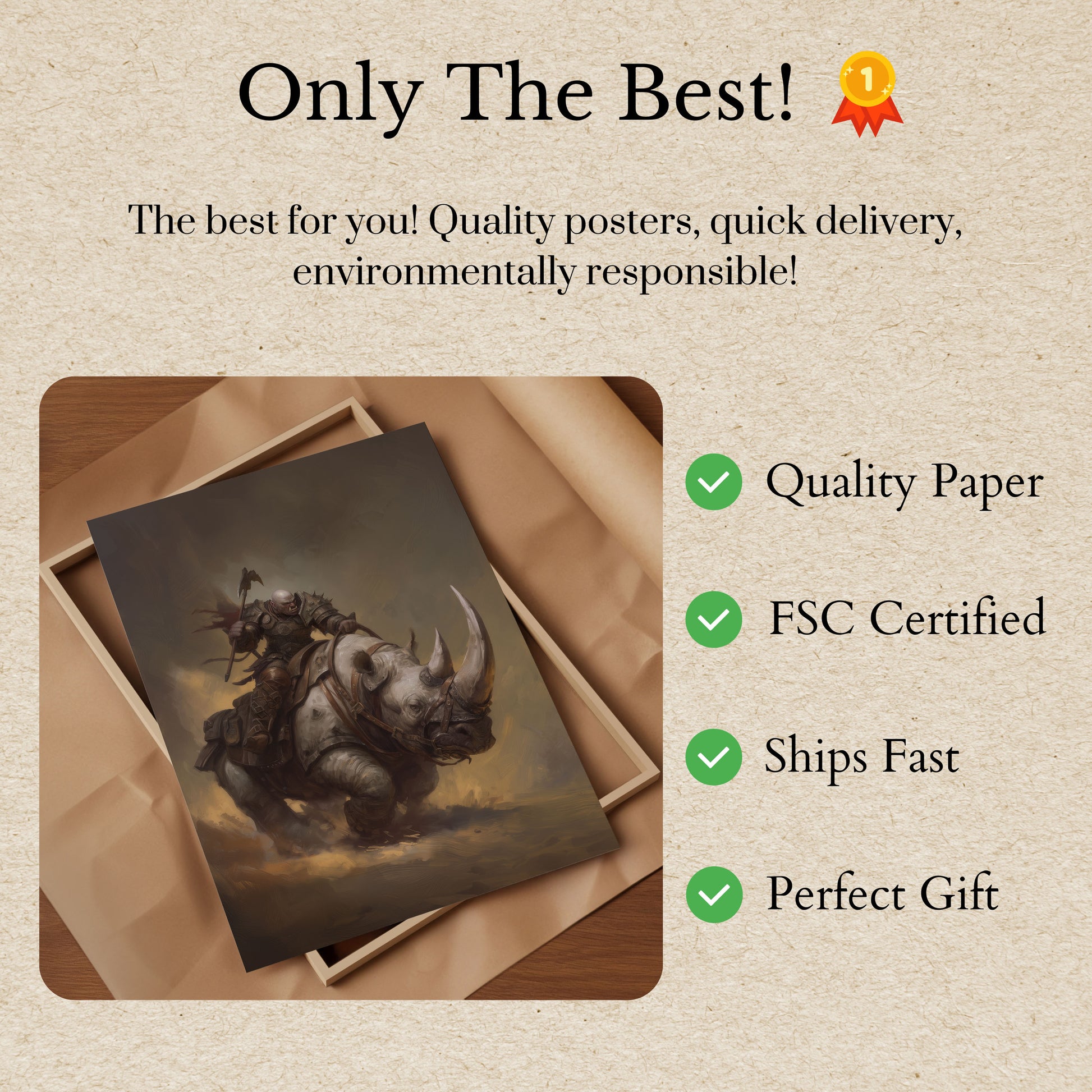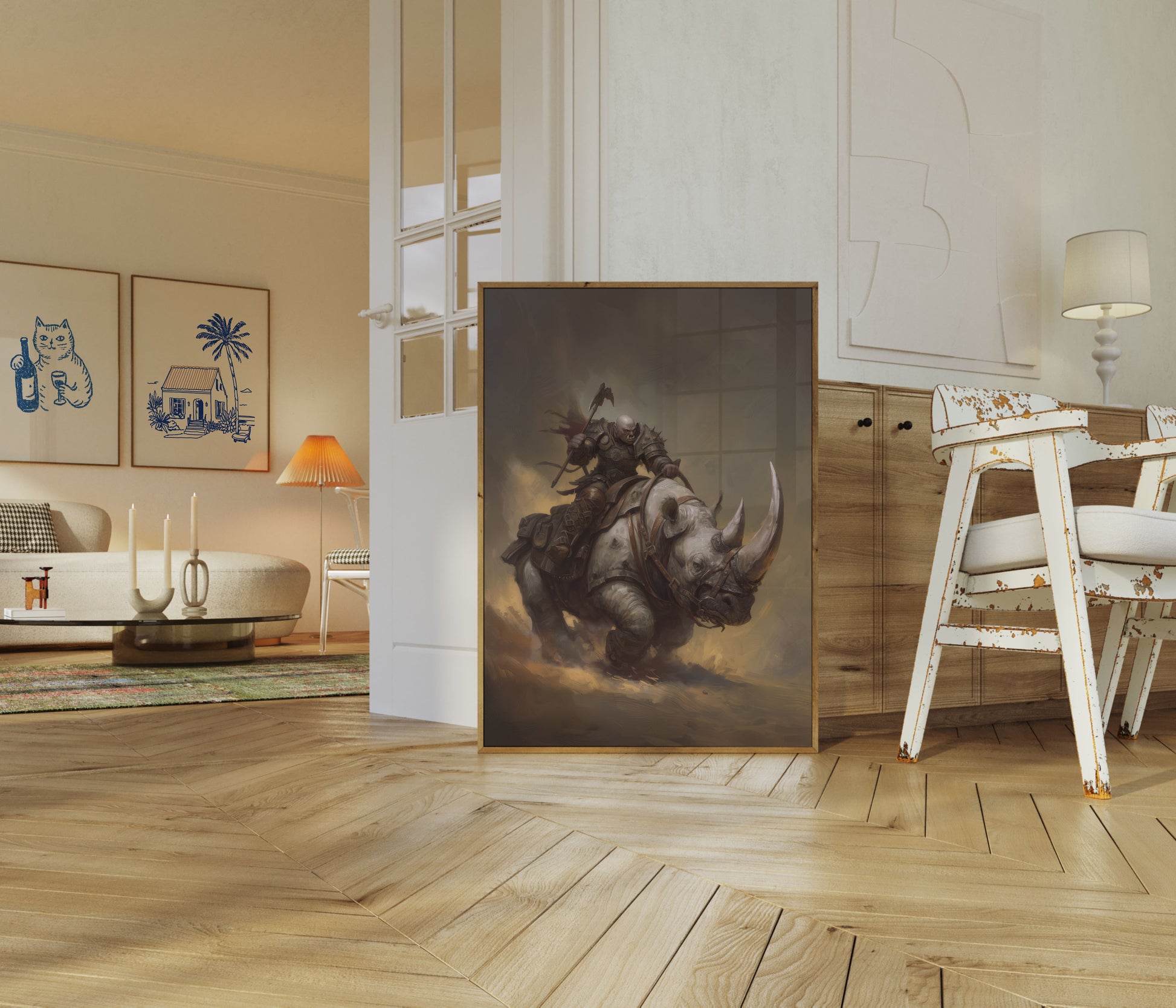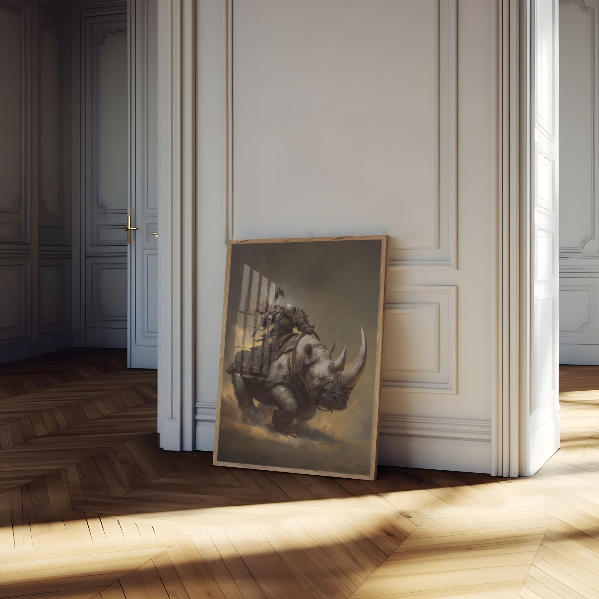 Desata el poder de la fantasía épica con esta impresionante ilustración de un guerrero musculoso montado en un rinoceronte listo para la batalla a través de un paisaje polvoriento y atmosférico. La intrincada armadura, la expresión feroz y el movimiento dinámico crean una escena intensa que captura la energía pura del combate mítico. Cada pincelada da vida a esta extraordinaria criatura fantástica, fusionando fuerza, determinación y fuerza primaria en una narrativa visual impresionante.