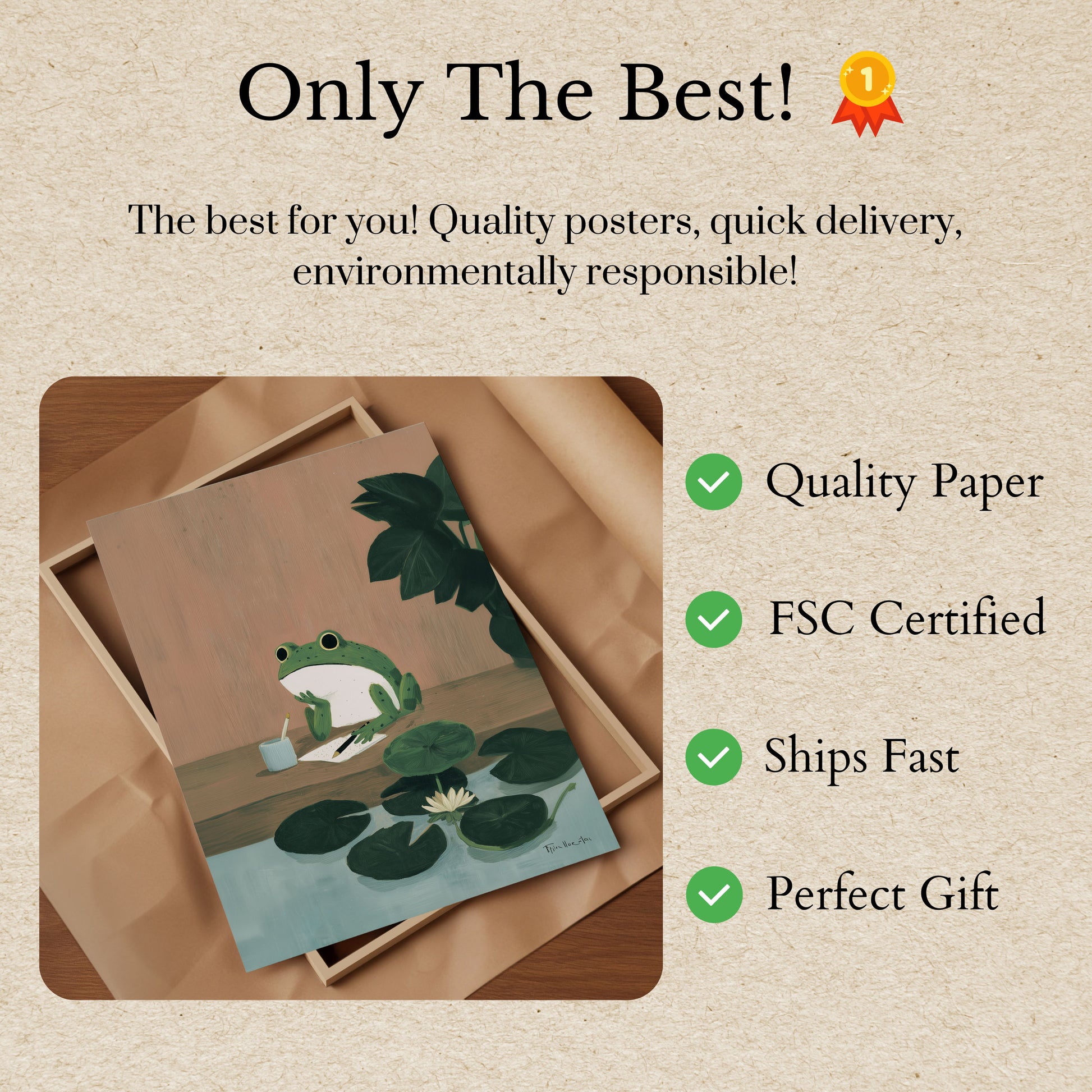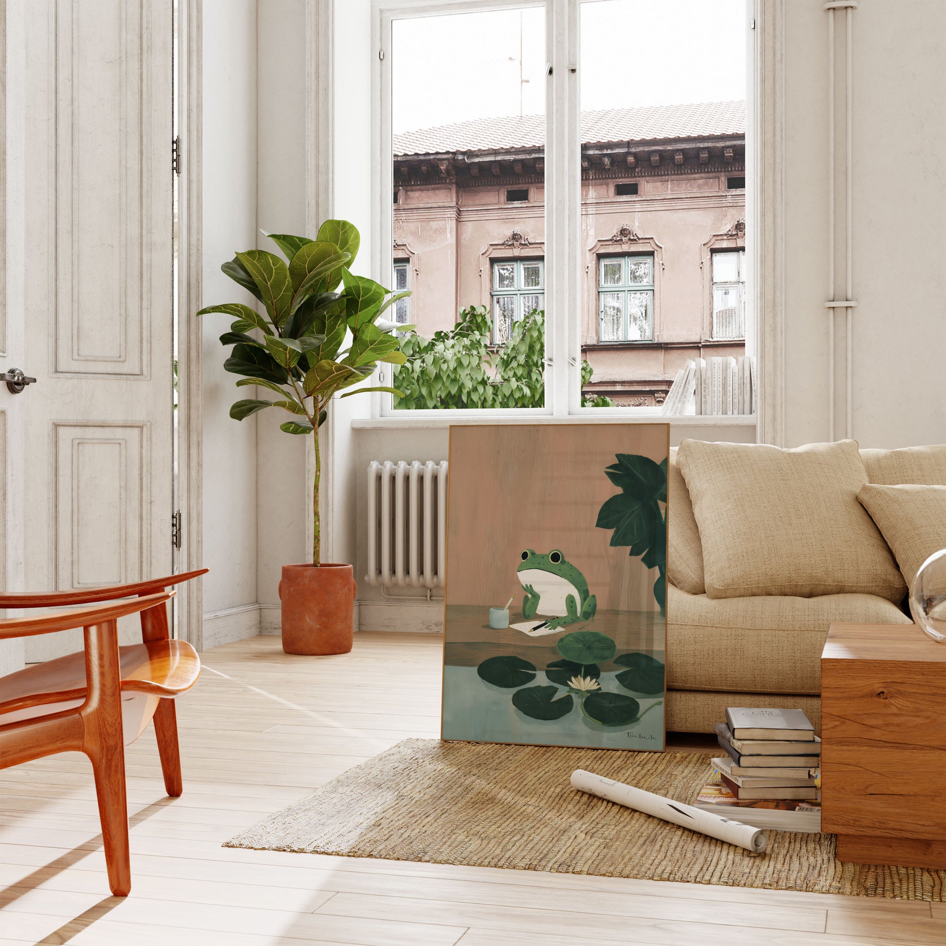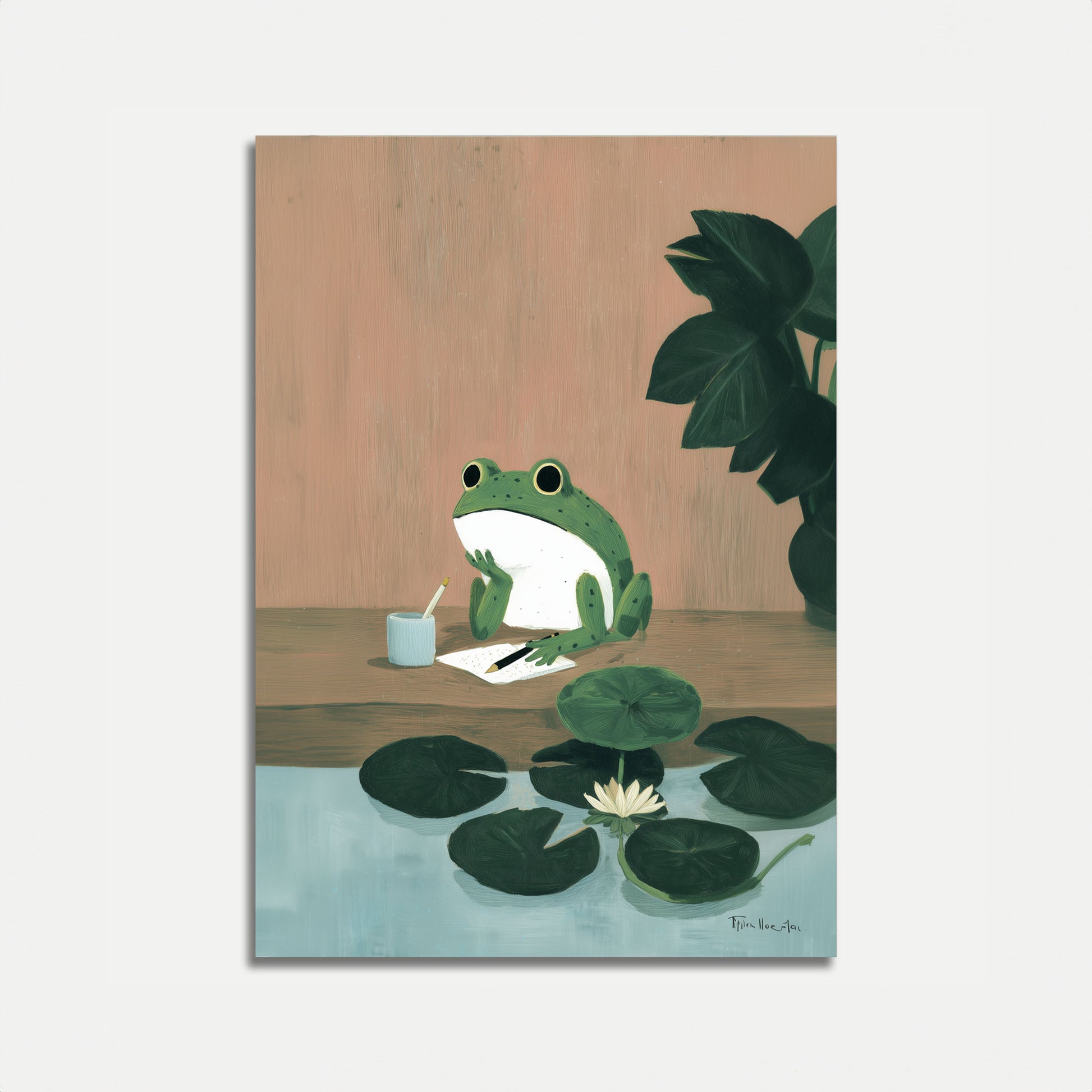 Esta encantadora ilustración captura una rana verde creativa sentada en un escritorio con un pincel en la mano, rodeada de un entorno de estanque sereno. El suave fondo beige cálido contrasta hermosamente con los tonos esmeralda vibrantes de la rana y los nenúfares, creando una atmósfera pacífica e inspiradora. Perfecta para añadir un toque de fantasía y motivación inspirada en la naturaleza a cualquier habitación, este póster celebra la creatividad, la imaginación y la belleza del mundo natural con su estilo de arte contemporáneo y gentil.