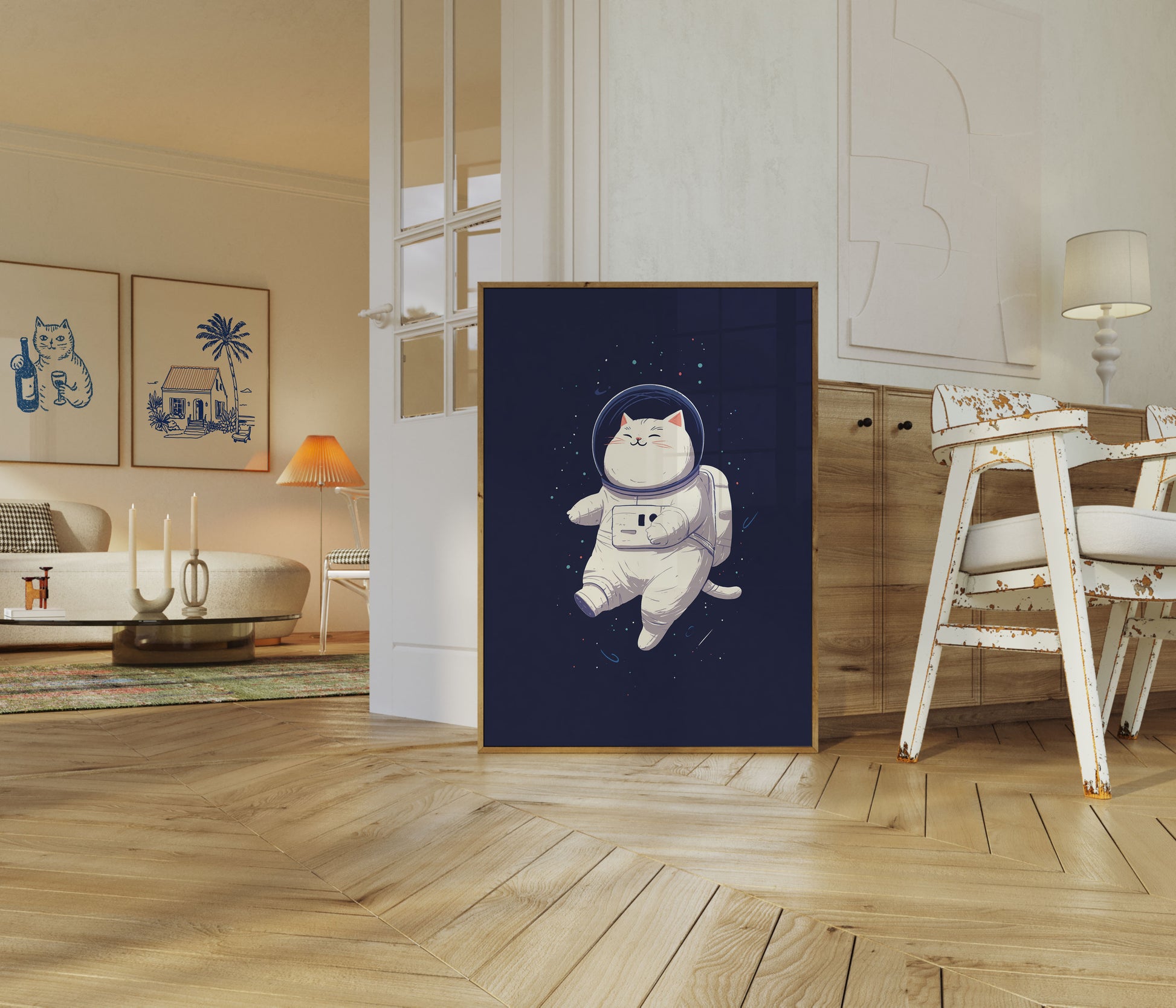 ¡Conoce al explorador espacial más adorable que hayas visto! Esta encantadora ilustración presenta un gato blanco regordete flotando a través del cosmos, completamente equipado con un traje de astronauta y casco. El fondo celestial está lleno de estrellas titilantes, planetas coloridos y polvo cósmico, creando una atmósfera onírica que es tanto juguetona como pacífica. La expresión contenta del gato y su postura relajada capturan la maravilla de la exploración espacial, haciendo que esta sea la pieza perfecta para cualquiera que ame a los gatos, el espacio o las deliciosas aventuras cósmicas. Ya sea que estés decorando un dormitorio, oficina o habitación infantil, esta obra de arte única aporta alegría, imaginación y un toque de capricho a cualquier espacio.