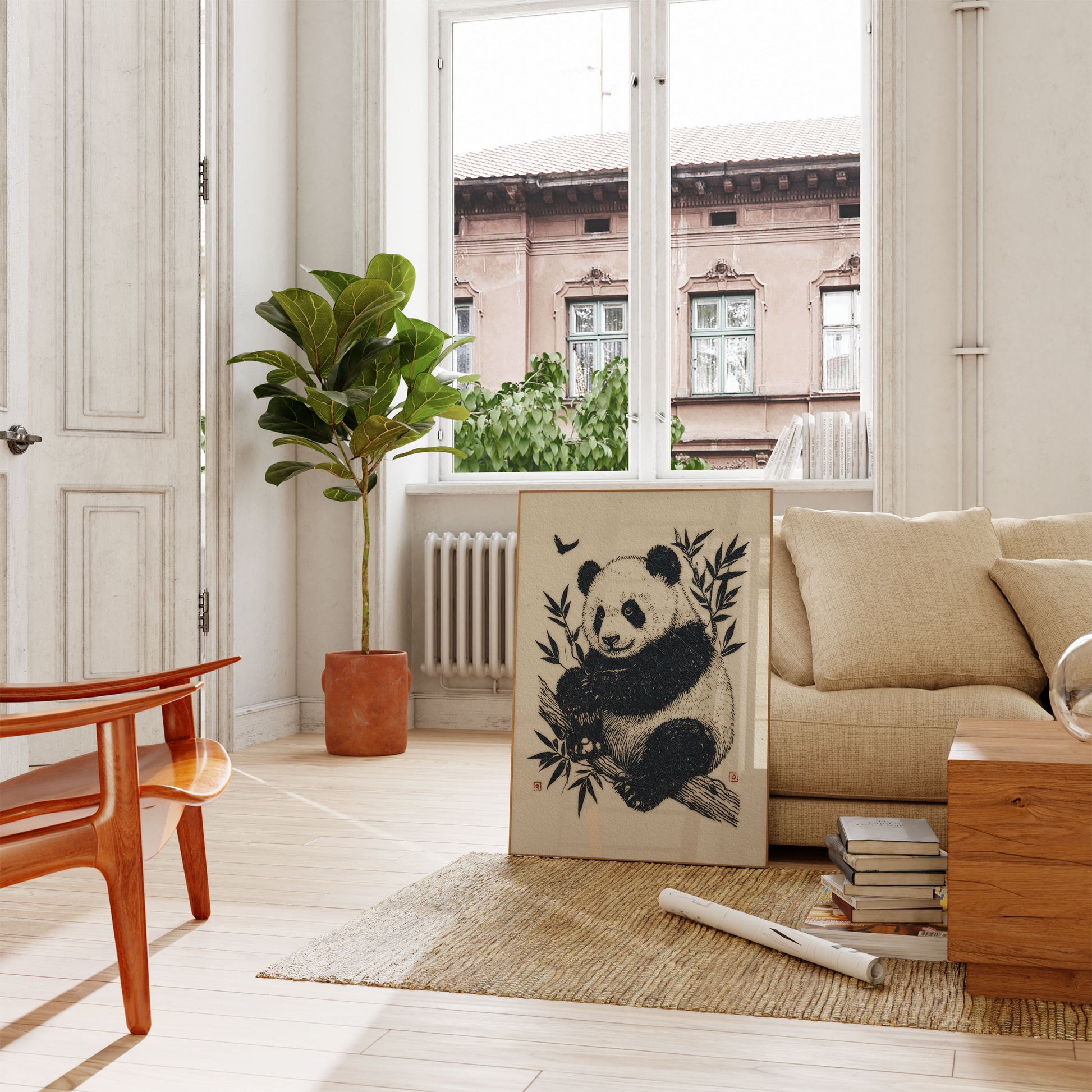 Sumérgete en esta impresionante ilustración xilográfica en blanco y negro de un majestuoso panda acurrucado entre delicadas hojas de bambú. El intrincado trazo captura la delicada esencia de este querido oso, con ricas texturas que aportan profundidad y carácter a cada detalle. Un pájaro sereno revolotea cerca, aportando un toque de movimiento a esta cautivadora obra de arte de la vida silvestre.