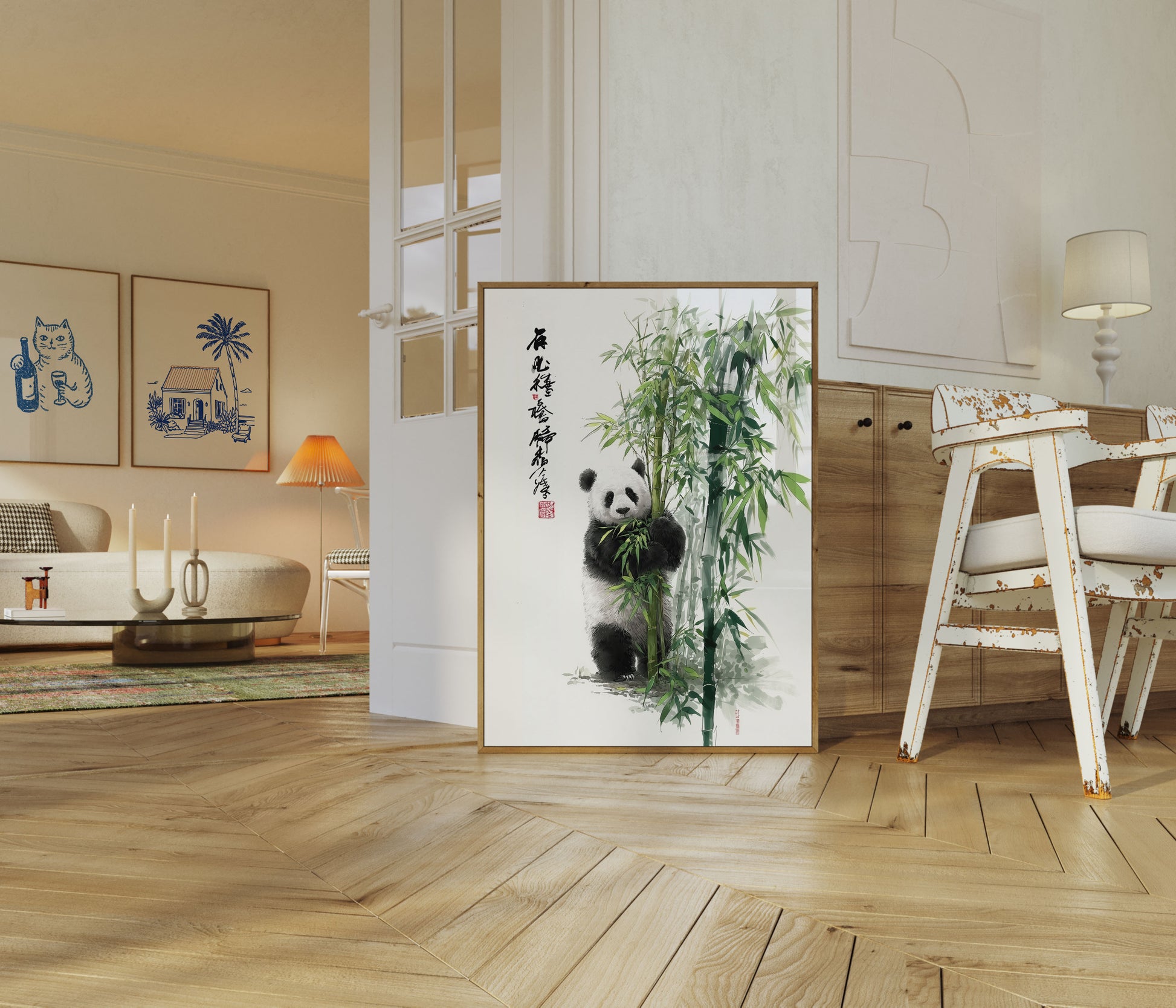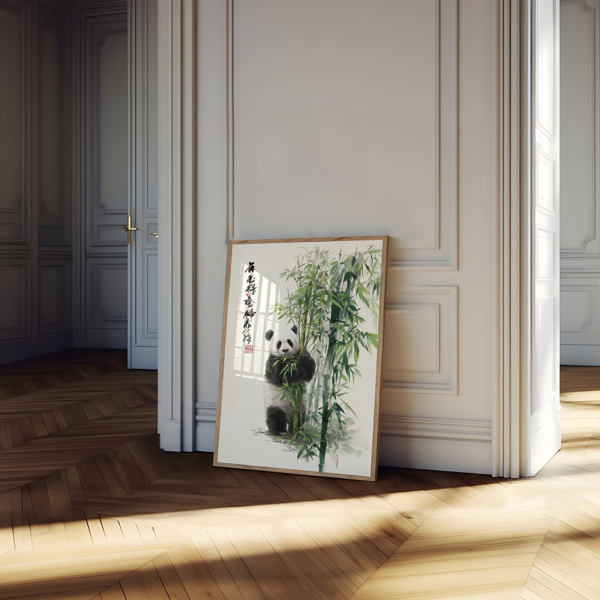 Sumérgete en la serenidad del mundo de un panda gigante, anidado entre exuberantes tallos de bambú, en esta exquisita acuarela china. Los delicados tonos verdes y grises crean una atmósfera tranquila, capturando la apacible naturaleza de esta querida especie en peligro de extinción en su hábitat natural. Cada pincelada aporta profundidad y emoción a esta impresionante ilustración inspirada en la naturaleza, invitando al espectador a detenerse y apreciar la belleza de la vida silvestre.