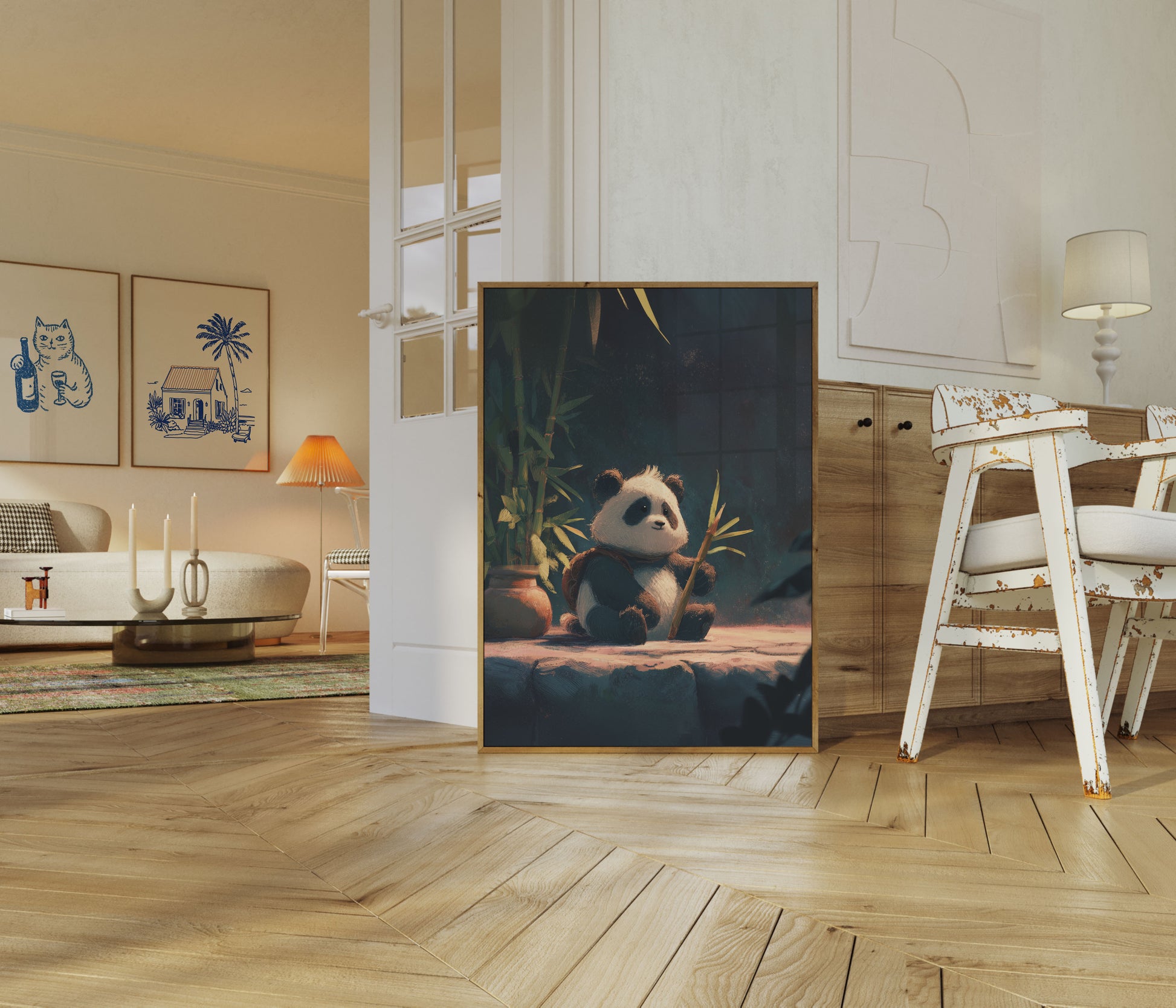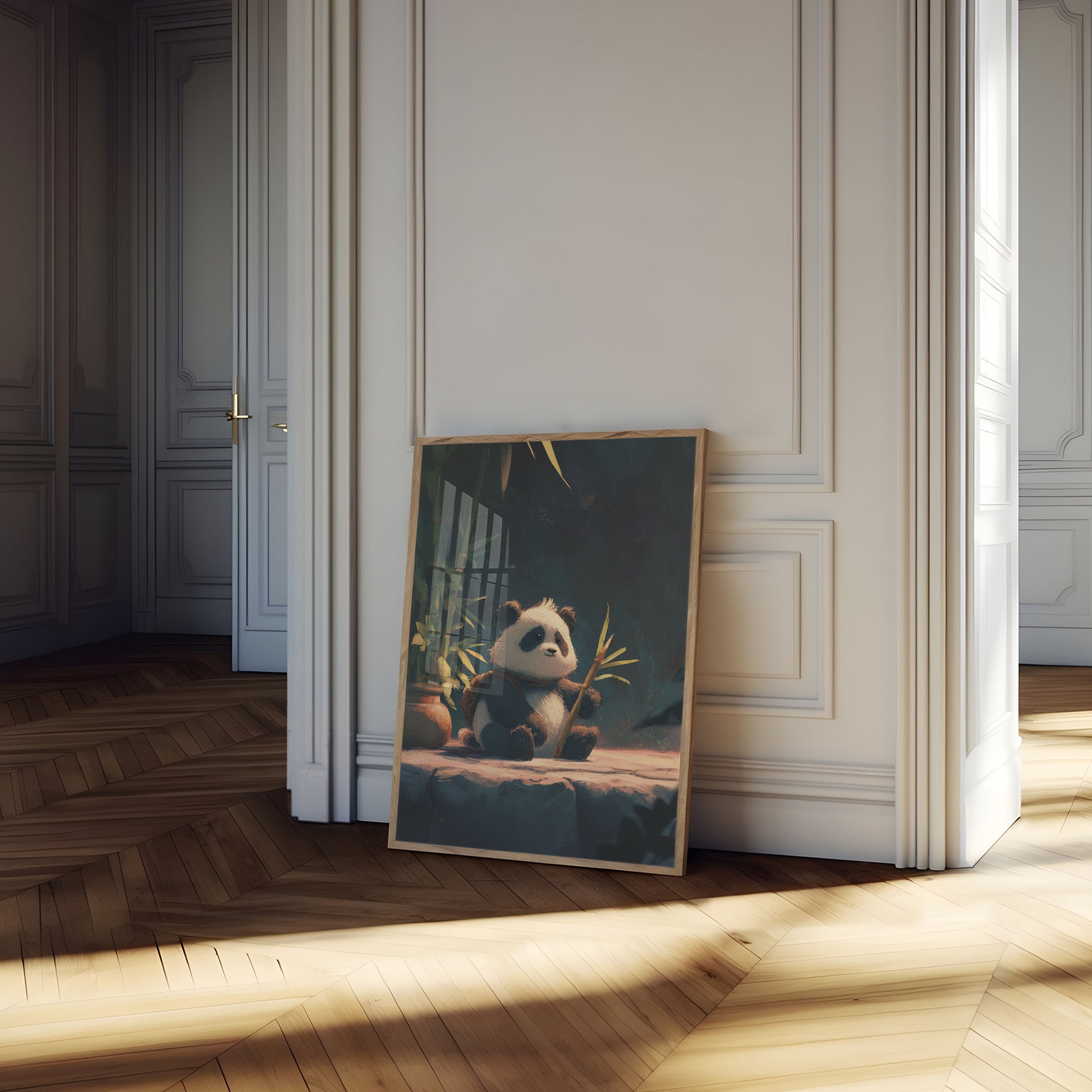 Una encantadora ilustración de un esponjoso oso panda acurrucado entre vibrantes tallos de bambú, irradiando calidez y tranquilidad. La obra captura el espíritu apacible de esta querida criatura con pinceladas suaves y texturizadas y un fondo evocador y evocador que evoca los frondosos bosques de China. Los colores intensos y tenues crean una sensación de intimidad y serena contemplación en este encantador retrato animal.
