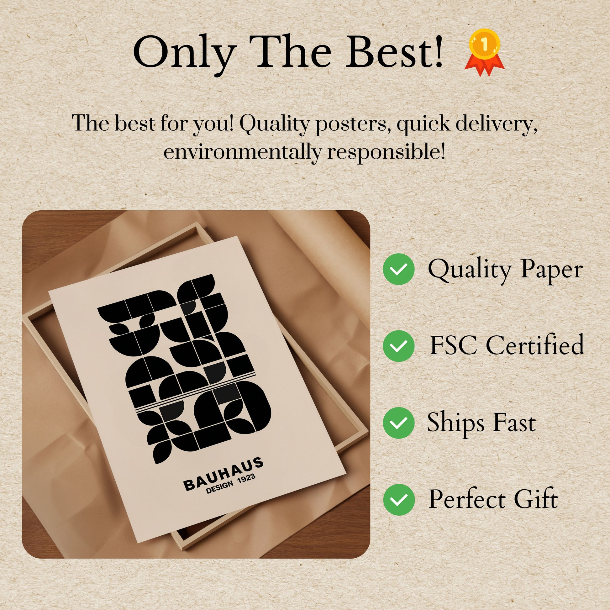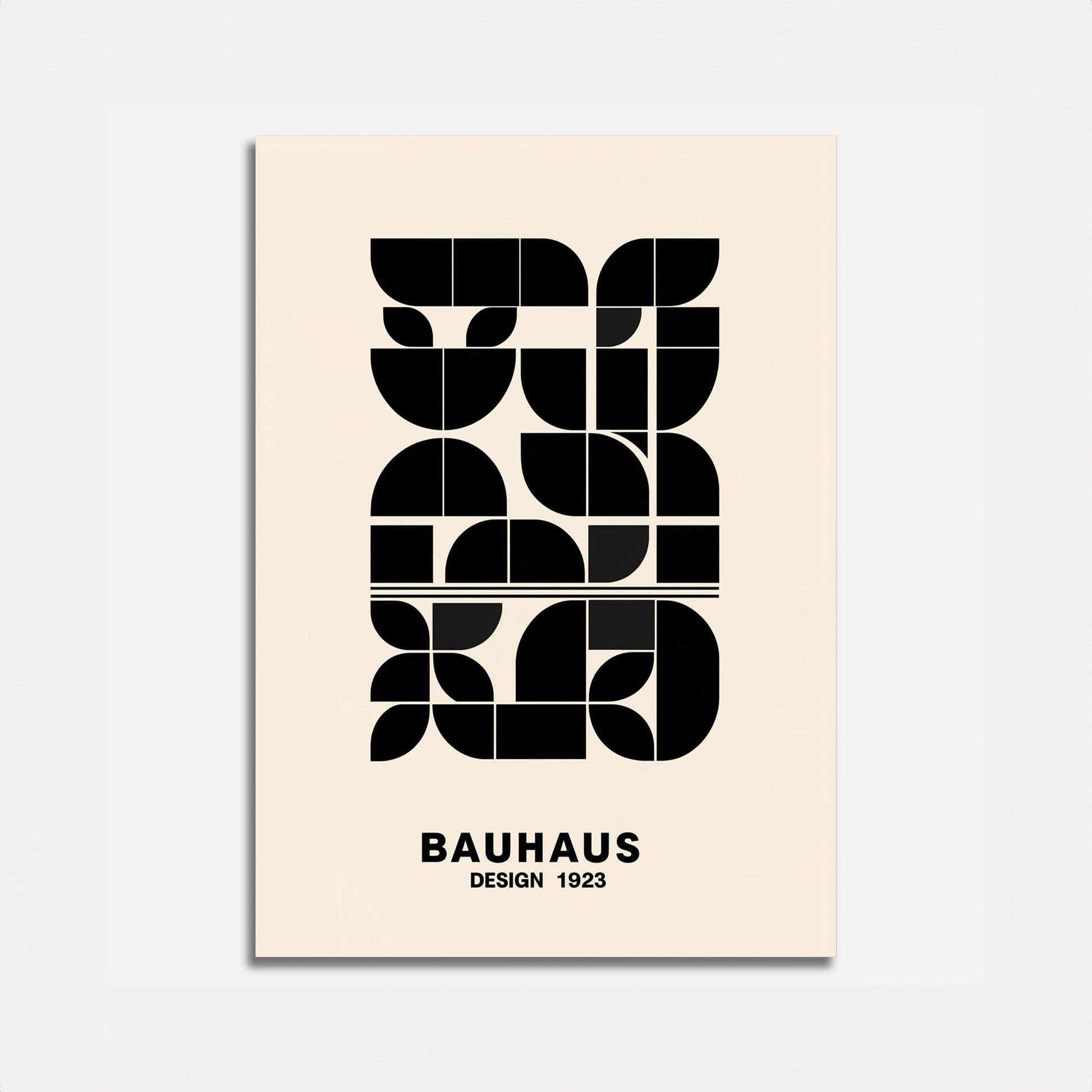 Step into the revolutionary world of 1920s design with this iconic Bauhaus poster. Featuring a mesmerizing composition of black geometric shapes against a cream background, this artwork captures the essence of modernist design principles. Bold, segmented quarter-circles and rectangles create a rhythmic, symmetrical pattern that exemplifies the Bauhaus movement's commitment to form, function, and visual harmony.