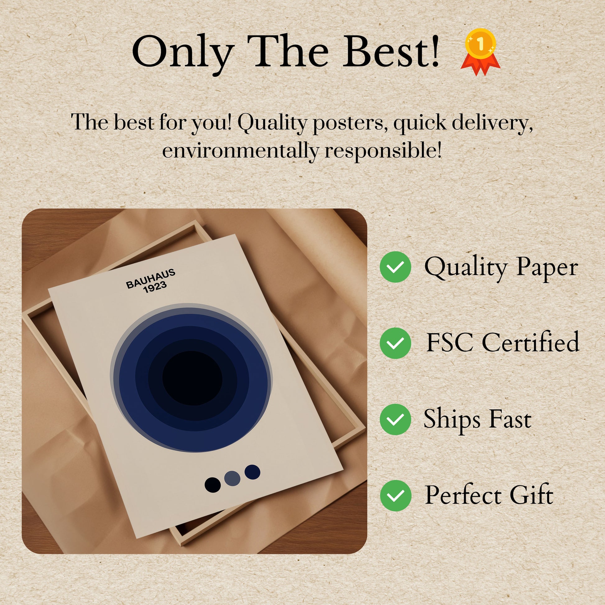Dive into the mesmerizing world of Bauhaus design with this iconic 1923 circular composition. The poster features concentric circles in deep, layered shades of blue, creating a hypnotic visual rhythm that captures the essence of modernist minimalism. Each carefully graduated tone draws the eye towards the intense black center, embodying the Bauhaus philosophy of form follows function.