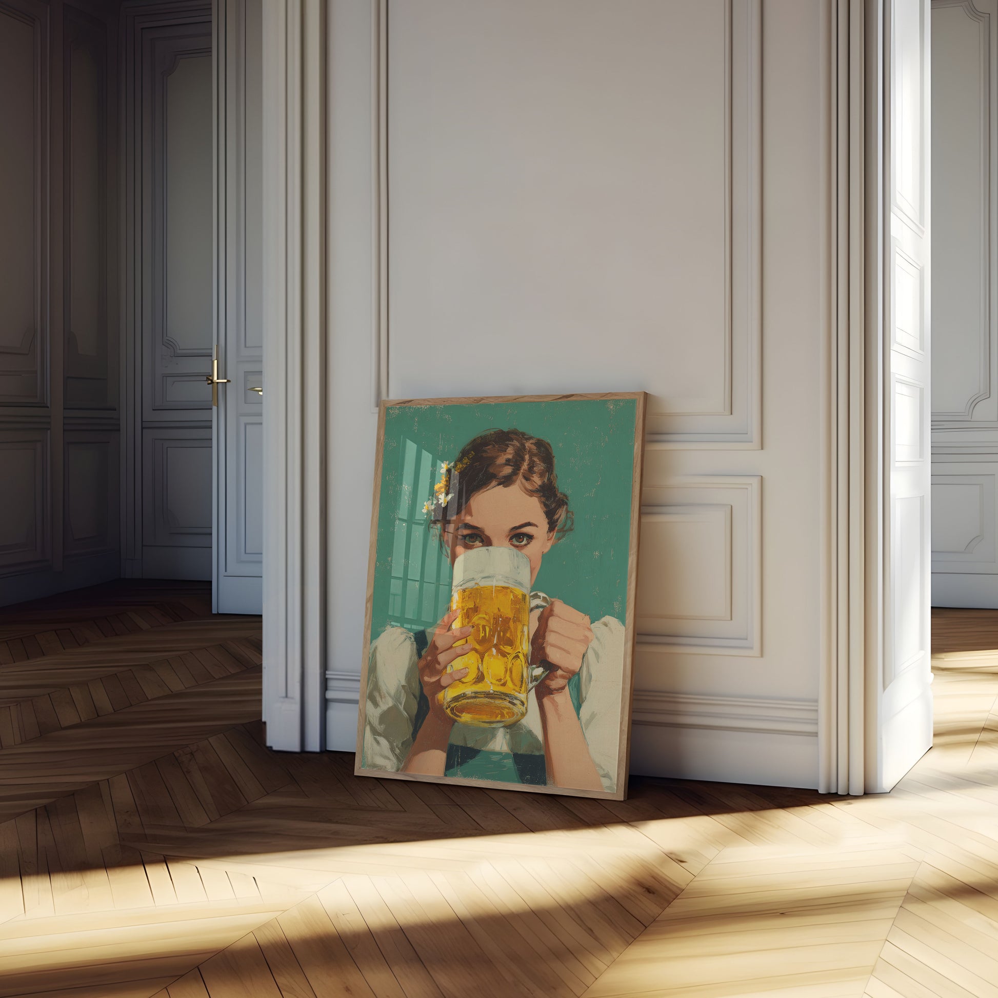 Step into a vibrant vintage scene of traditional Oktoberfest spirit, where a charming figure in a classic white blouse holds a frothy golden beer, adorned with delicate flowers in her hair. The rich turquoise background creates a striking contrast, highlighting the warmth and joy of beer culture with an artistic, nostalgic touch that captures the essence of Bavarian hospitality.