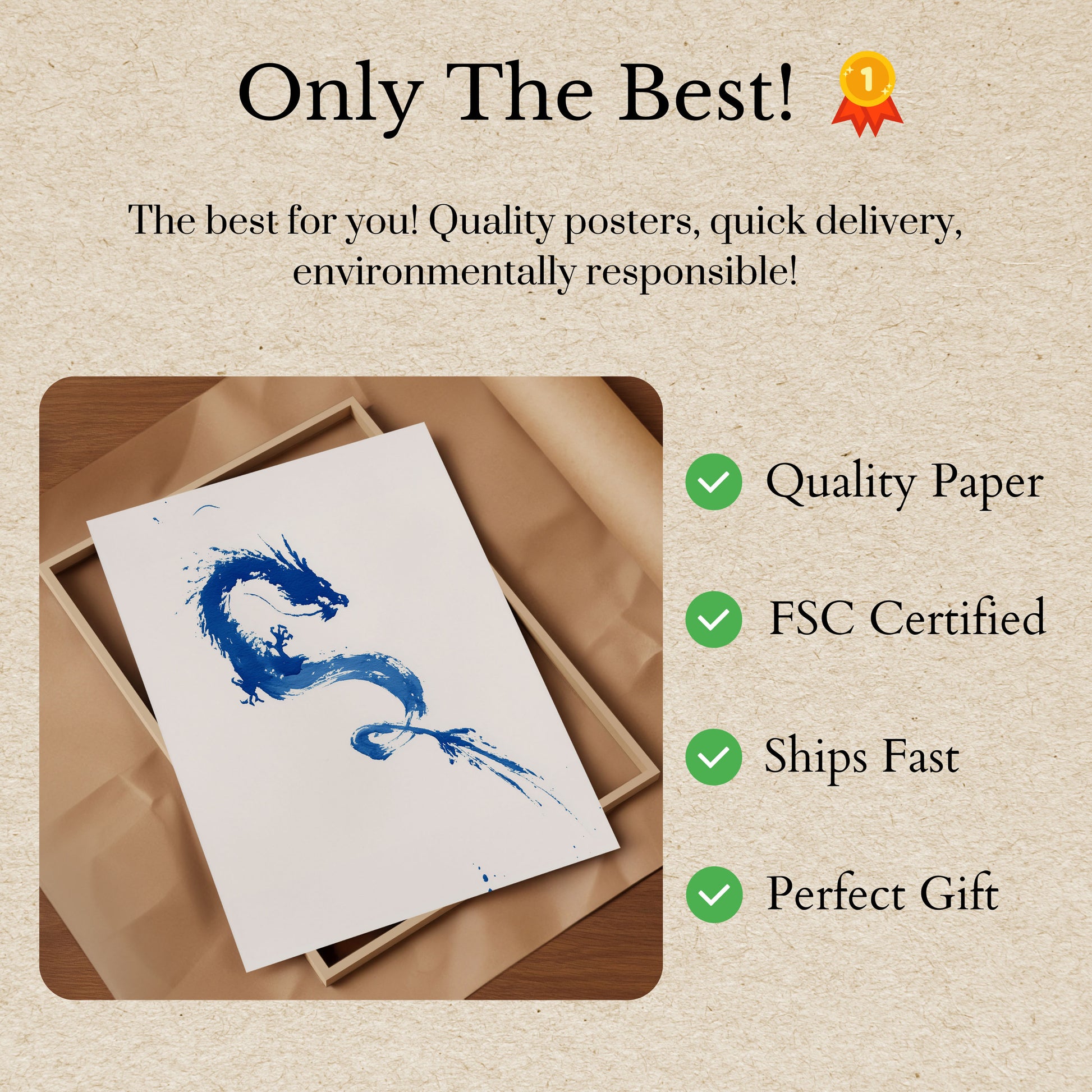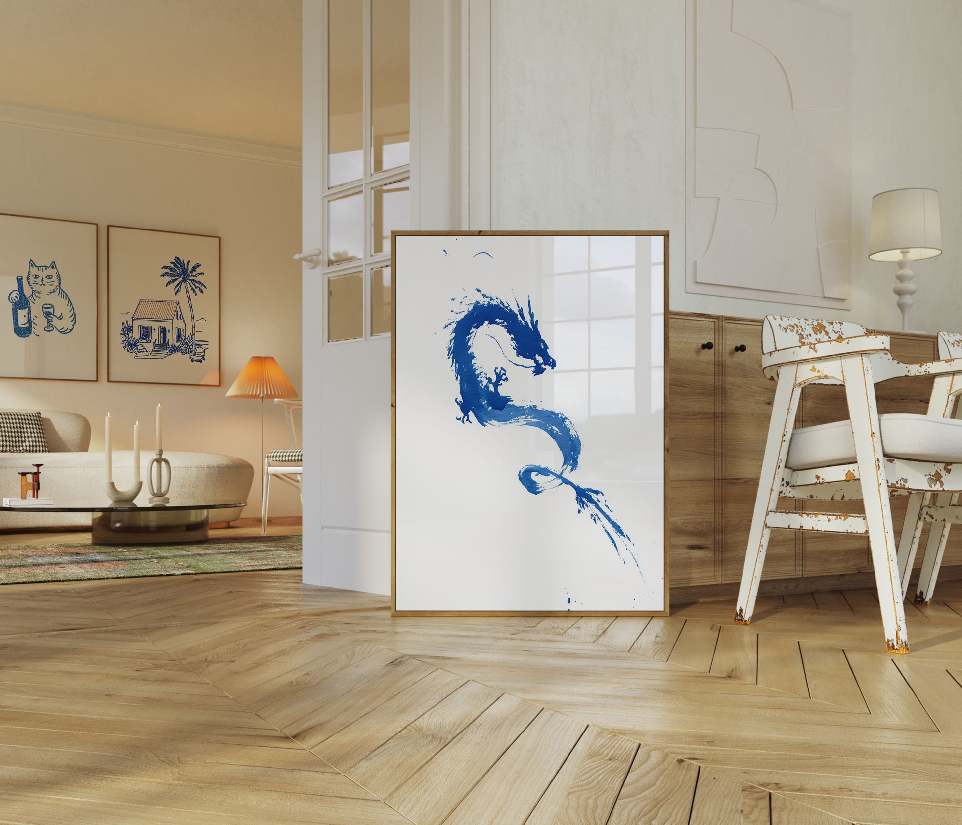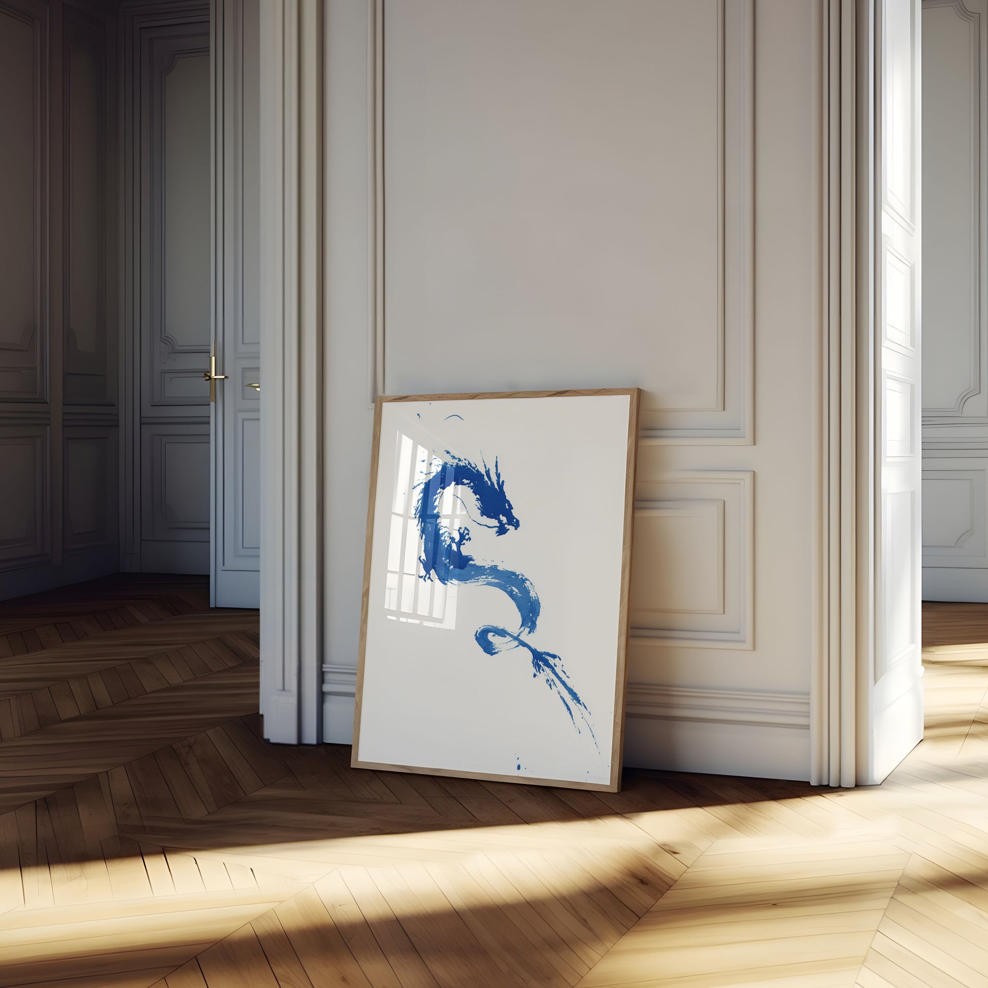 Sumérgete en el mundo místico de esta impresionante obra de arte de un dragón azul, donde las pinceladas fluidas capturan la fuerza bruta y la gracia etérea de una criatura mítica. Los vibrantes tonos azules danzan sobre el lienzo blanco, creando una silueta dinámica y cautivadora que parece saltar y girar con una energía increíble. Este diseño abstracto de dragón aporta movimiento, pasión y espíritu indomable a cualquier espacio.