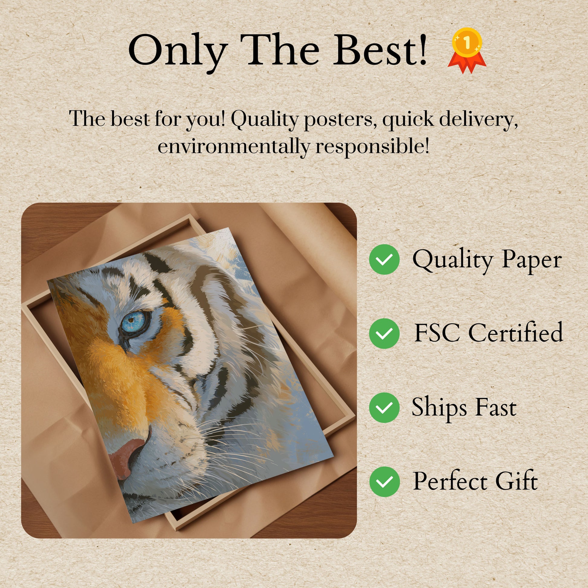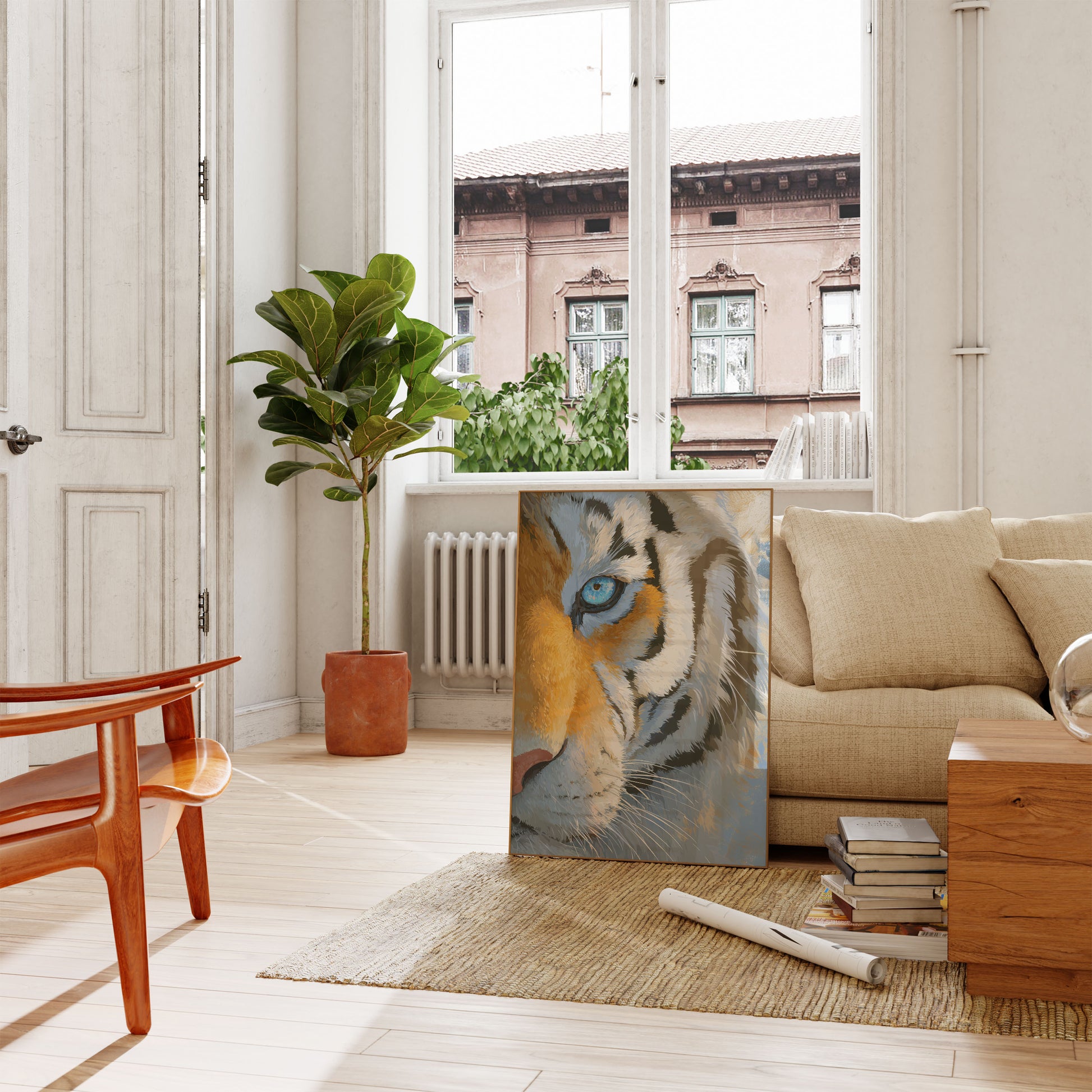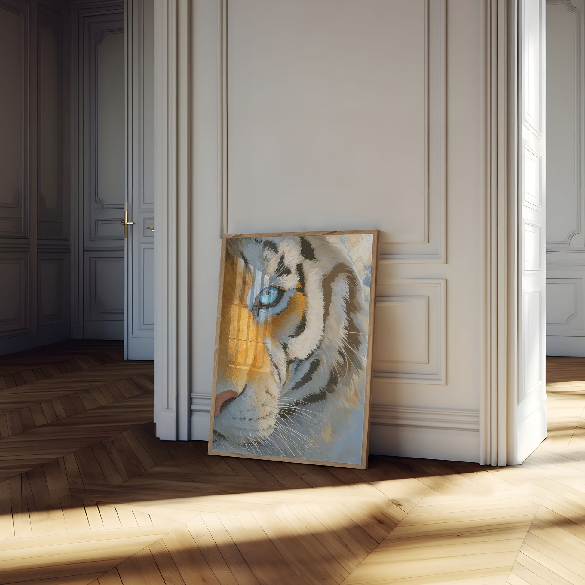 Sumérgete en la cautivadora mirada de este impresionante retrato de tigre, donde vibrantes tonos dorados y anaranjados se funden a la perfección con el fresco pelaje azul y blanco. El penetrante ojo azul captura la emoción pura y la fuerza salvaje, sumergiéndote en los intrincados detalles del alma de esta magnífica criatura. Cada pincelada revela la compleja belleza y el espíritu indómito del tigre, creando una experiencia visual impresionante que cautiva la atención.