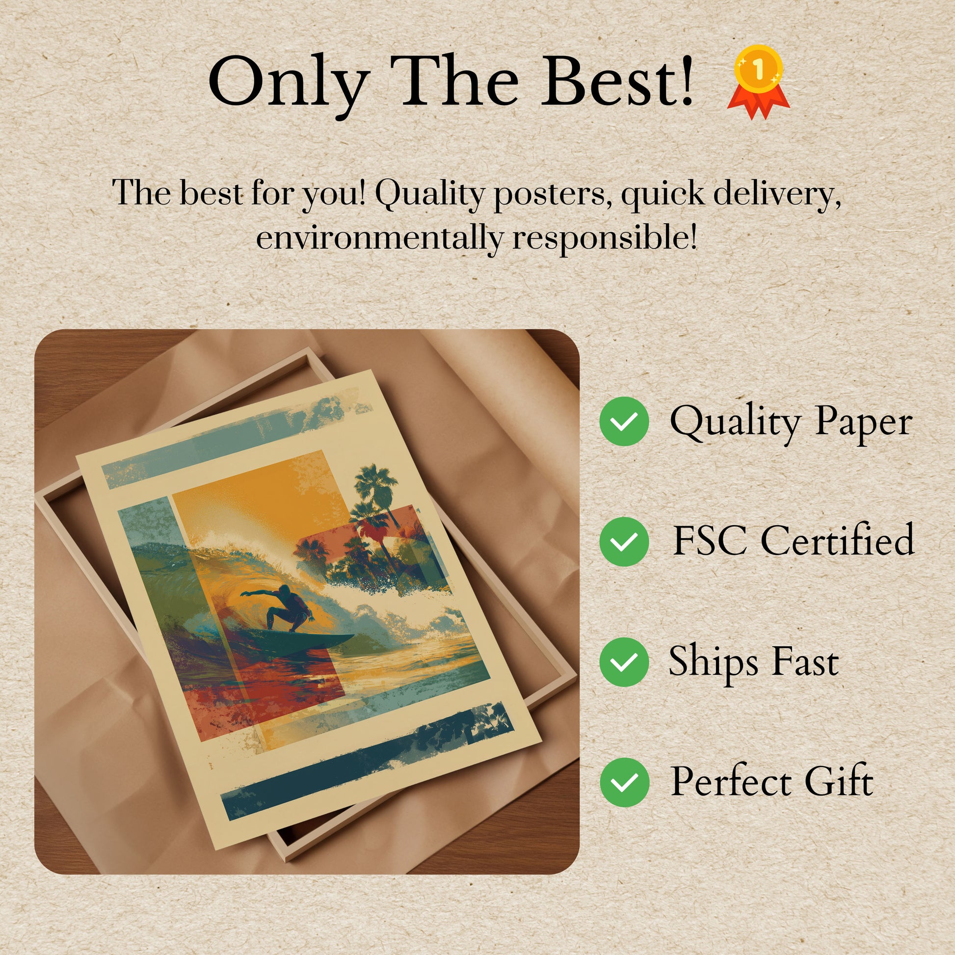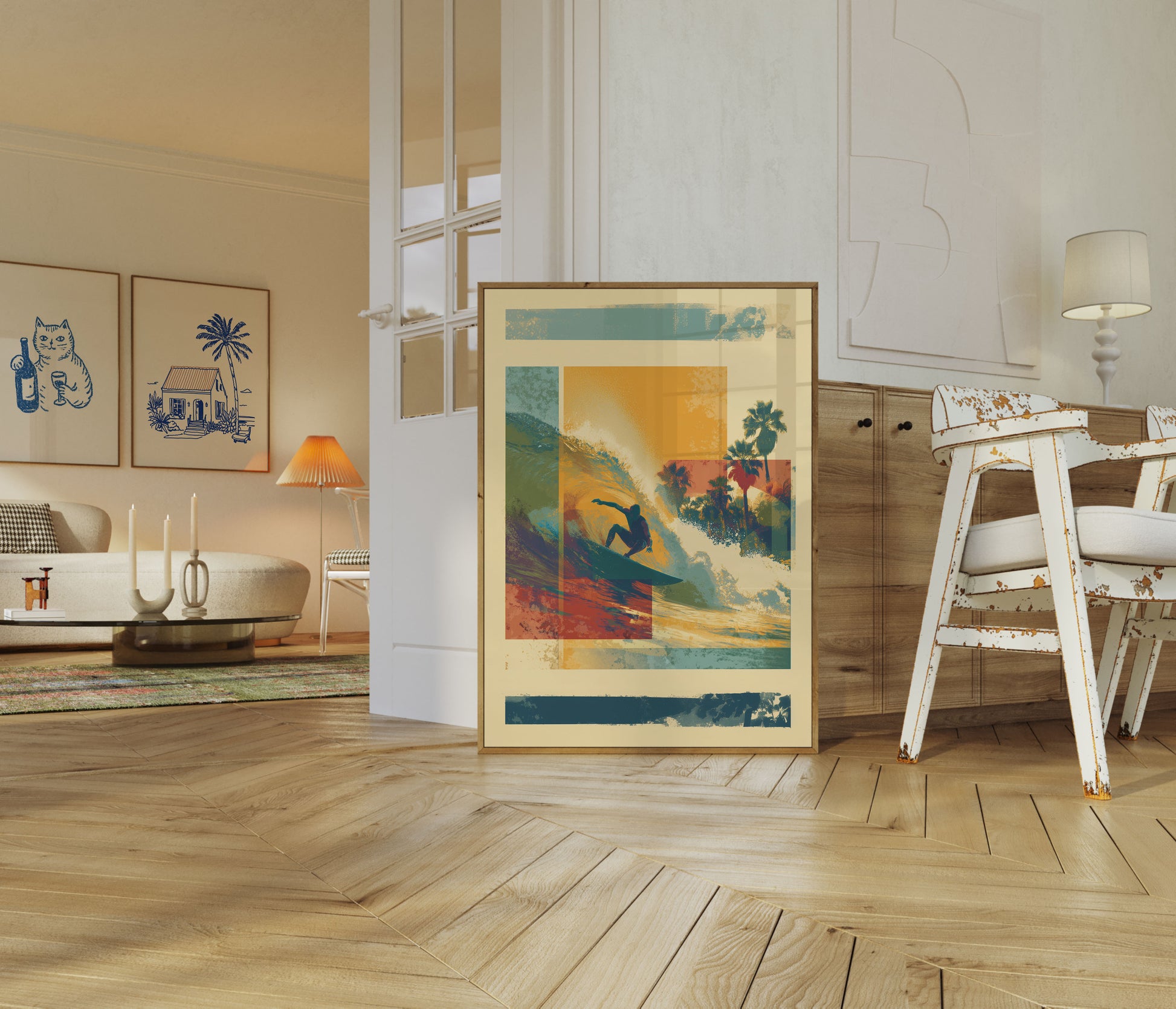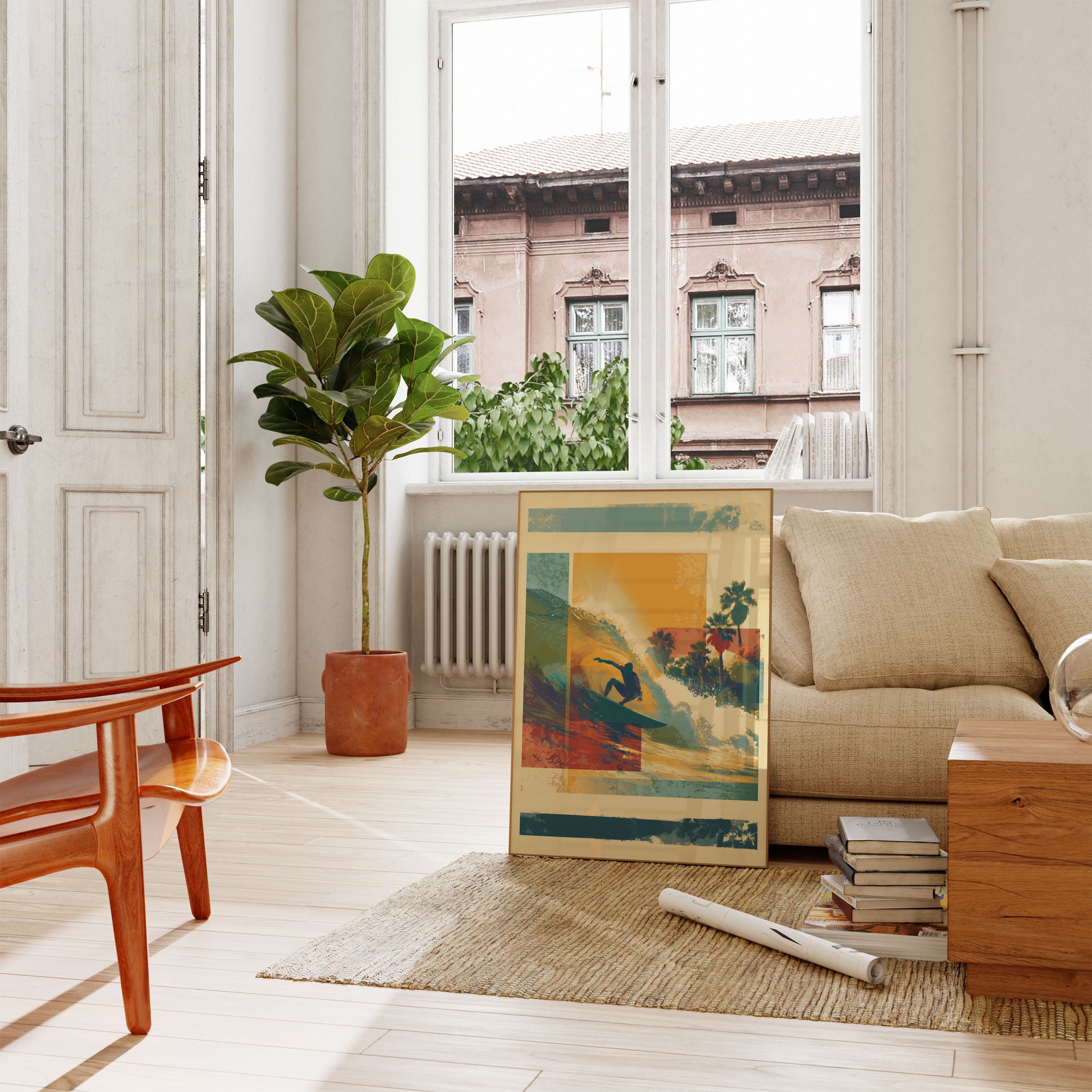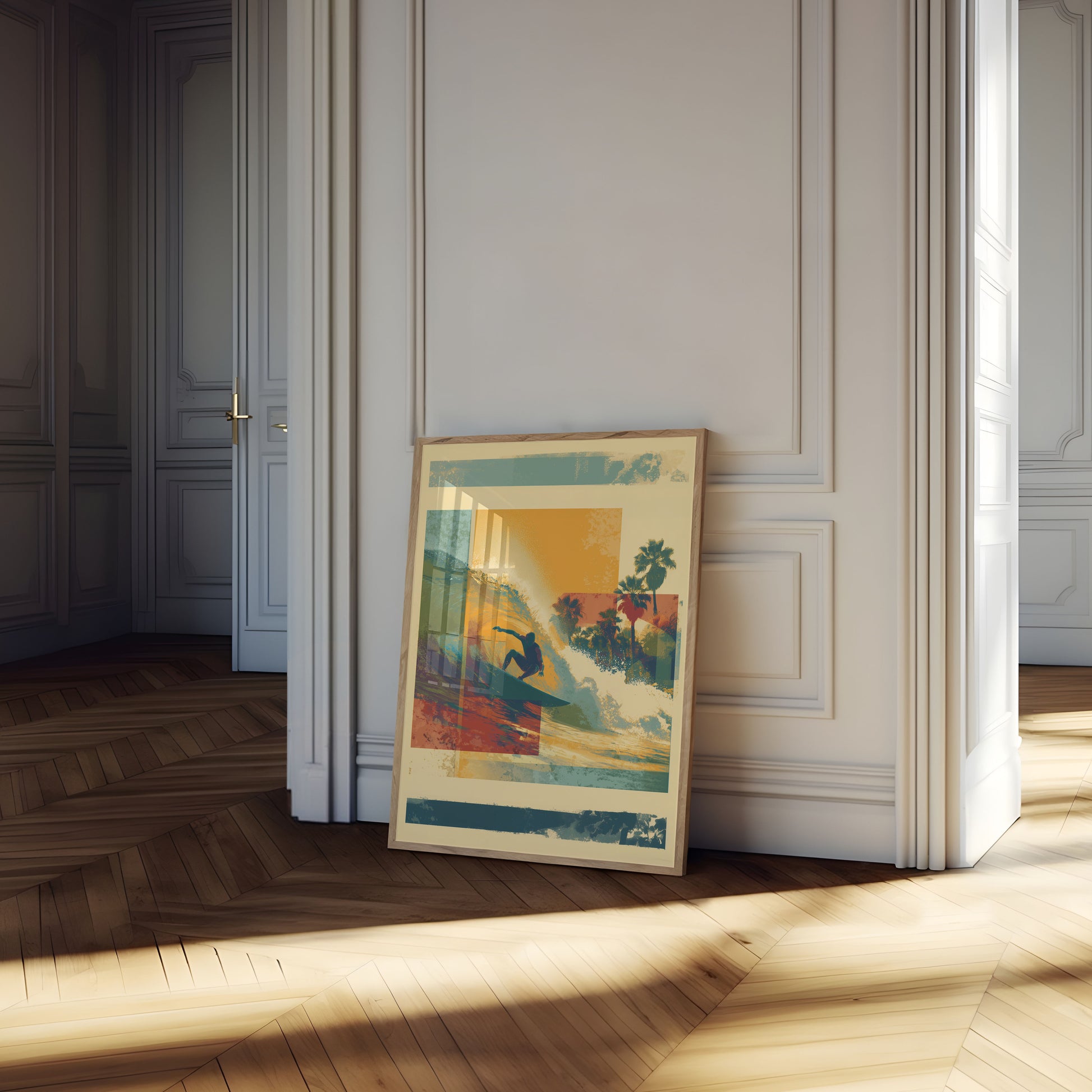 Sumérgete en el vibrante mundo del surf costero con esta impresionante composición artística que captura la esencia misma de surfear. Con una combinación de intensos tonos naranjas, verde azulado y cálidos tonos atardecer, la silueta del surfista cabalga con elegancia sobre una ola dinámica enmarcada por icónicas palmeras, creando un fascinante viaje visual a través de la cultura surfera de California. El diseño abstracto y texturizado transforma una escena clásica de surf en una impresionante obra de arte moderno que revitalizará cualquier espacio al instante.