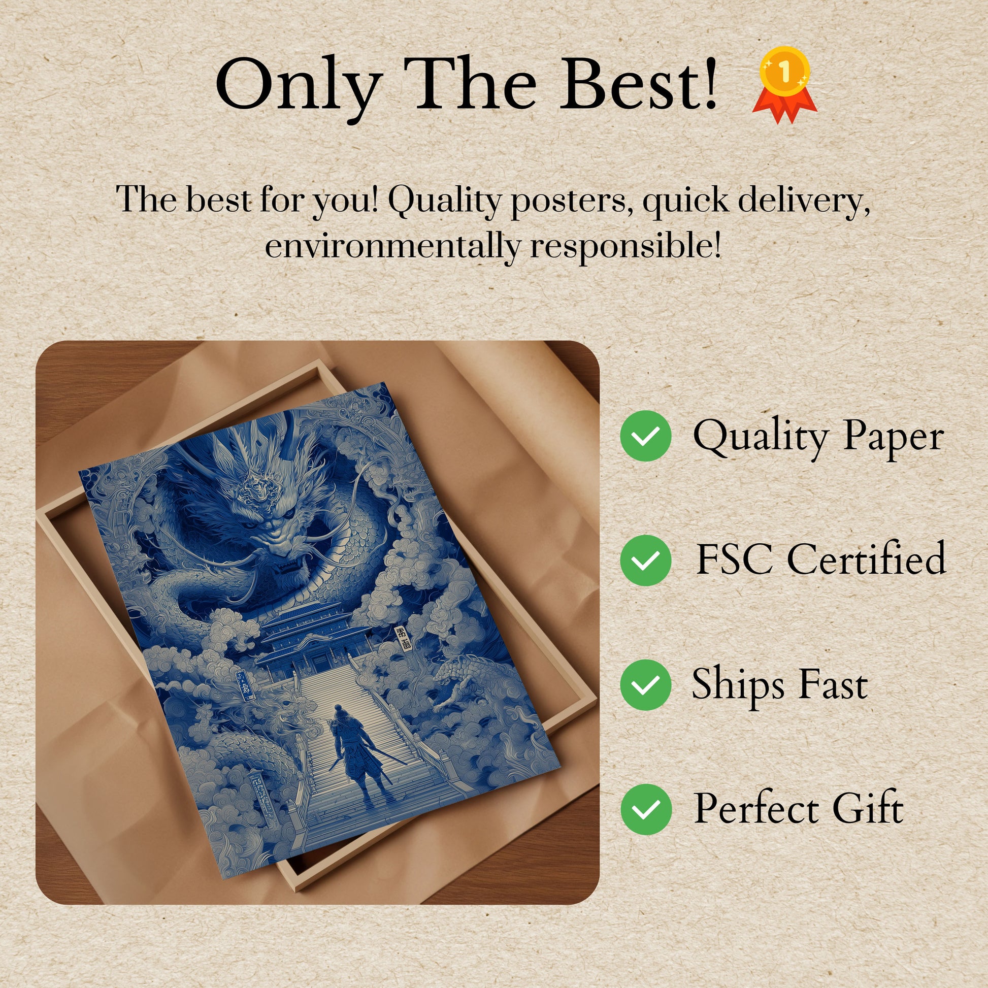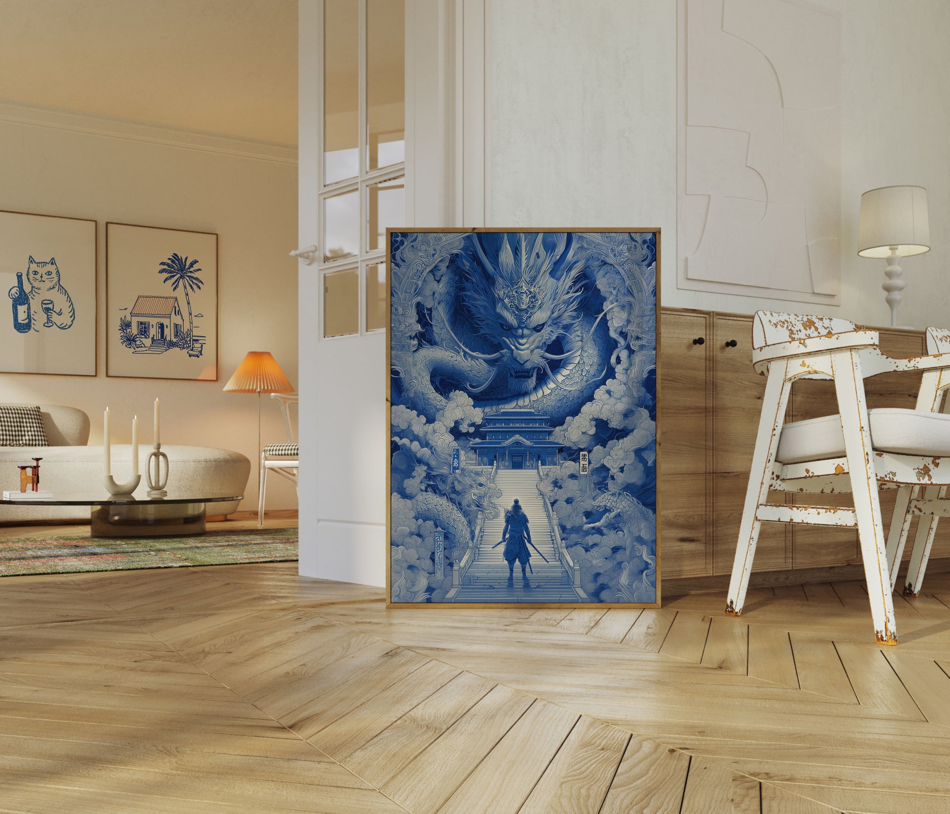 Sumérgete en una impresionante obra maestra en tonos azules donde un dragón etéreo se alza majestuoso sobre un antiguo templo asiático. La intrincada obra captura a un guerrero solitario subiendo escalones de piedra, rodeado de nubes arremolinadas y míticos guardianes serpentinos. Cada detalle intrincado narra una historia de poder, misticismo y belleza sobrenatural, creando un fascinante viaje visual que transporta al espectador a un reino entre la realidad y la leyenda.
