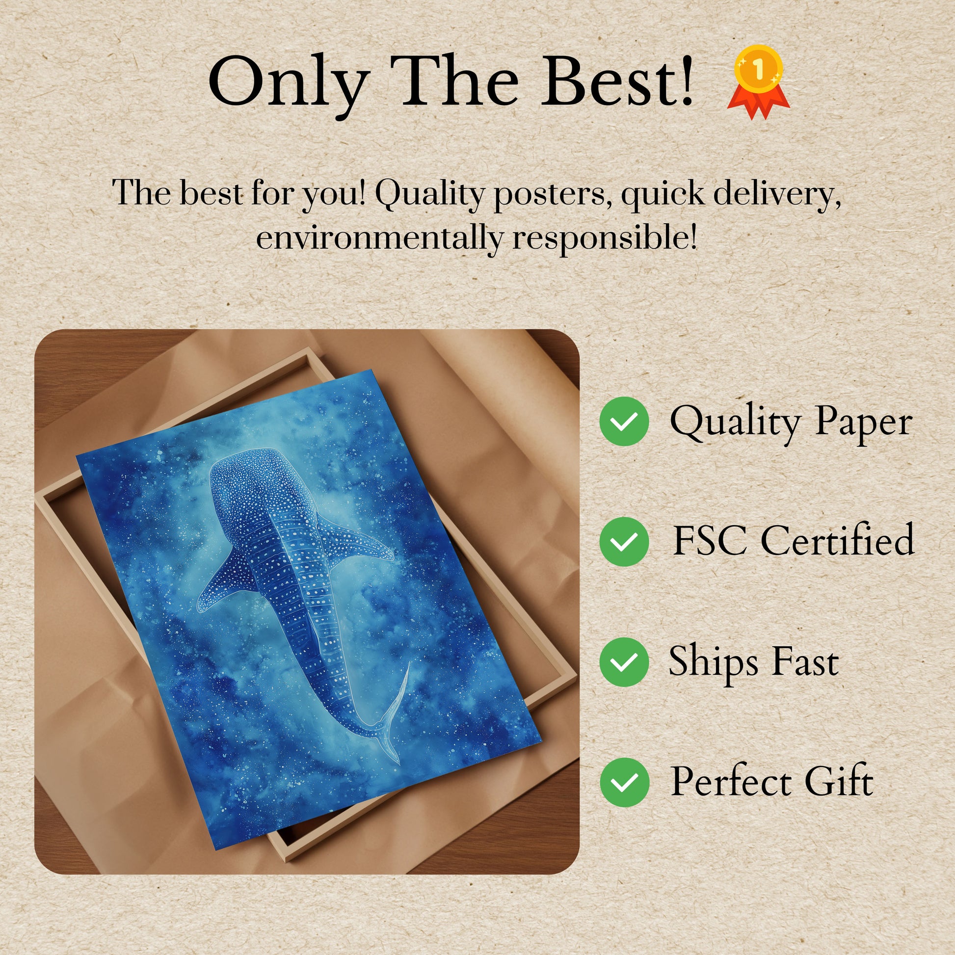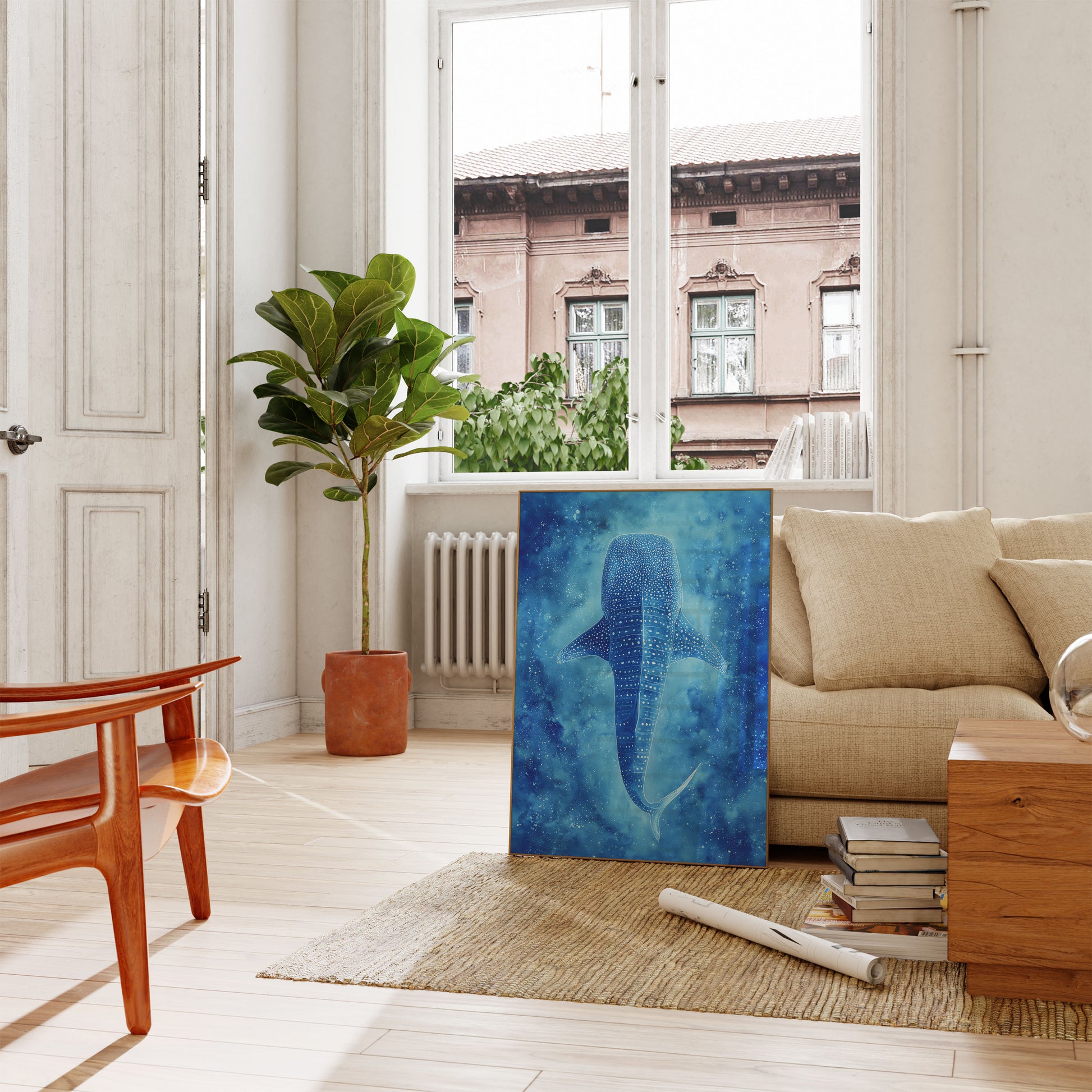 Dive into a mesmerizing underwater dreamscape where a majestic whale shark glides through a luminescent blue cosmos. Adorned with intricate white spots, the creature emerges from a starry background, creating an ethereal and tranquil visual journey that captures the mysterious beauty of marine life. The soft blue tones and delicate dot pattern evoke a sense of wonder and peaceful exploration.