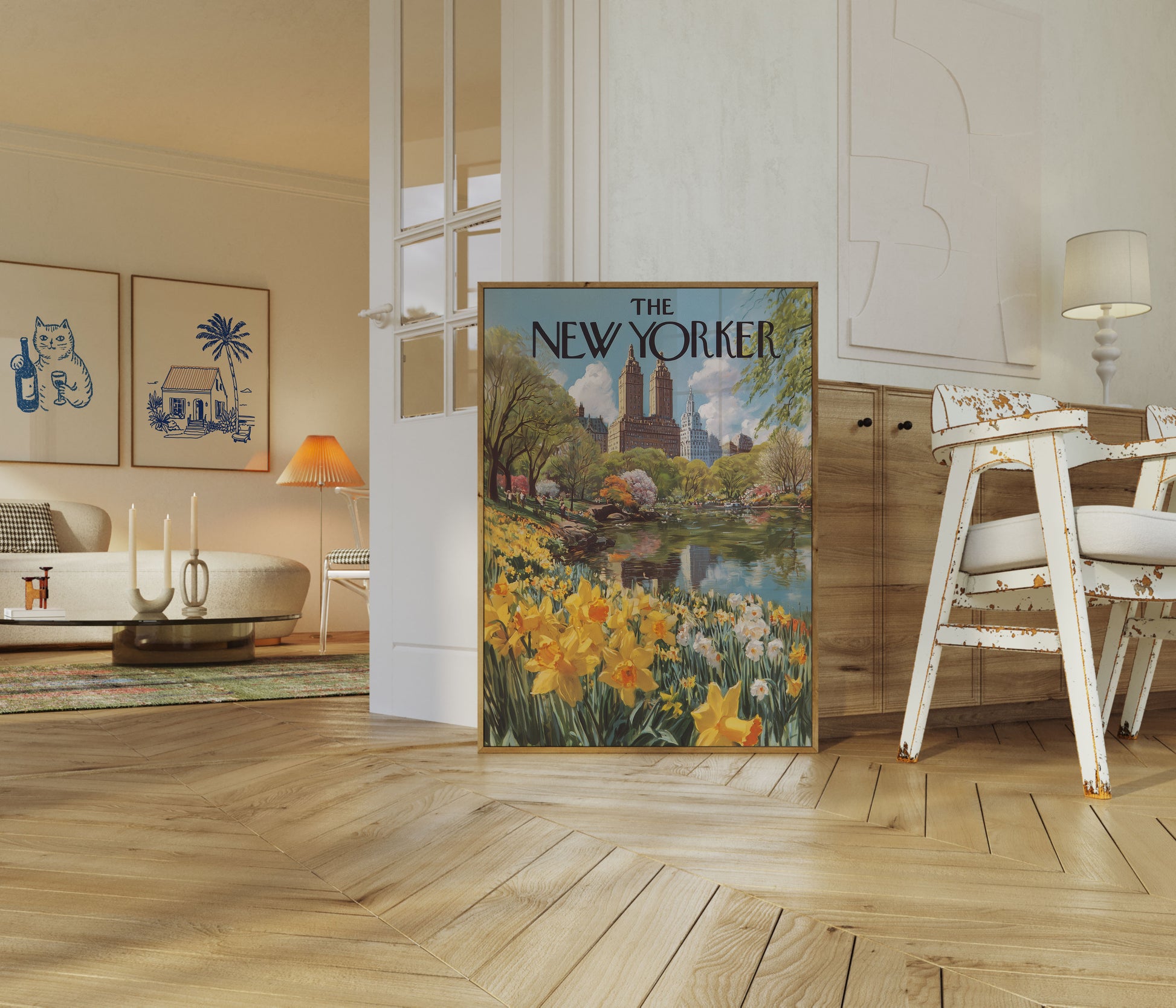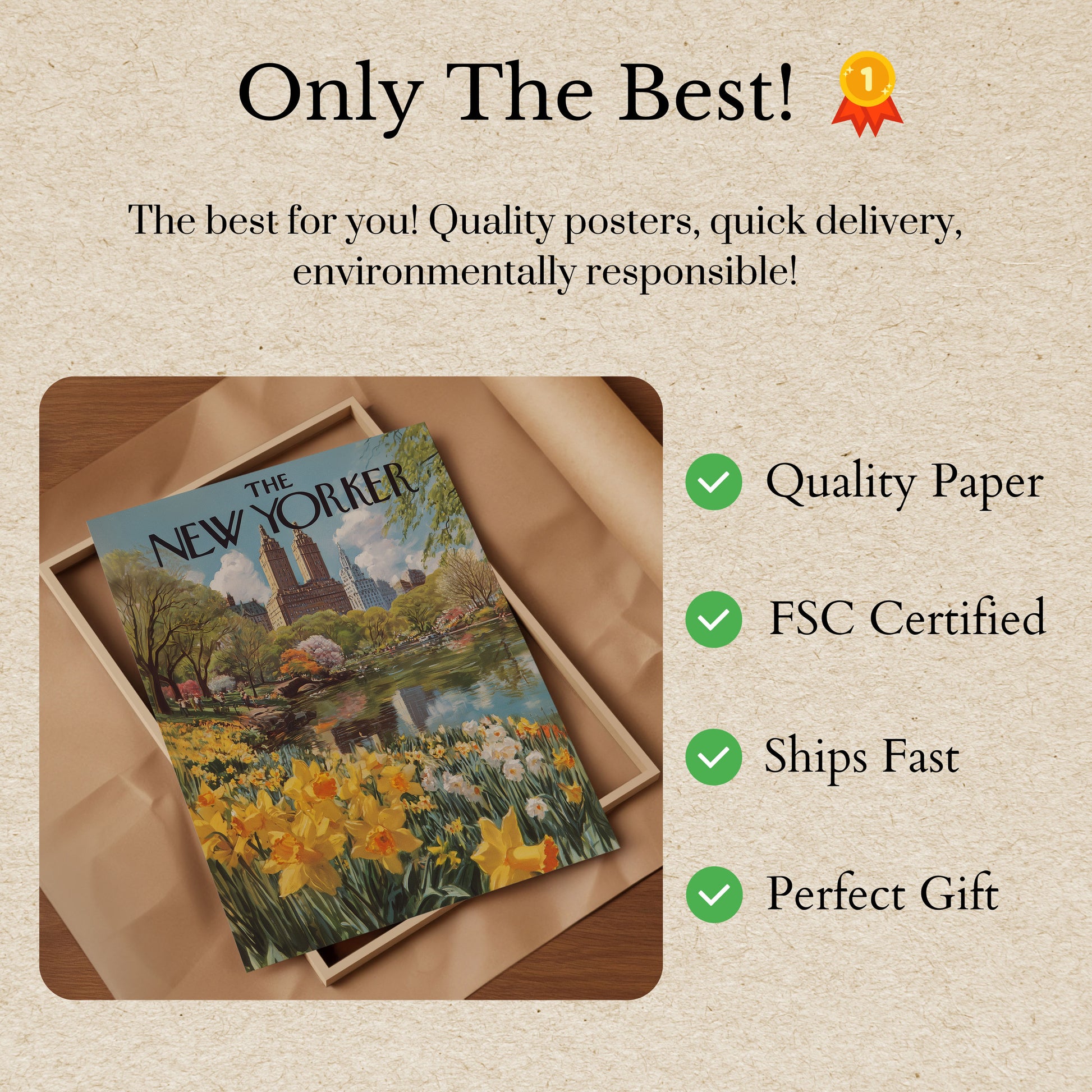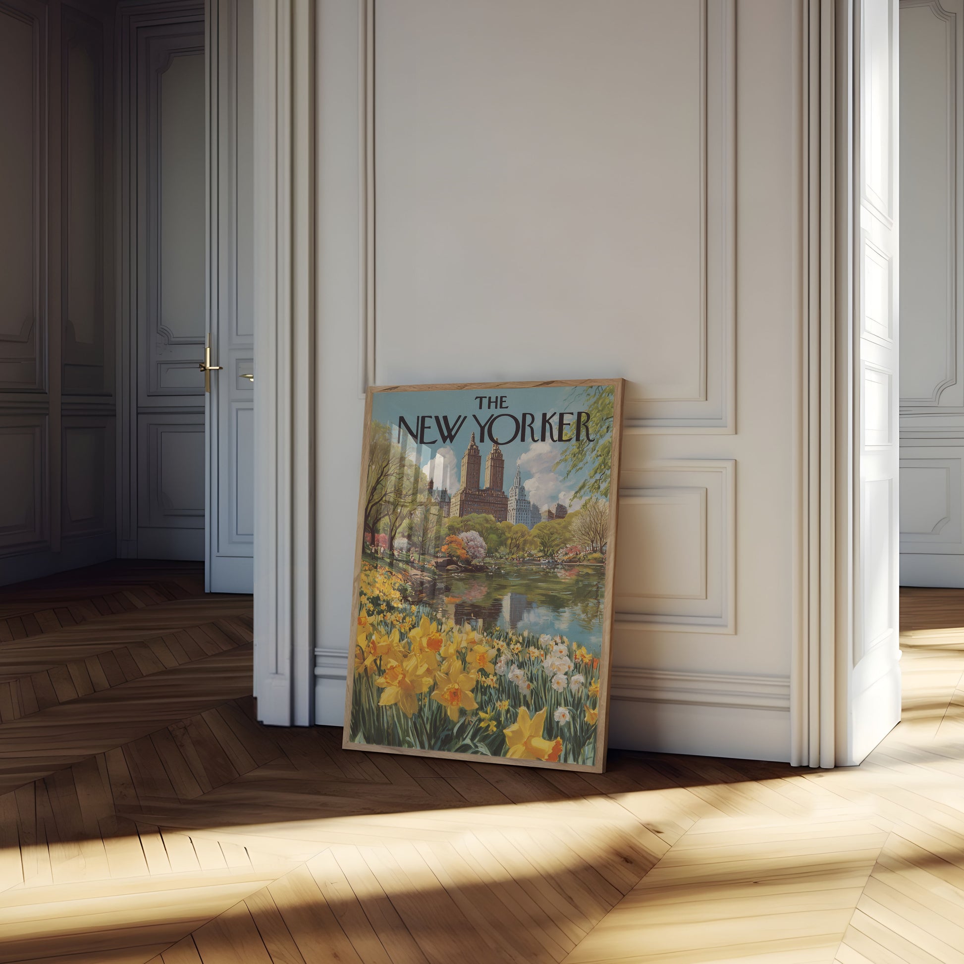 Experience the breathtaking beauty of New York City's iconic Central Park in full springtime bloom. This vintage New Yorker magazine cover poster captures a stunning landscape where vibrant yellow daffodils dance in the foreground, while the majestic twin towers and surrounding skyscrapers create a timeless urban backdrop. The serene lake reflects the lush greenery and soft clouds, inviting viewers into a moment of tranquil urban harmony.