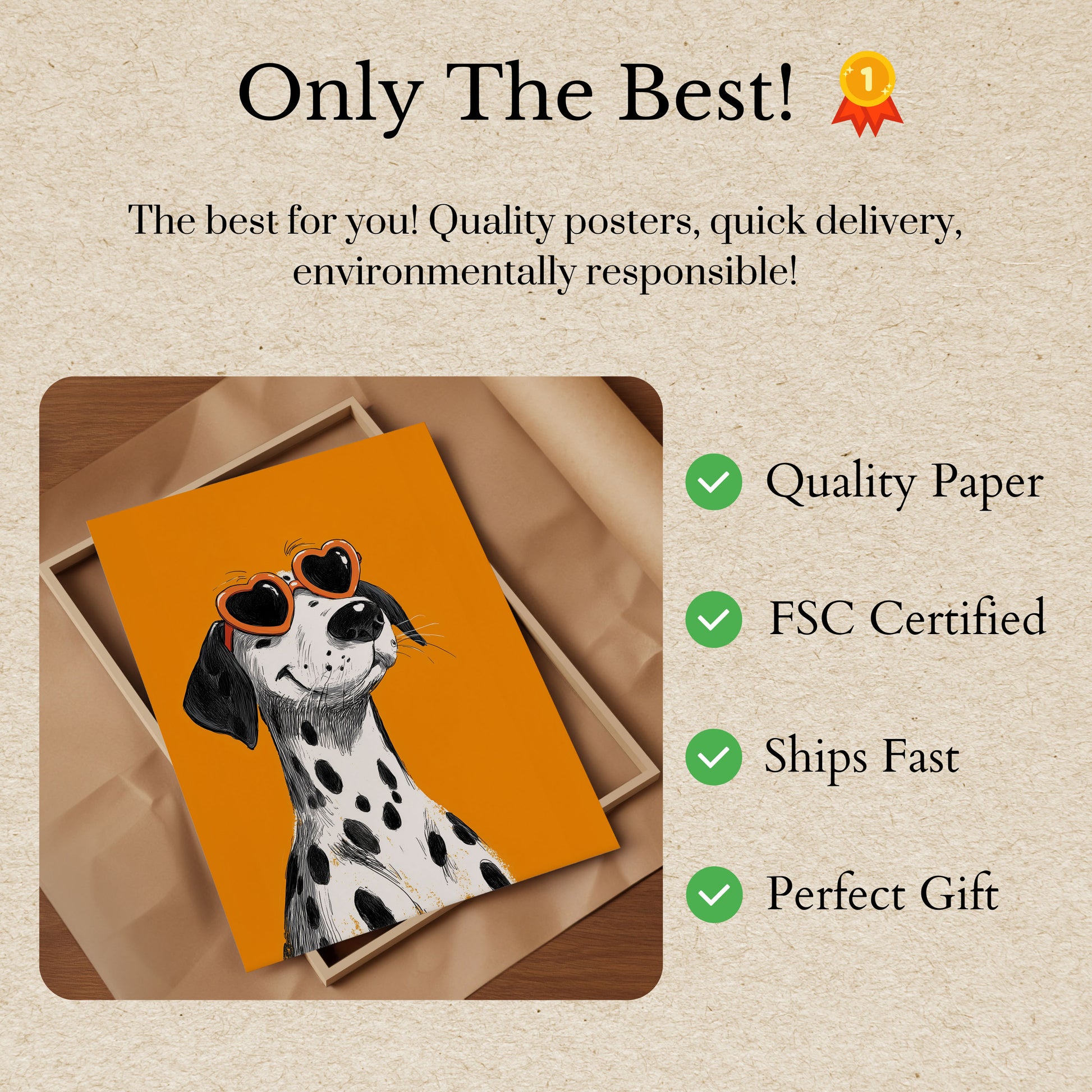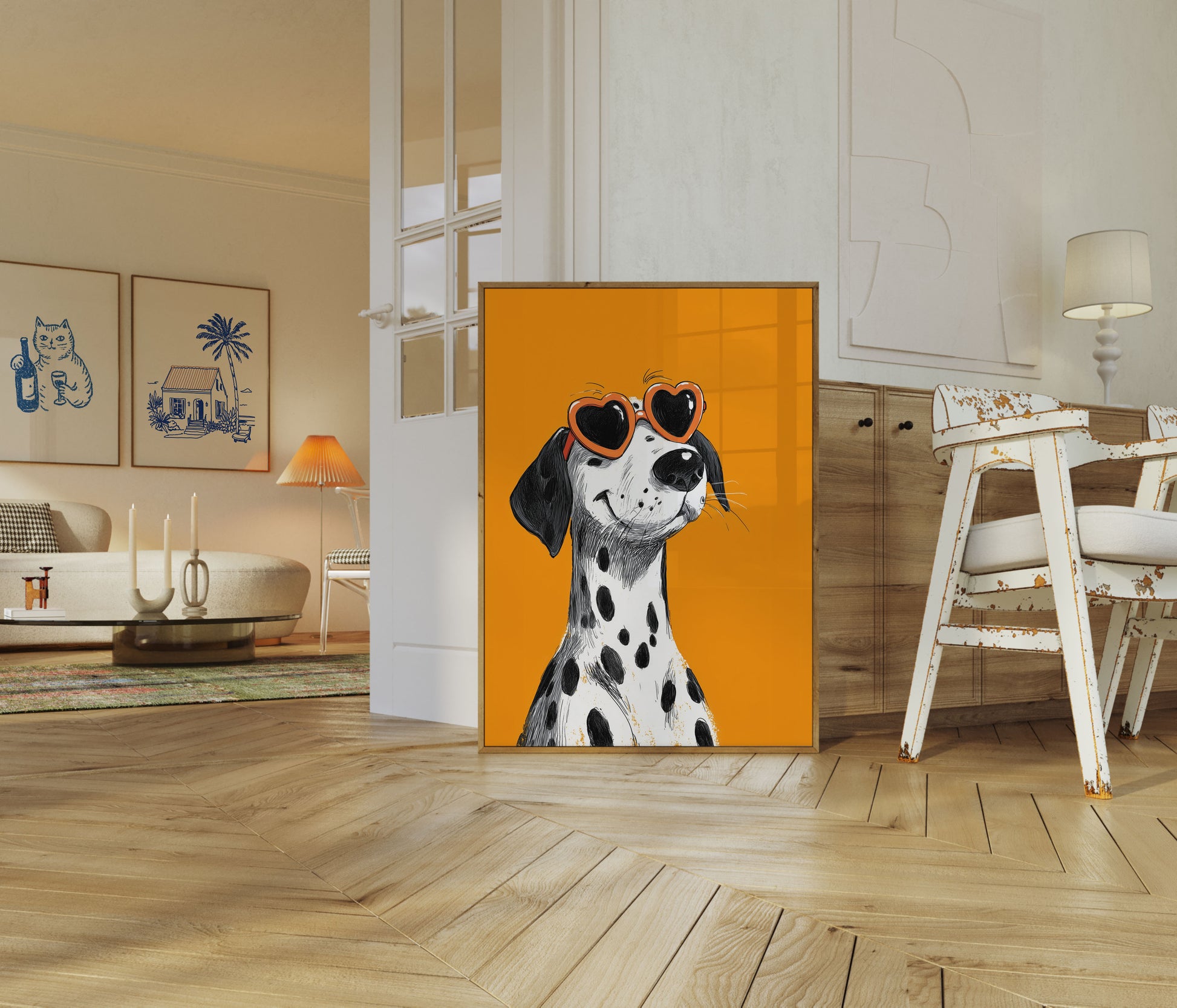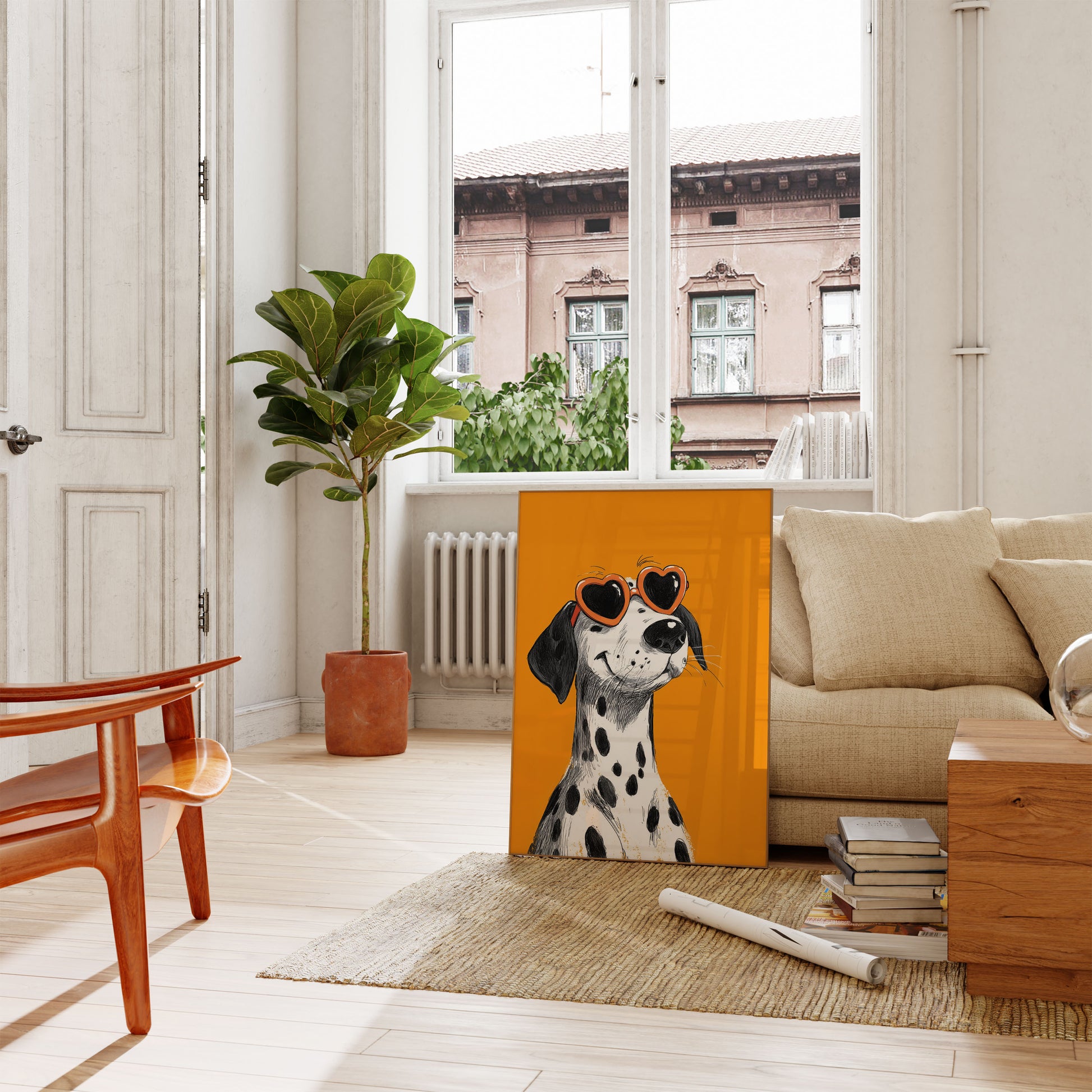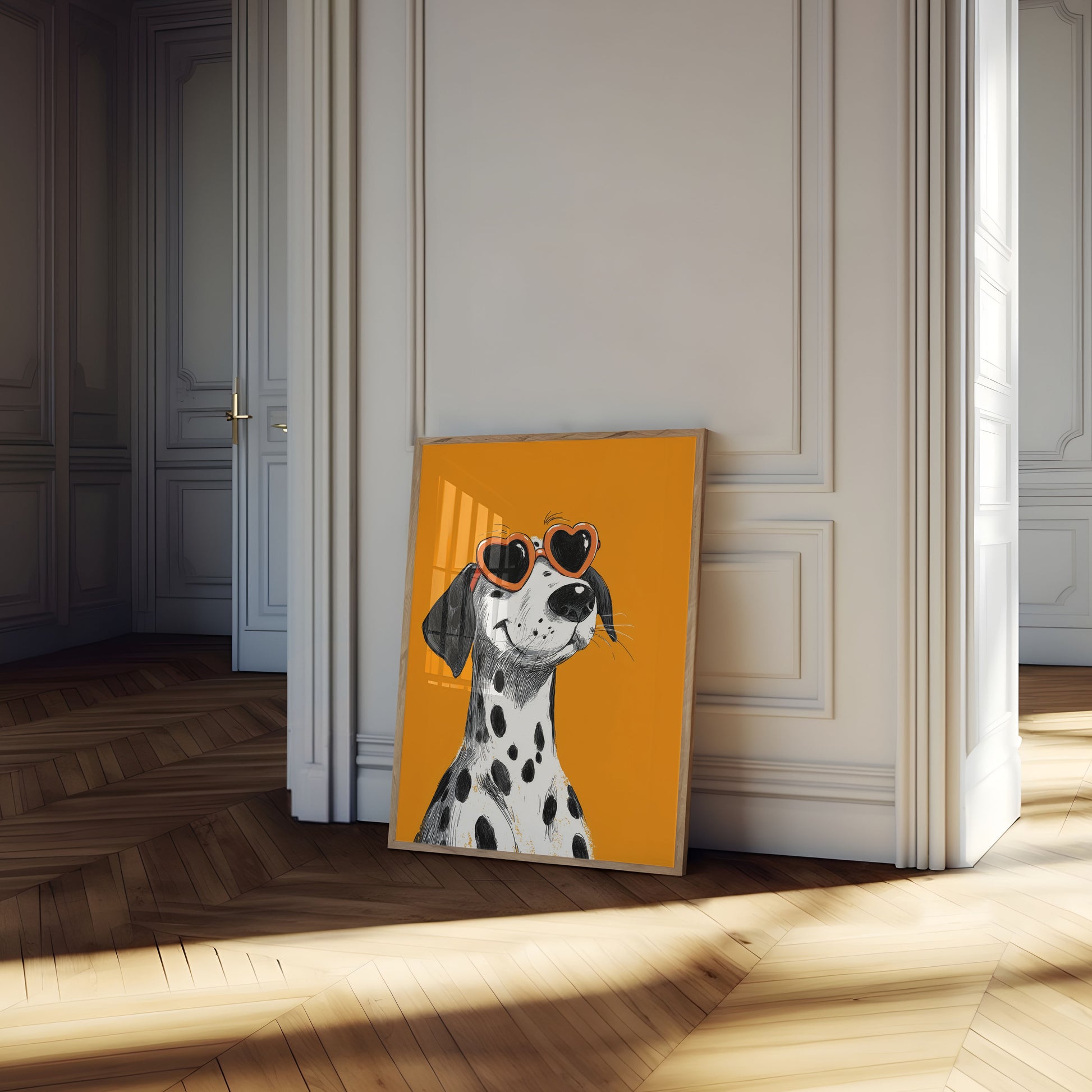 Desata tu encanto juguetón con este vibrante retrato de dálmata, con gafas de sol naranjas en forma de corazón sobre un atrevido fondo mandarina. La ilustración, dibujada a mano, captura la adorable personalidad del perro con expresivas manchas blancas y negras y un espíritu peculiar y divertido que iluminará cualquier habitación. Esta lámina artística irradia pura alegría y fantasía, ideal tanto para los amantes de los animales como para los amantes del arte.