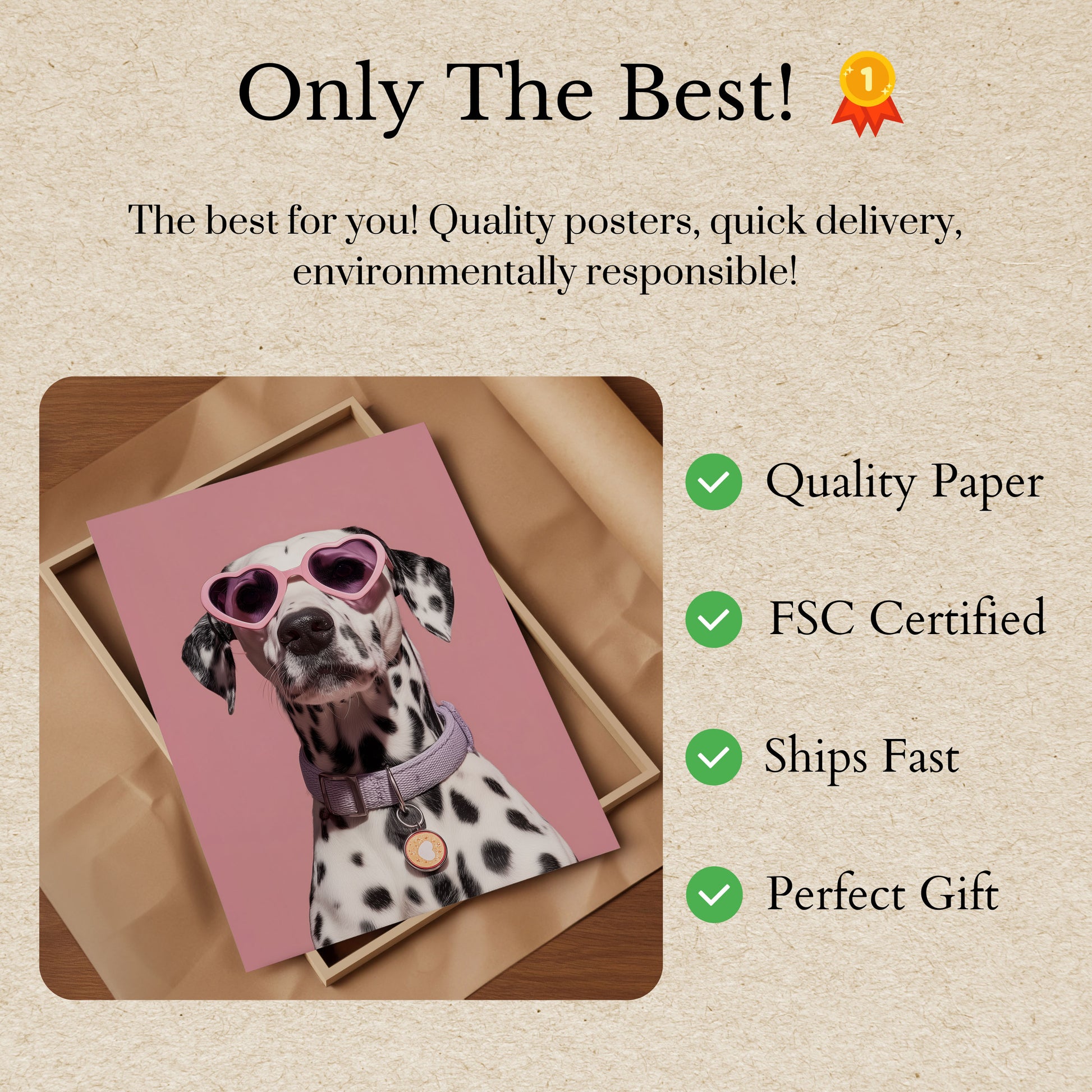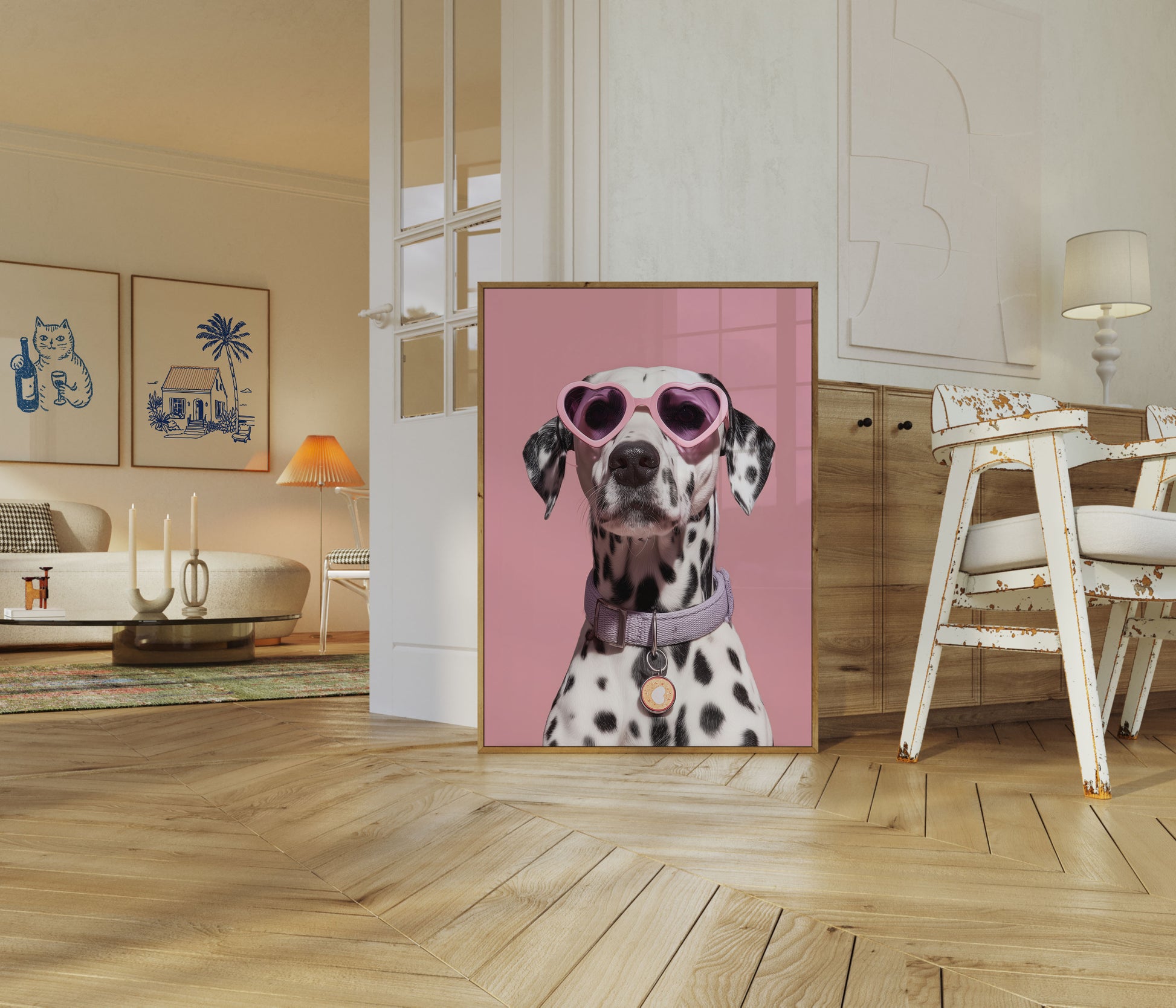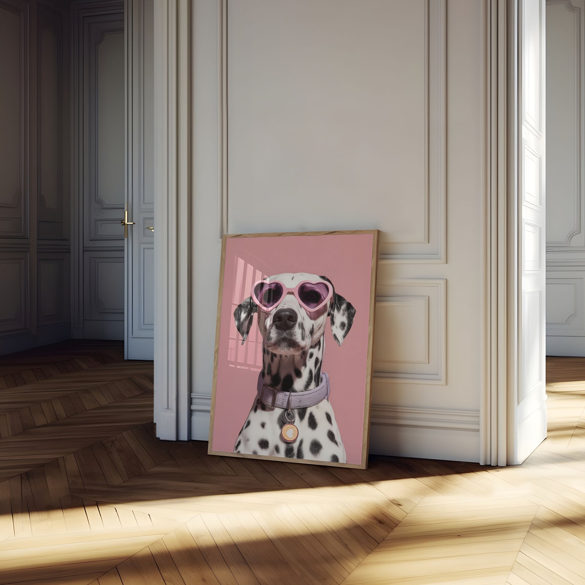 Conoce al perro más genial de la ciudad, luciendo unas gafas de sol rosas con forma de corazón sobre un fondo rosa pálido. Este adorable dálmata posa con una mezcla de glamour y encanto juguetón, luciendo un collar lavanda y una moderna placa circular. Su distintivo pelaje con manchas blancas y negras contrasta de maravilla con el fondo rosa, creando una imagen irresistiblemente adorable y elegante que iluminará cualquier habitación.