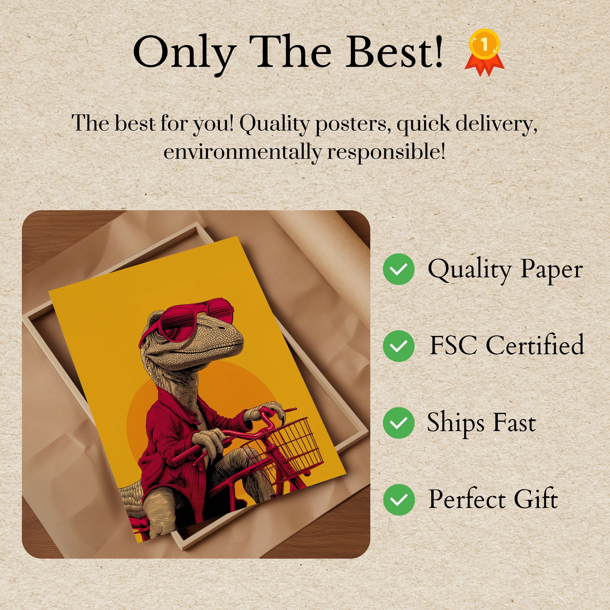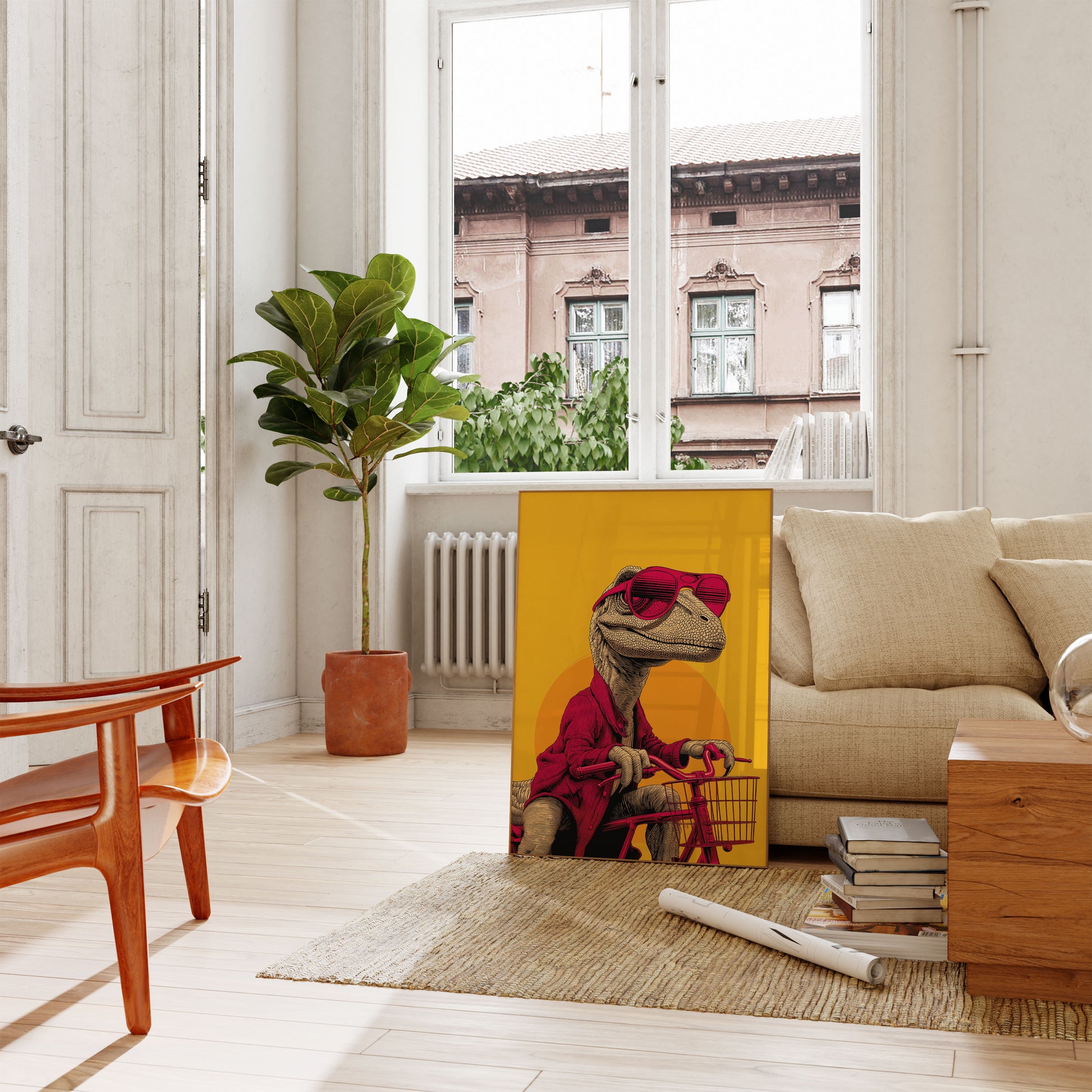 Prepárate para un paseo con estilo prehistórico con esta llamativa ilustración de un T-Rex con gafas de sol retro y un vibrante atuendo rojo mientras monta en bicicleta. Sobre un fondo amarillo y naranja intenso, este peculiar póster de dinosaurio captura un momento lúdico e inesperado, combinando el encanto vintage con una actitud prehistórica.