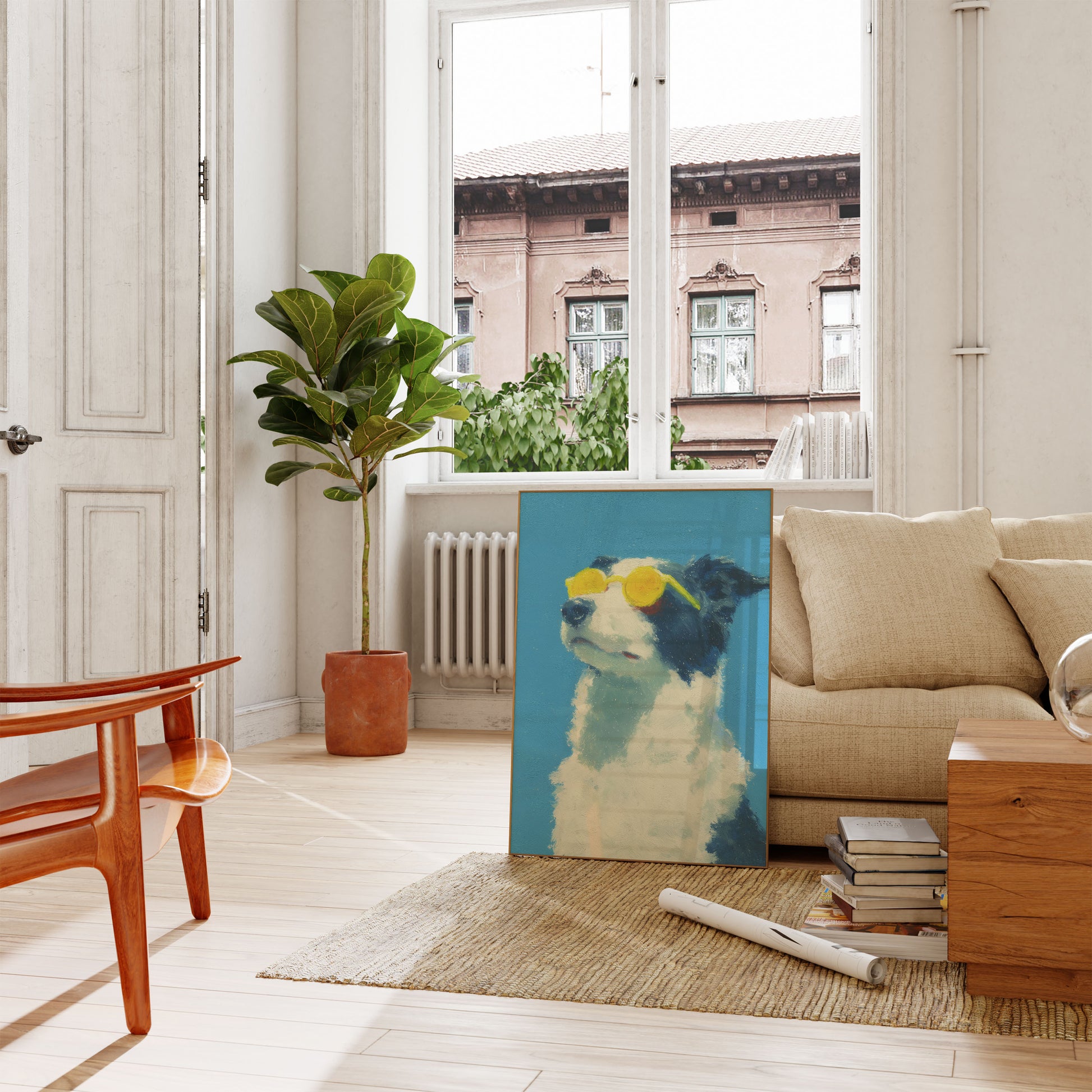 Get ready to chill with this adorable canine rocking some seriously cool yellow sunglasses! This playful art print captures a dog's carefree summer spirit, featuring a fluffy white and navy blue pup against a bright blue background. The textured painting style brings a vibrant, energetic feel that's sure to bring a smile to anyone's face.