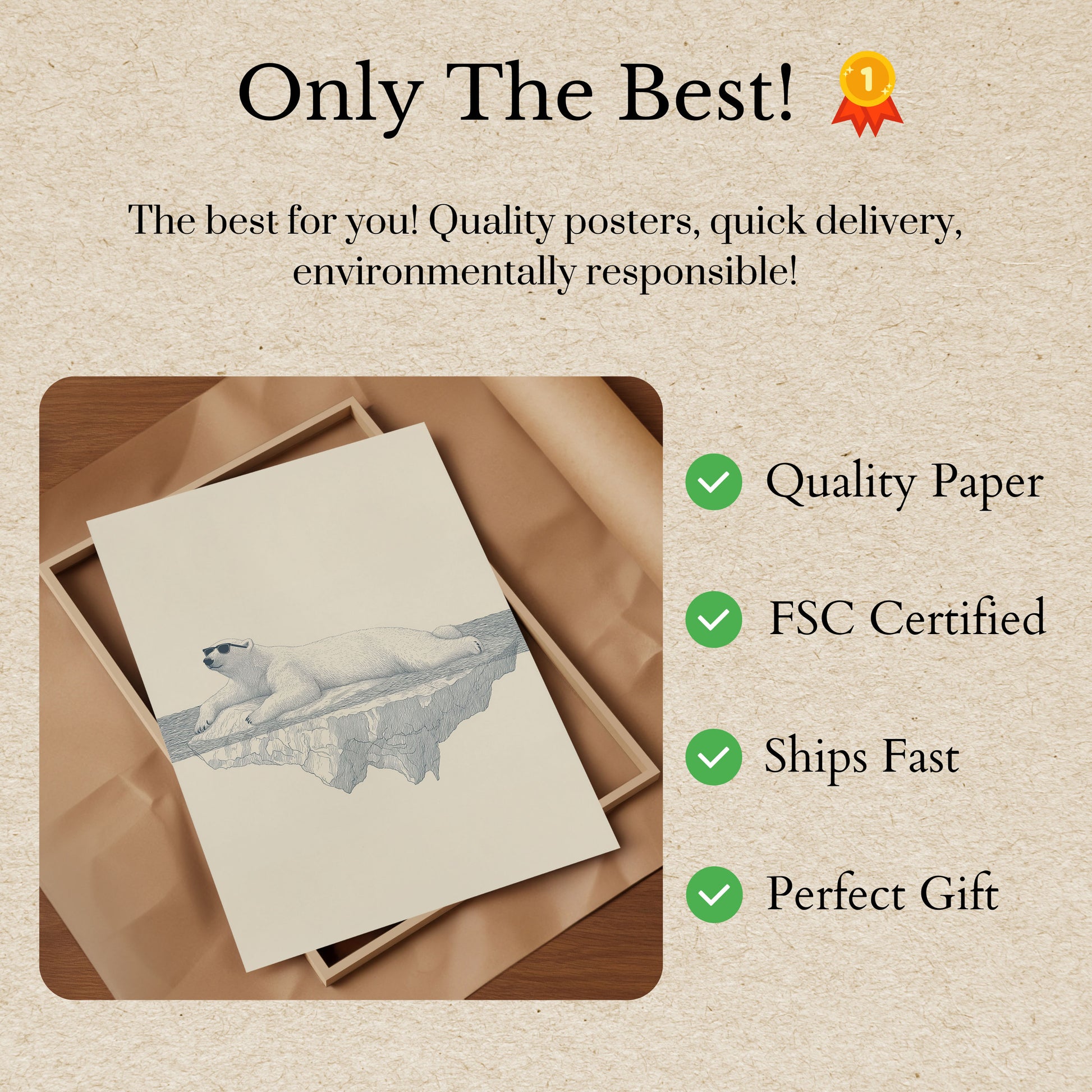 Sumérgete en la serenidad de este oso polar ultramoderno que descansa sobre un paisaje minimalista de icebergs. Con elegantes gafas de sol, el oso irradia calma y sofisticación sobre un fondo suave y neutro que realza su elegante forma y su pelaje texturizado. Esta impresionante ilustración captura la majestuosa naturaleza de la fauna ártica con un toque lúdico y moderno que sin duda dará que hablar.
