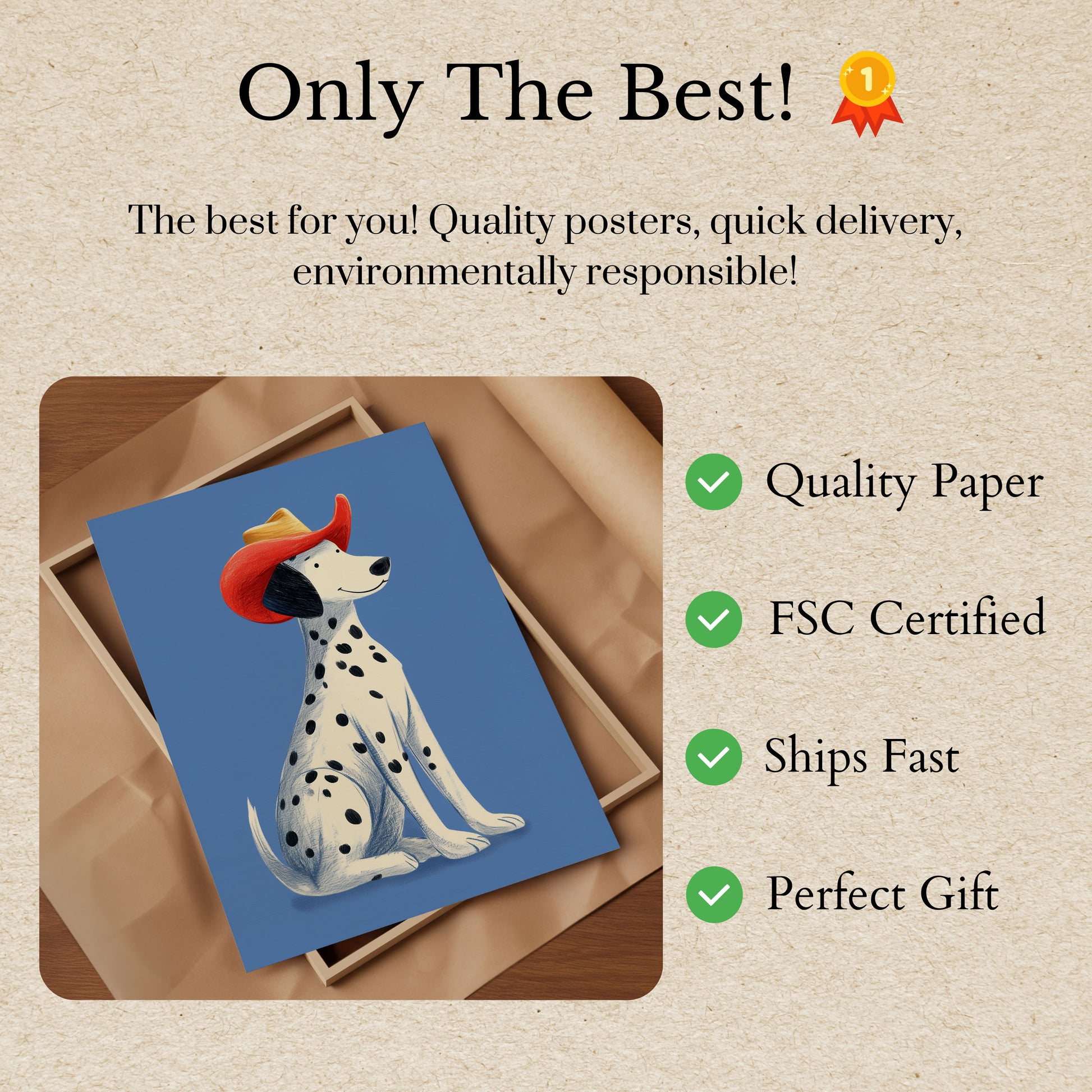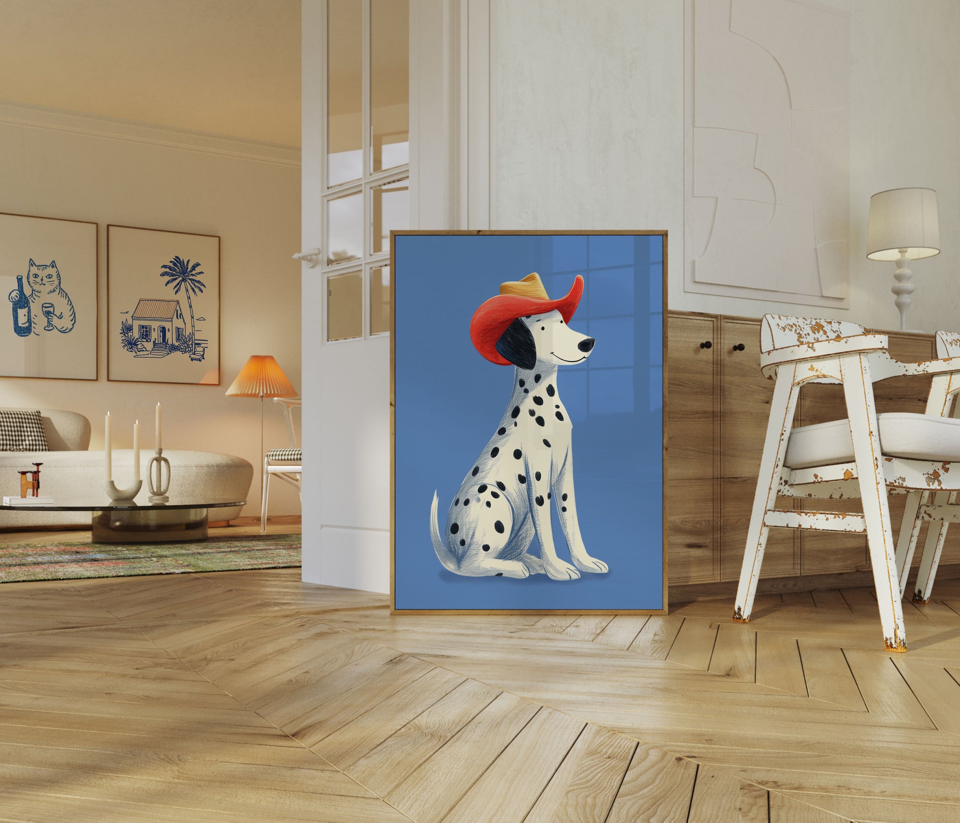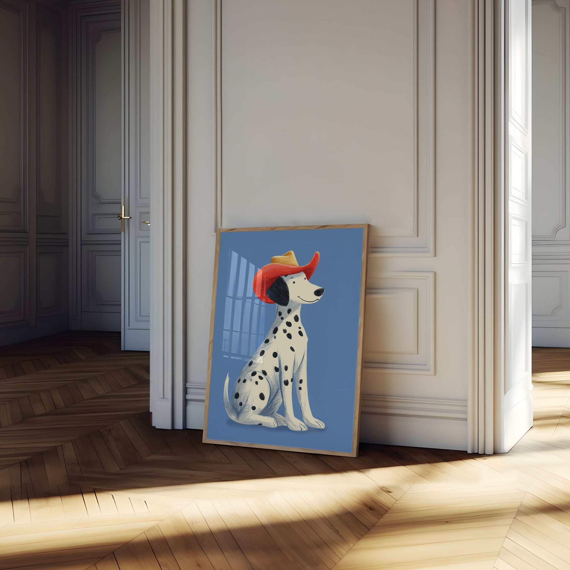 Conoce al perro más genial de la ciudad: un dálmata moteado con un vibrante sombrero de vaquero rojo y amarillo sobre un sereno fondo azul. Esta encantadora ilustración captura el espíritu juguetón de un perro con estilo, con una sonrisa amigable y las clásicas manchas negras que se deslizan sobre un suave pelaje blanco texturizado. La obra combina fantasía y carácter, creando una escena encantadora que iluminará cualquier habitación.
