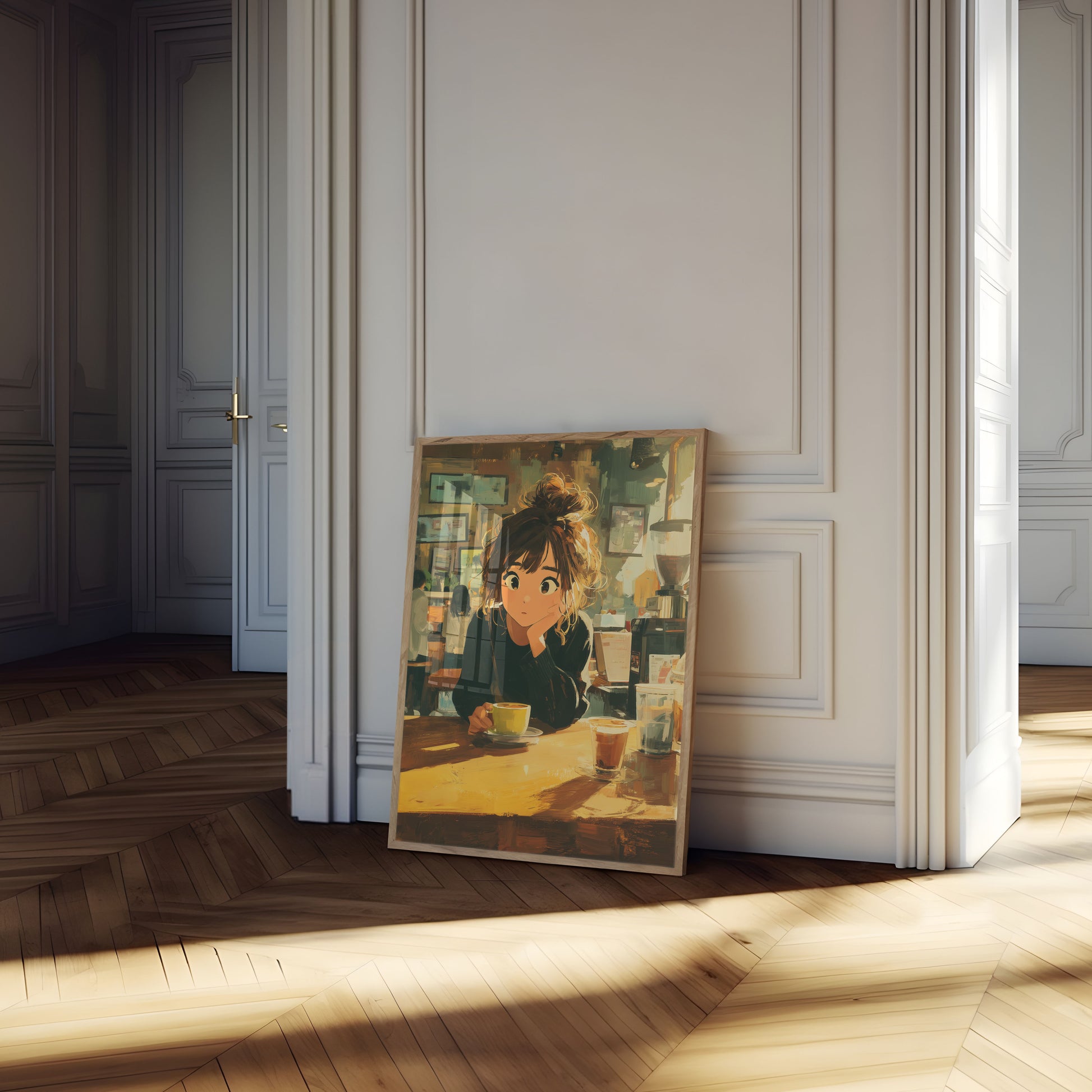 Step into a warm, golden-hued coffee shop scene captured with stunning artistic detail. This illustration depicts a contemplative moment of a young woman with messy hair, resting her head on her hand beside a cheerful yellow coffee cup. The soft, impressionistic style creates a sense of quiet reflection and urban tranquility, inviting viewers to pause and savor life's simple pleasures.