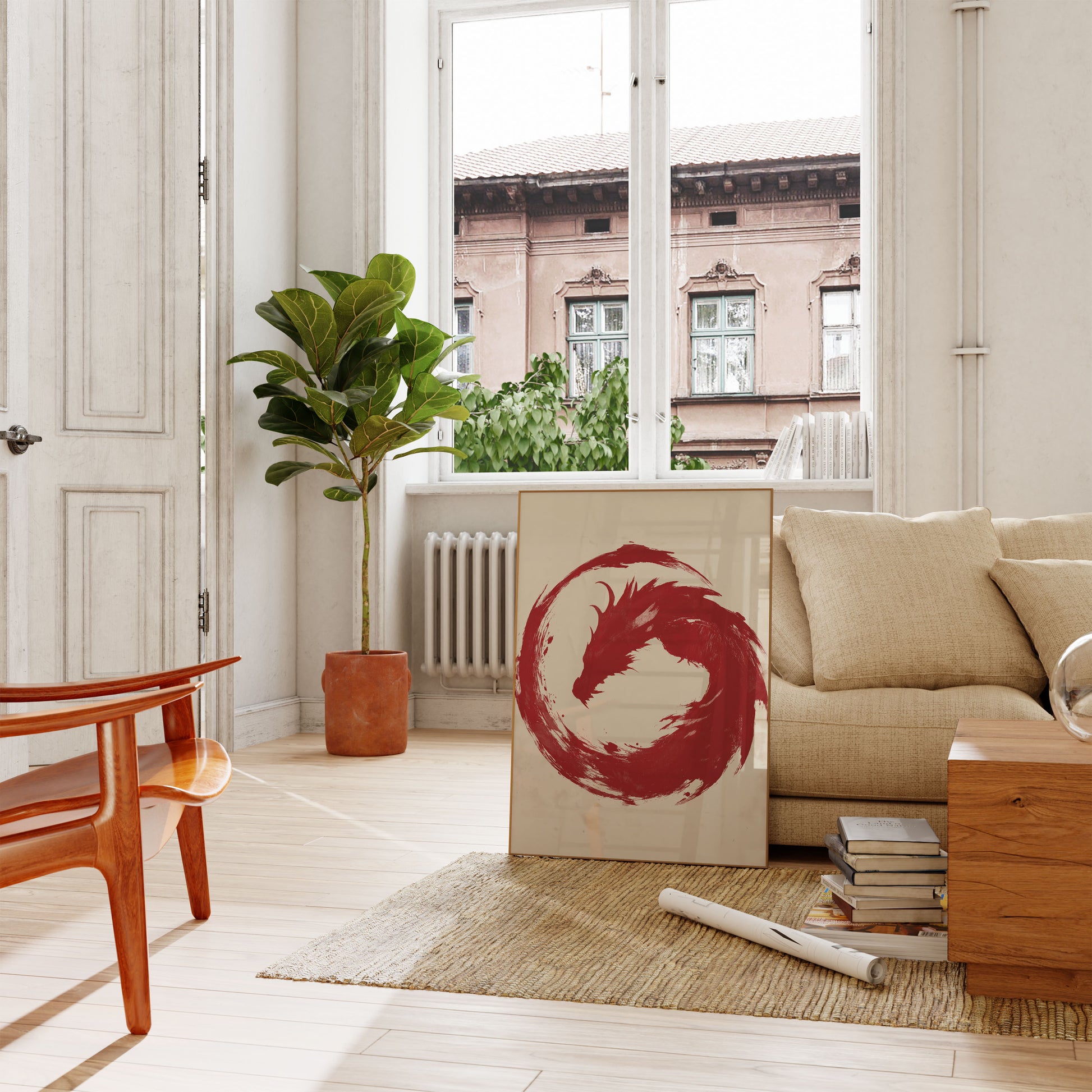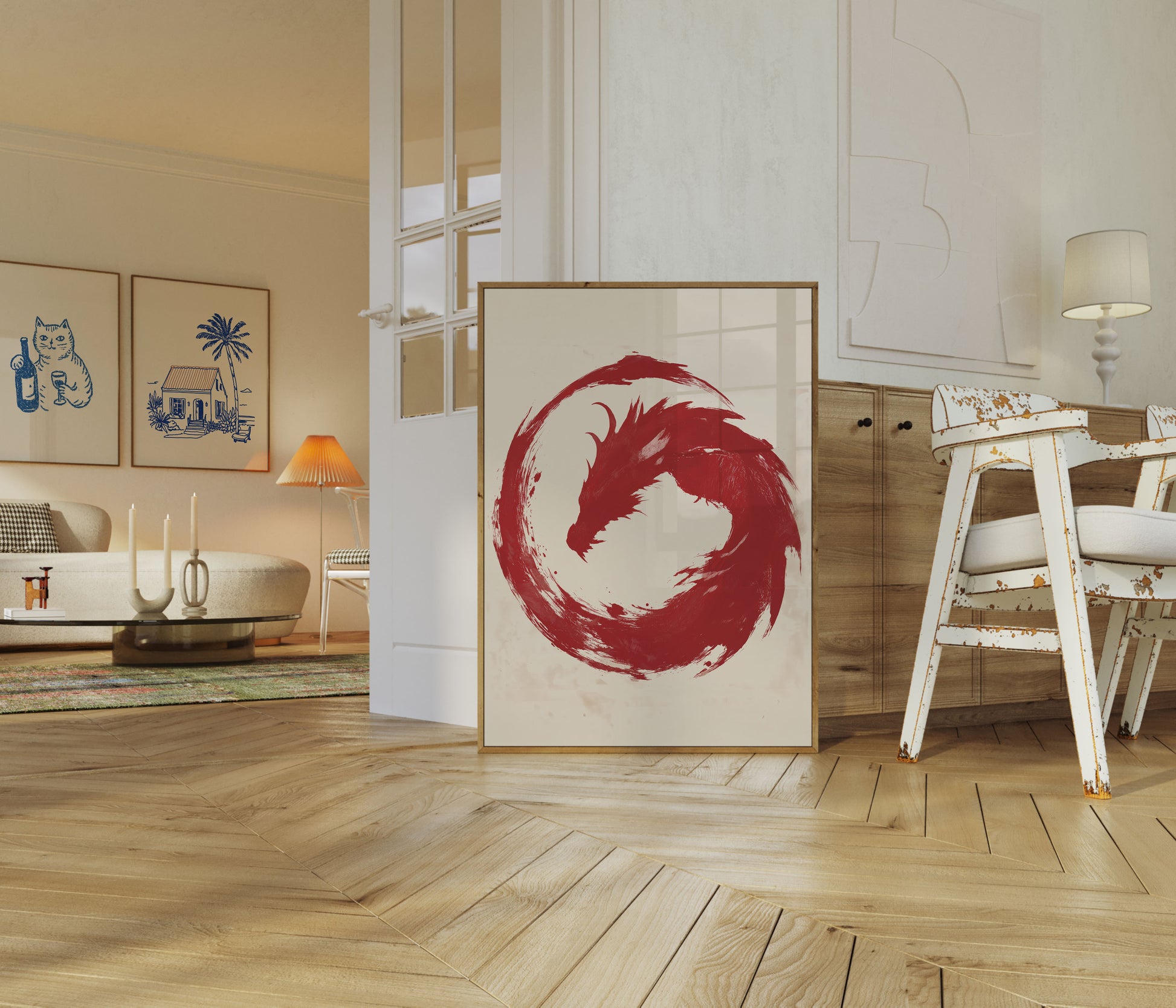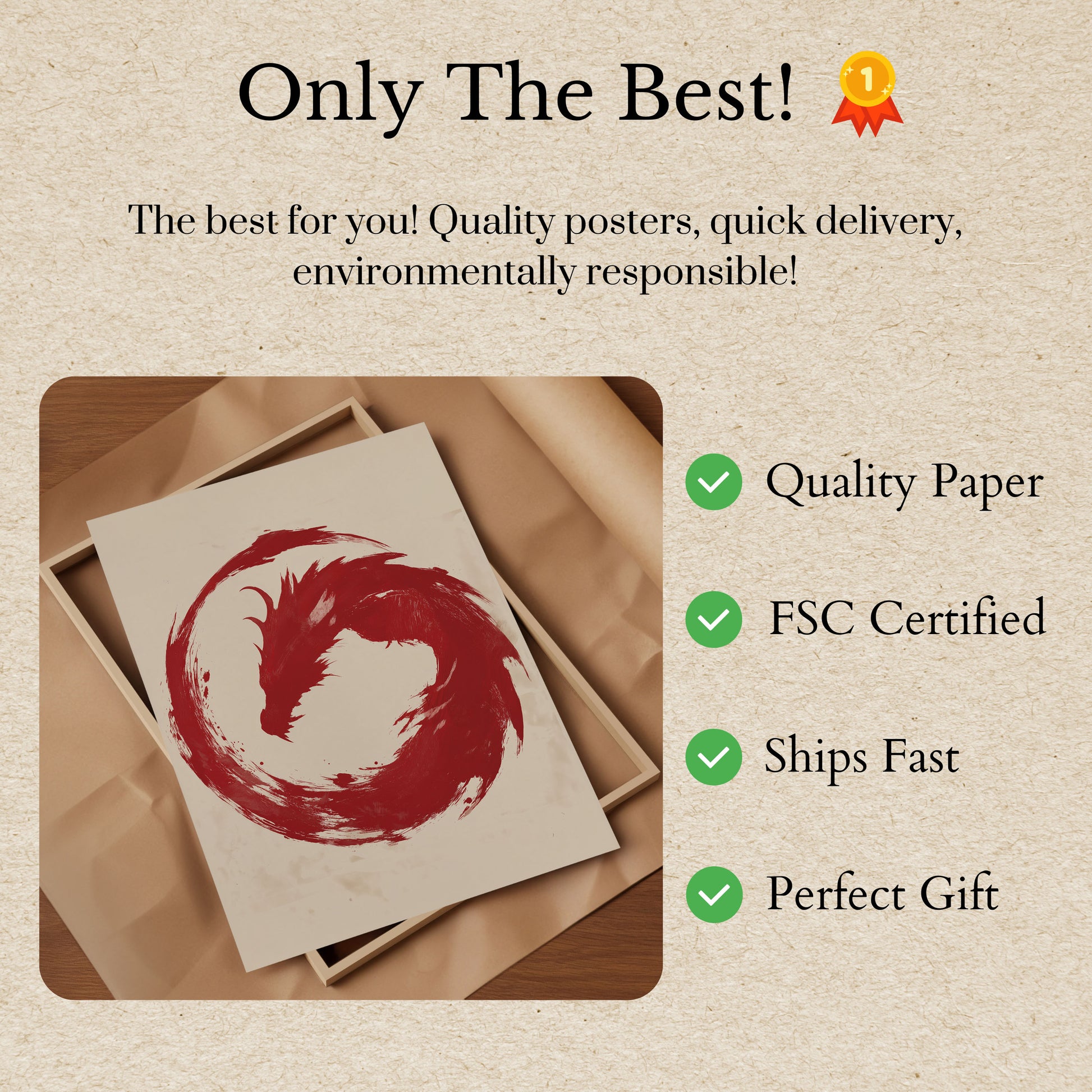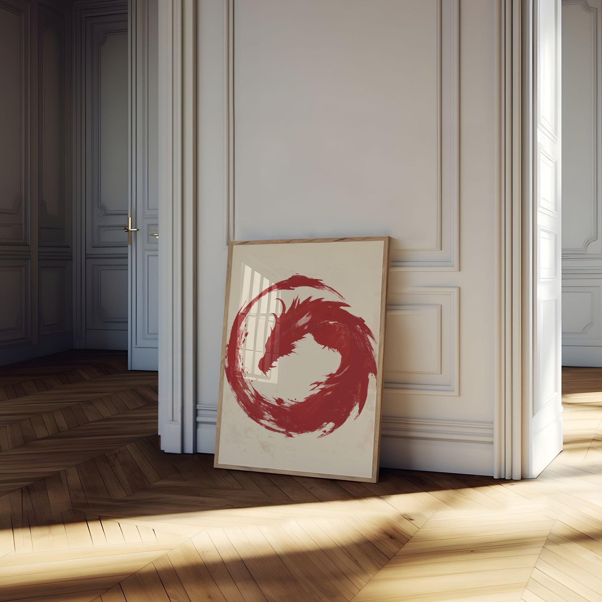 Un fascinante dragón rojo emerge de un diseño circular, dinámico y arremolinado, capturando el poder puro y la esencia mítica de la criatura. La obra, con su estilo de pinceladas, crea una sensación de movimiento e intensidad, con la forma del dragón fundiéndose a la perfección en un movimiento circular sobre un fondo suave y vintage. Esta impactante composición en rojo y crema evoca el espíritu del arte asiático y la narrativa mitológica.