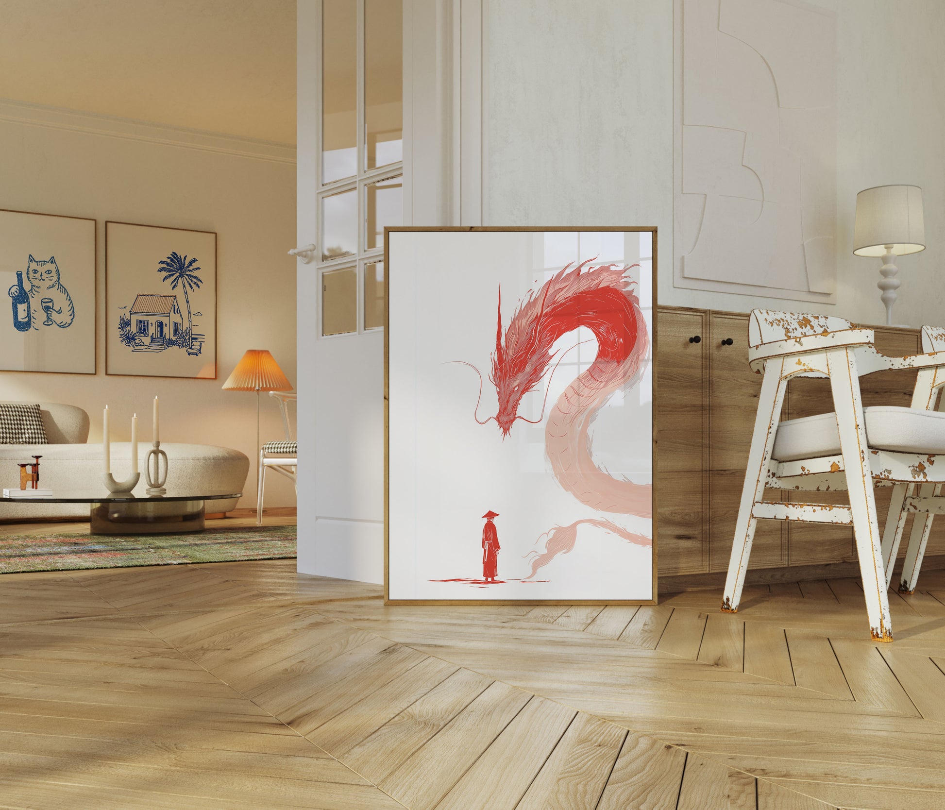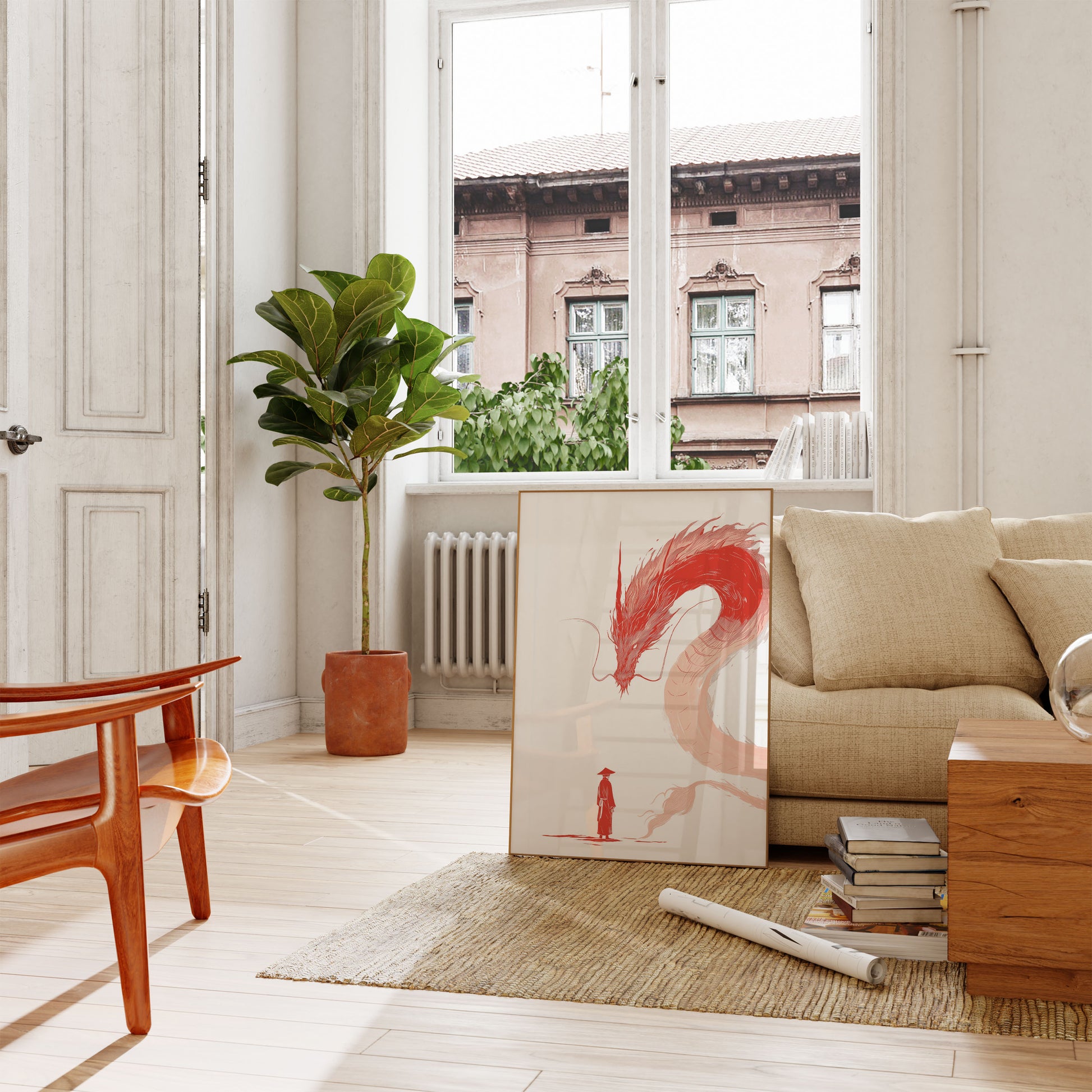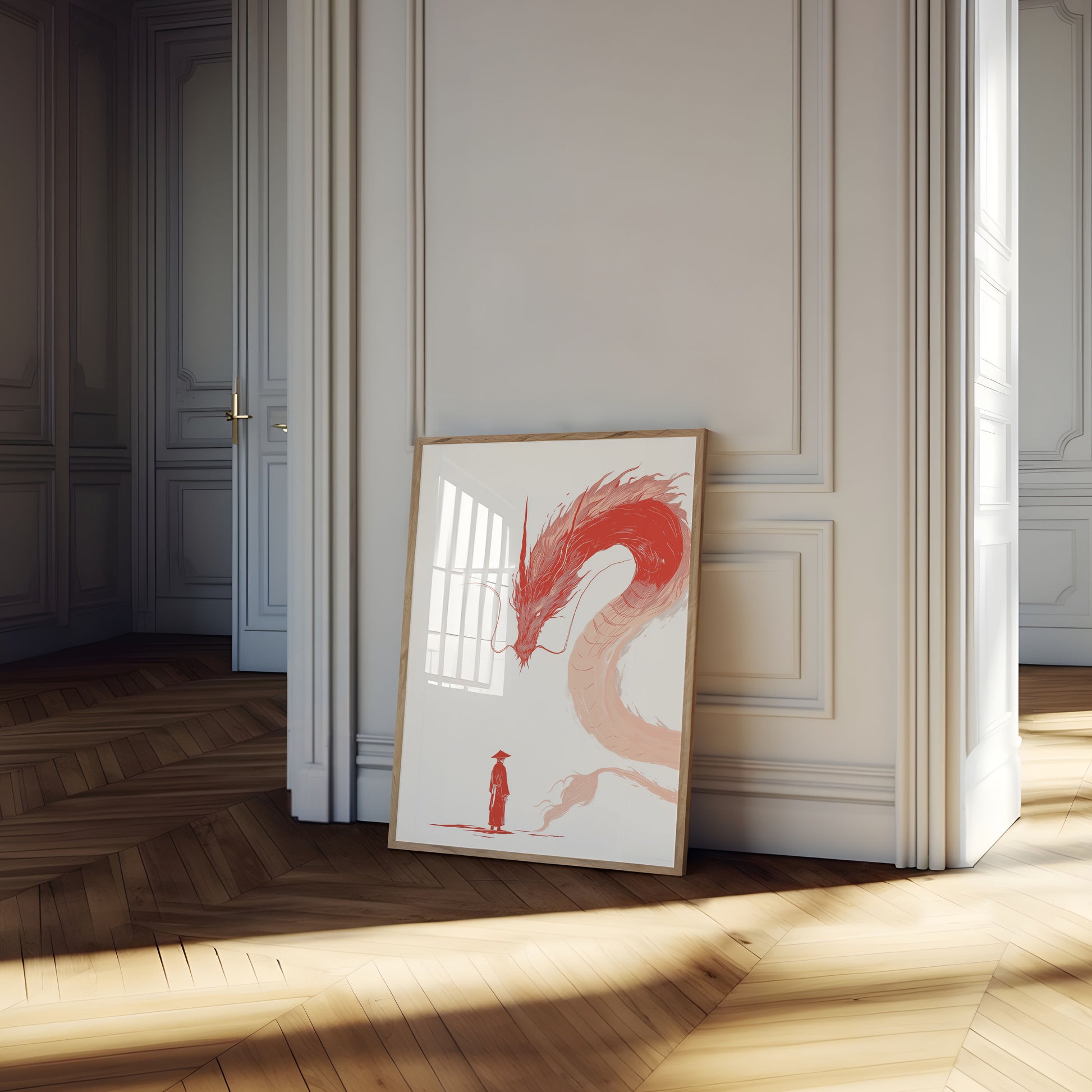 Una fascinante ilustración de un poderoso dragón rojo que se alza imponente sobre una figura solitaria con atuendo tradicional asiático, creando una impactante narrativa visual de proporciones místicas. La obra captura un intenso momento de conexión entre el pequeño humano y el majestuoso dragón, con forma de llama, representado en elegantes tonos de rojo y rosa suave, con líneas gráciles y fluidas que evocan una sensación de encuentro espiritual y poder legendario.