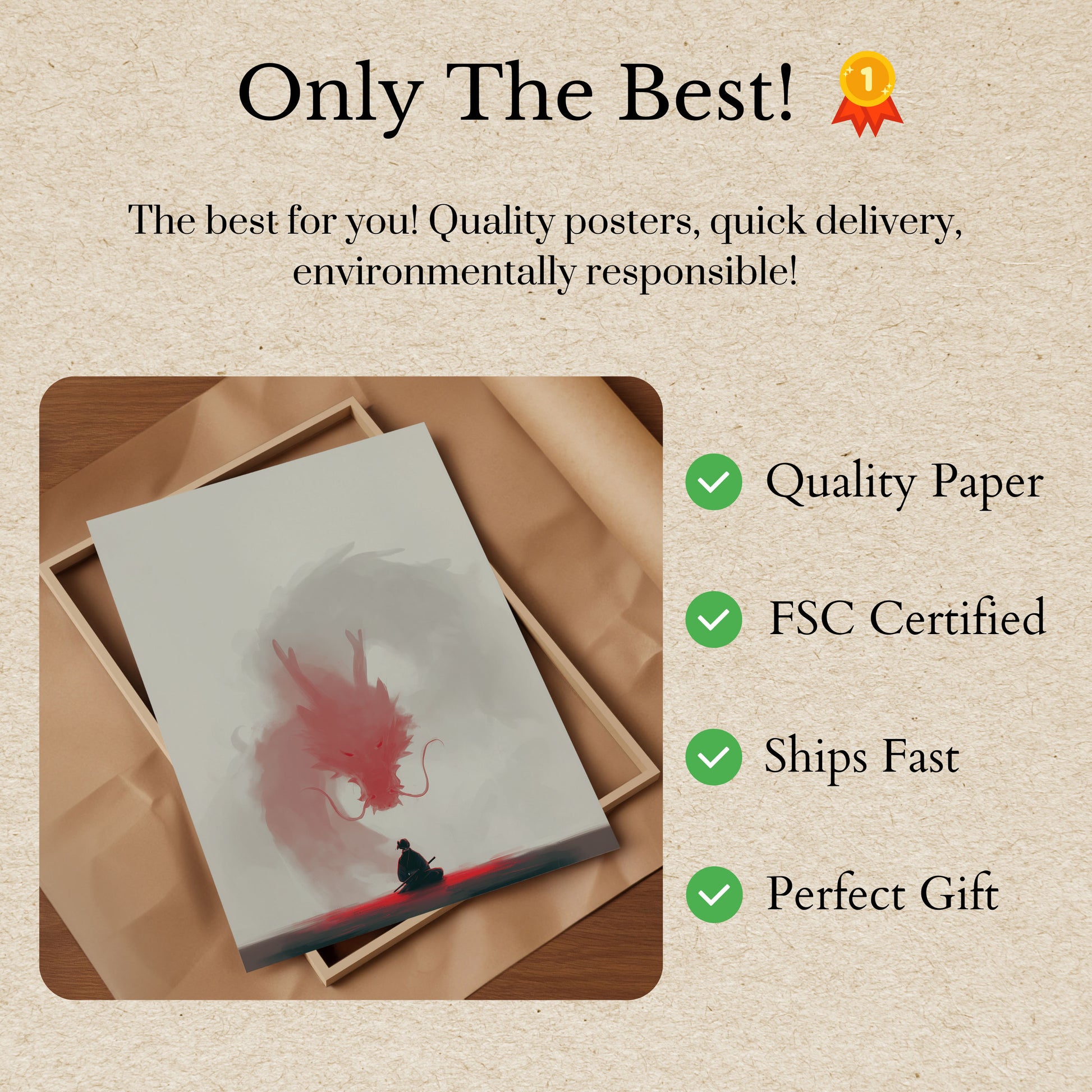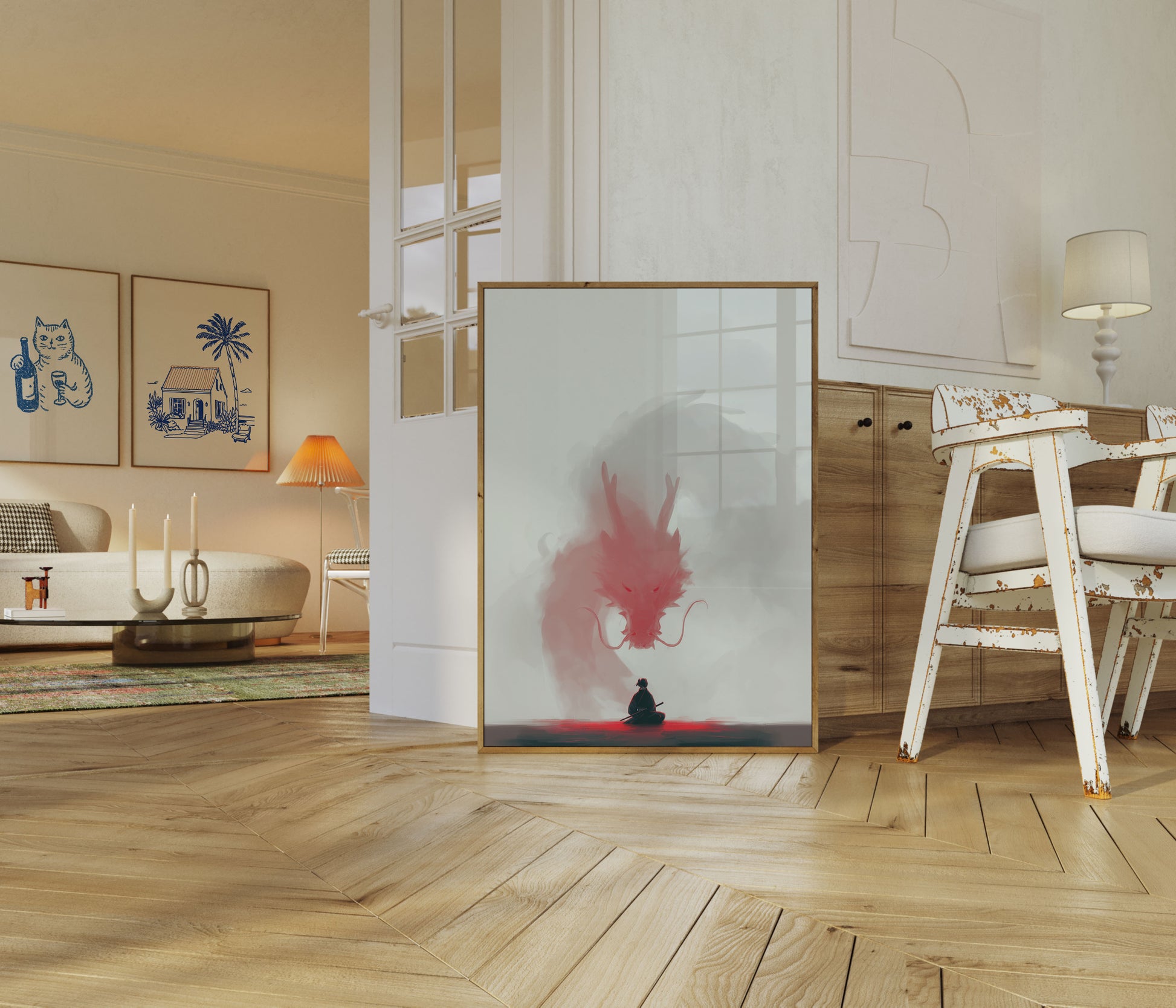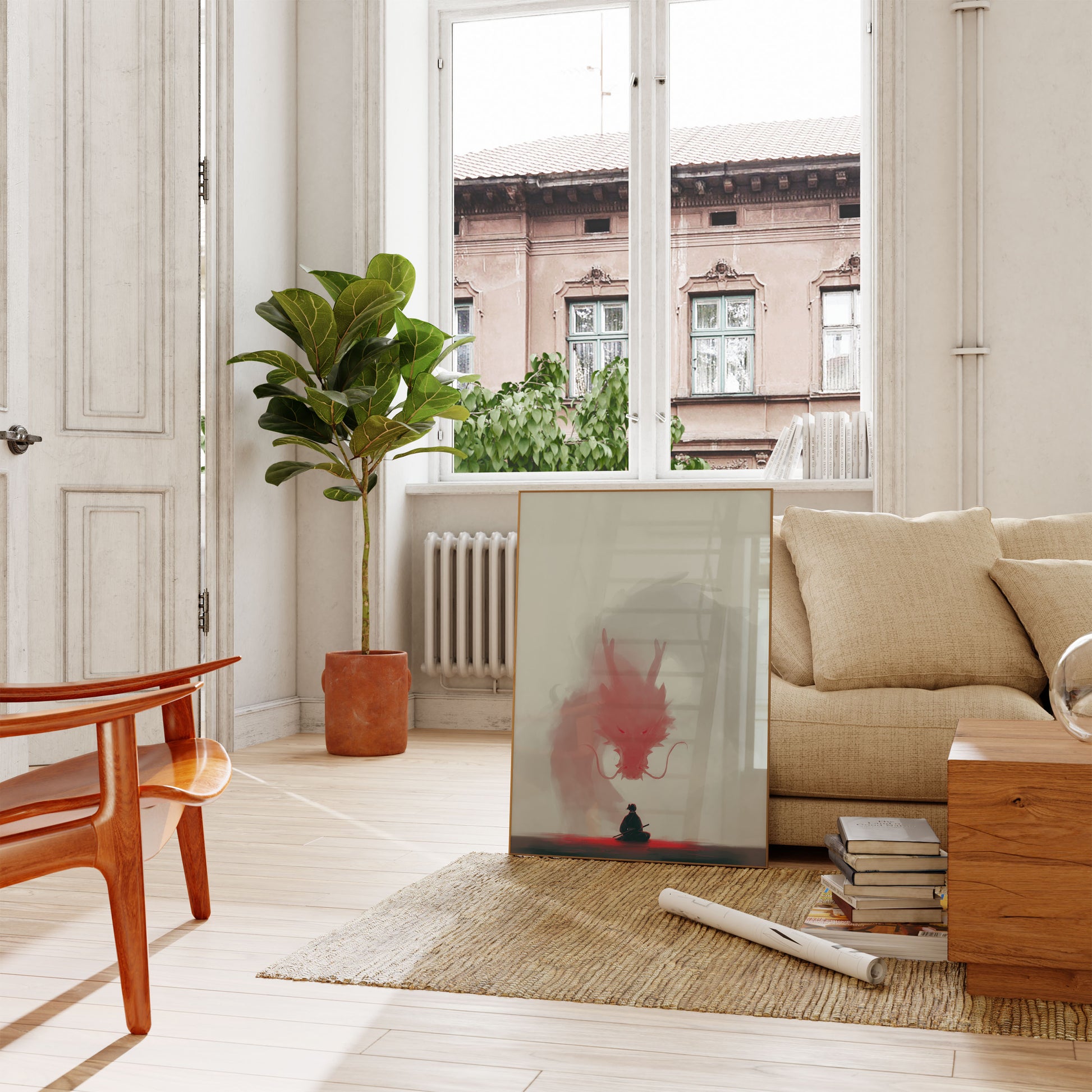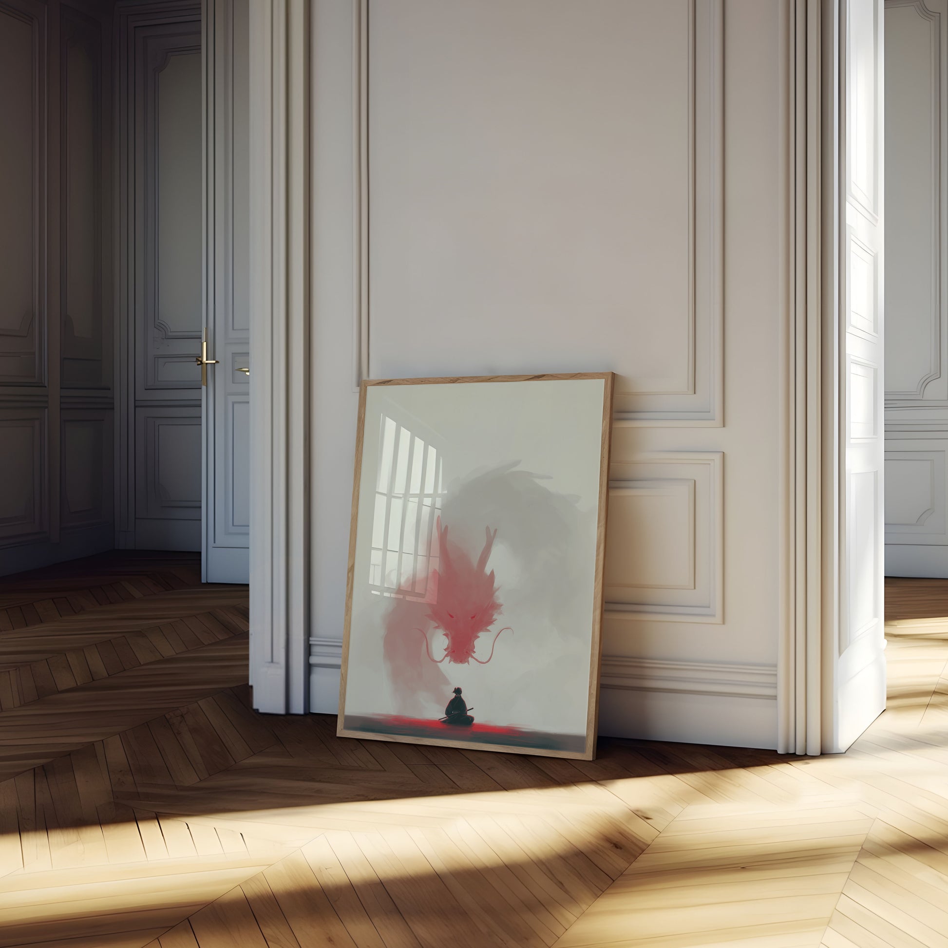Una obra de arte fascinante que captura una figura solitaria meditando ante un imponente y etéreo dragón rojo. Grises suaves y brumosos se funden con profundos tonos carmesí, creando una atmósfera poderosa y mística que evoca la fuerza interior y la transformación espiritual. La forma feroz y espectral del dragón se cierne sobre la figura sentada, simbolizando el poder interior y la sabiduría que emergen de la contemplación serena.