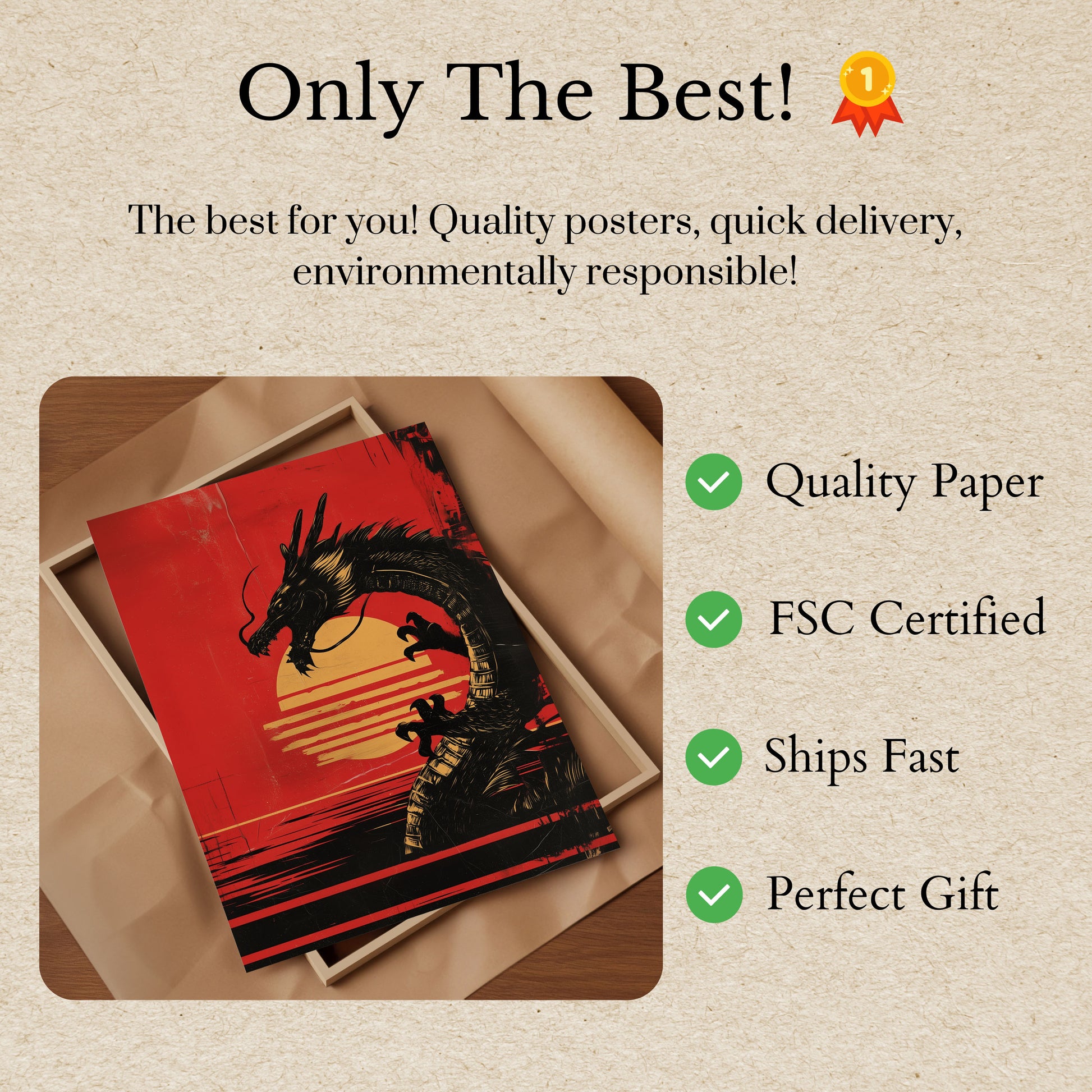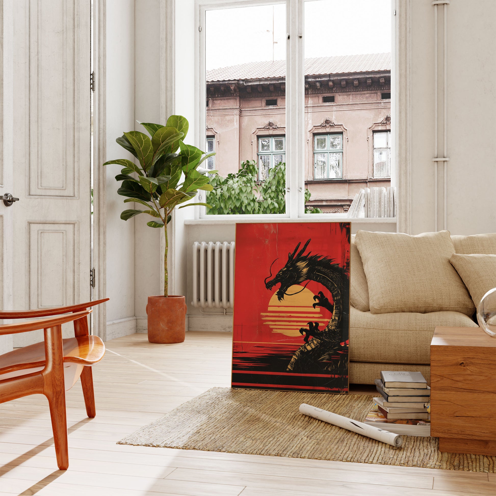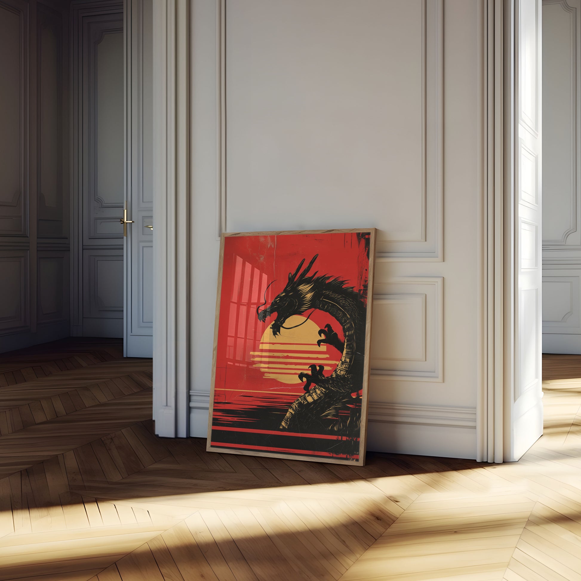 Un feroz dragón negro emerge contra un resplandeciente atardecer rojo y amarillo, creando una experiencia visual dramática e intensa. La obra captura la poderosa silueta de la mítica criatura con intrincados detalles, con sus escamas y garras nítidamente definidas sobre un fondo audaz e impactante. Este póster evoca una sensación de mitología antigua y una energía pura y primigenia que transformará cualquier espacio.