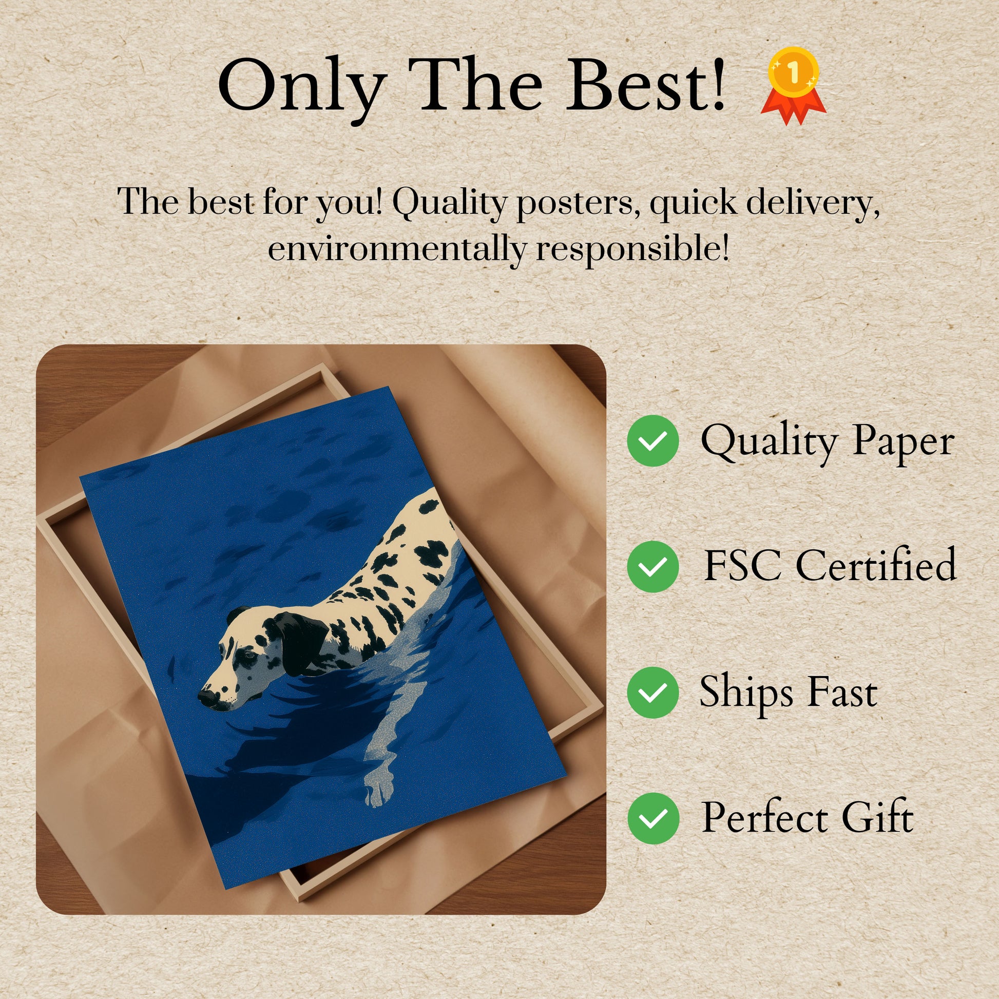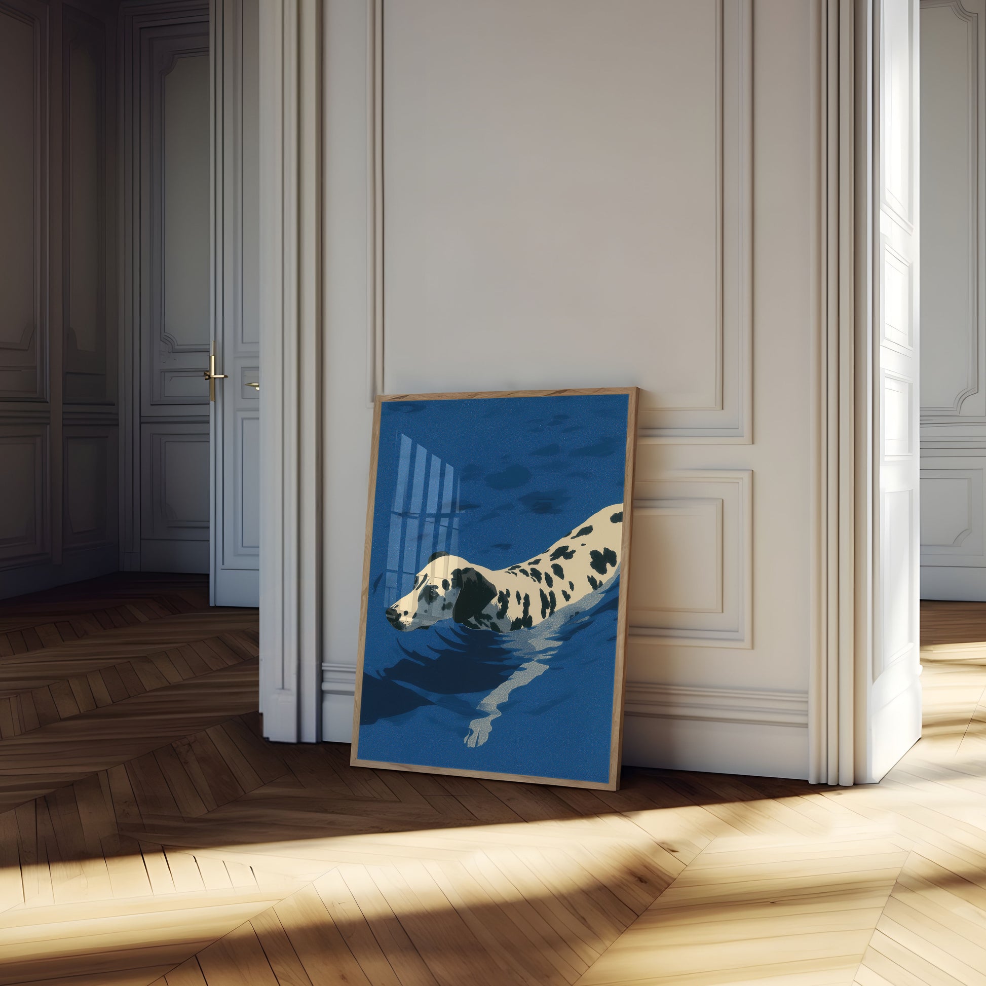 Sumérgete en el fascinante mundo de este impresionante póster de un dálmata nadando, donde las vibrantes aguas azules crean un espectacular telón de fondo para el elegante chapoteo del perro moteado. La obra captura un momento de serenidad y movimiento, con el distintivo pelaje blanco y negro del perro contrastando a la perfección con los profundos tonos azules del océano. Elegante y dinámico, este póster aporta una sensación de calma y aventura acuática a cualquier espacio.