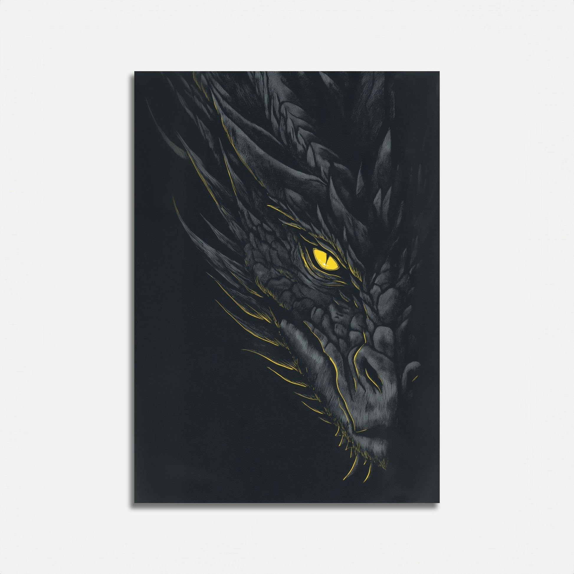 Sumérgete en el sombrío reino de esta fascinante obra de arte de dragón, donde las escamas de obsidiana brillan con intrincados detalles sobre un fondo negro intenso. Un penetrante ojo dorado resplandece con inteligencia ancestral, penetrando la oscuridad con una intensidad primigenia. Esta dramática ilustración captura la esencia mística de la mitología de los dragones, combinando exquisitas texturas en escala de grises con una impactante mirada amarilla que llama la atención.