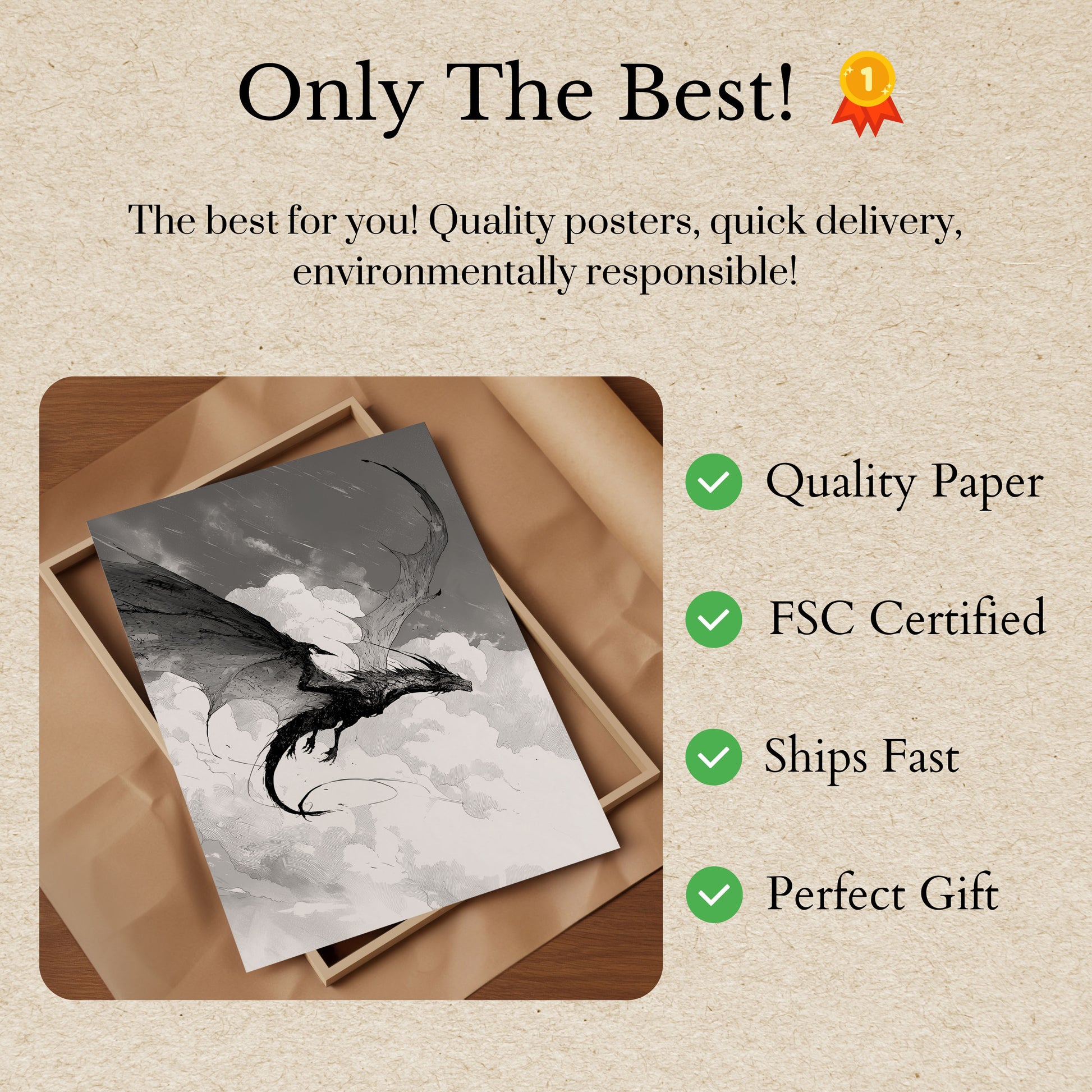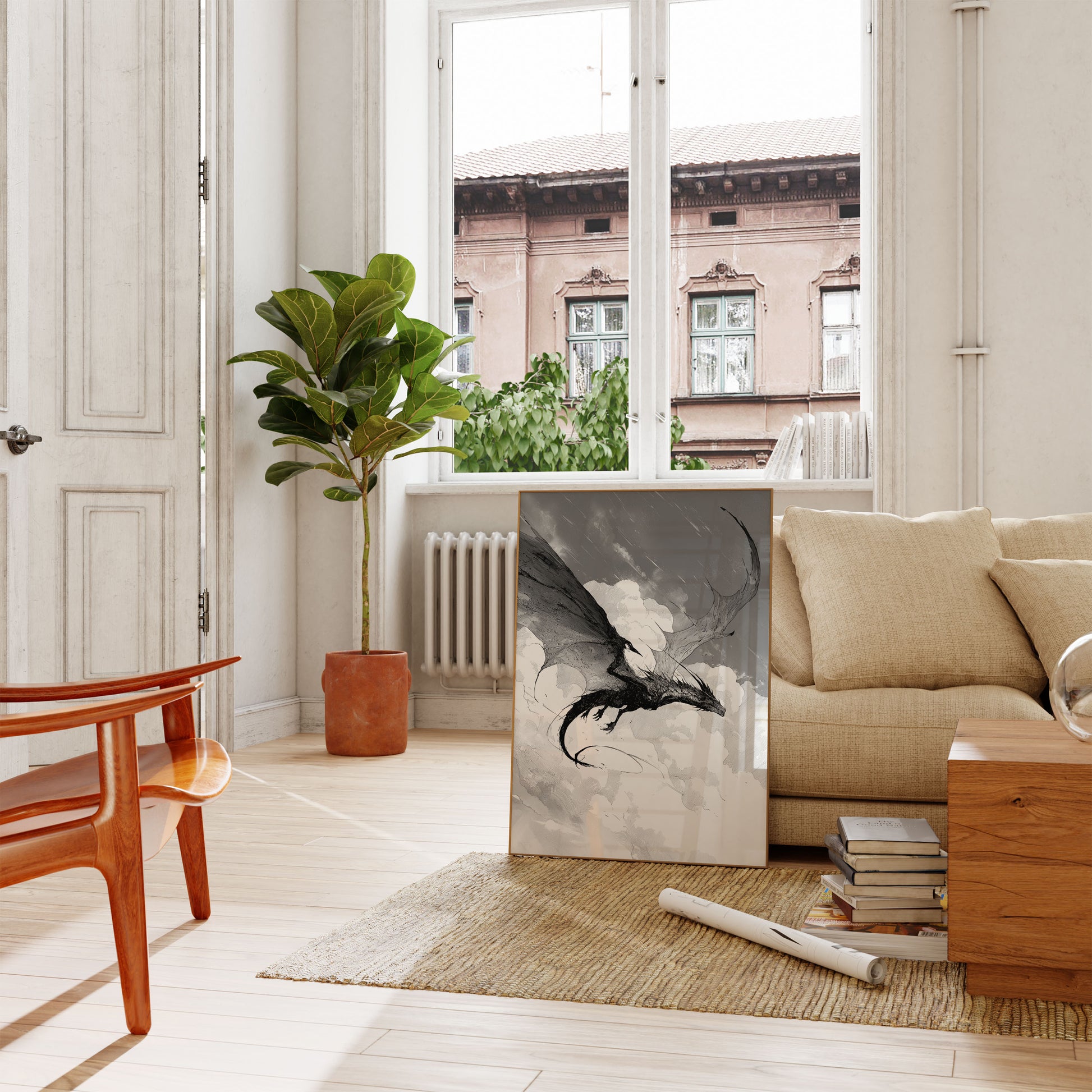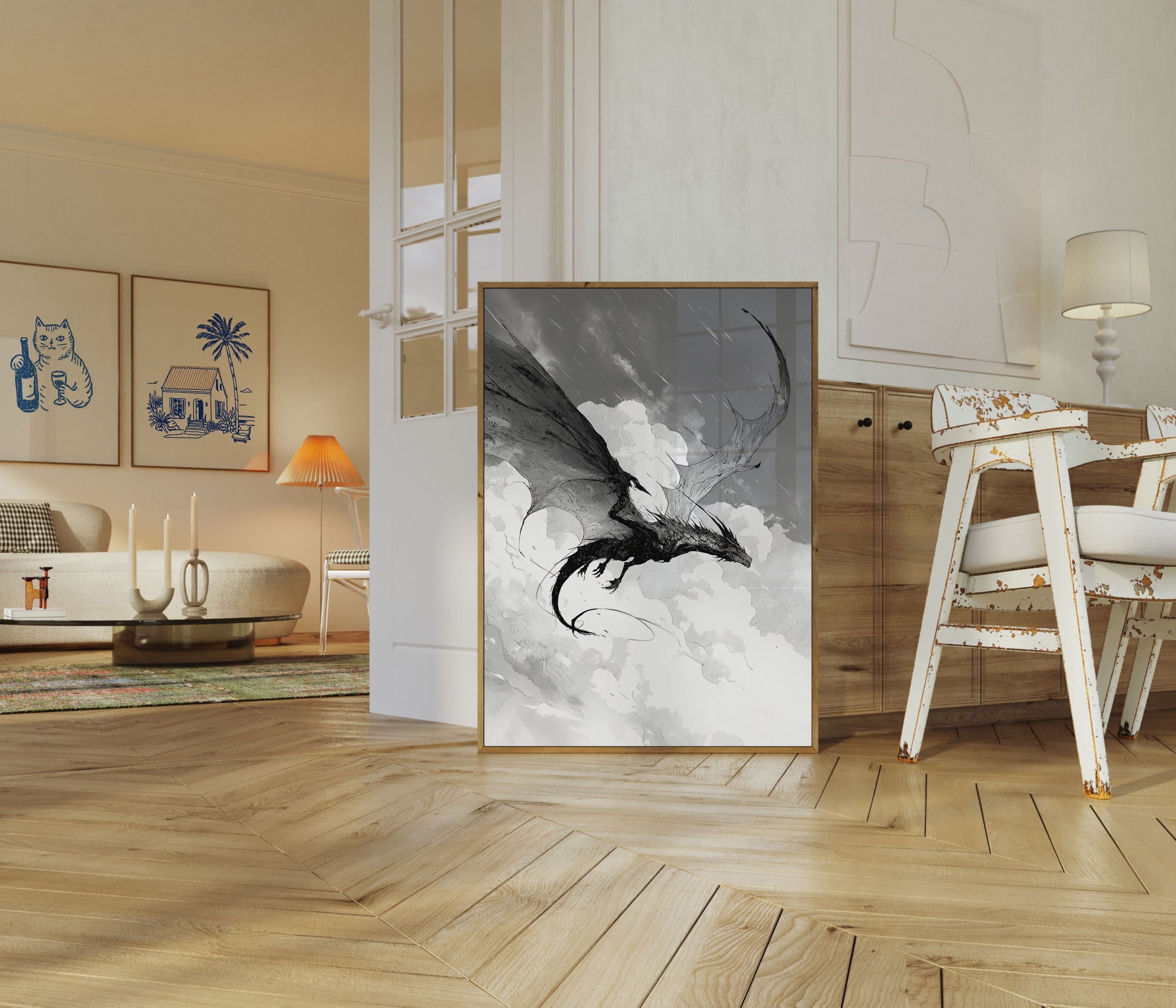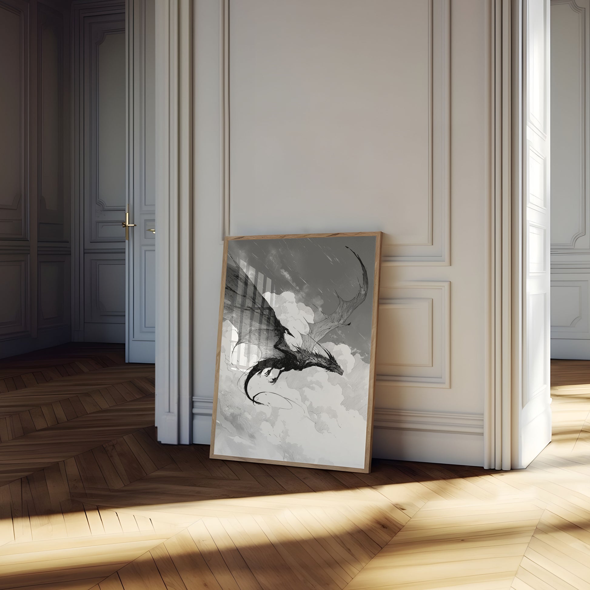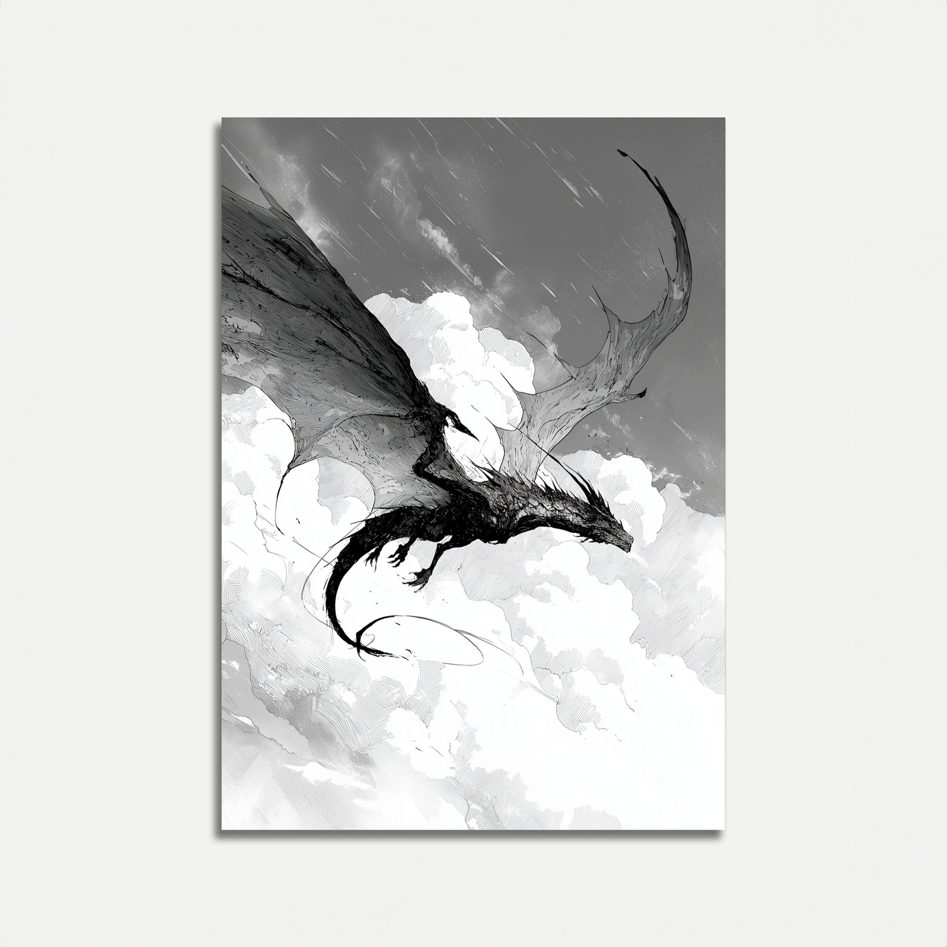 Un fascinante dragón monocromático se eleva entre nubes de tormenta, con sus intrincadas alas y cuerpo serpenteante representados con impresionantes detalles en escala de grises. Esta dramática obra captura el poder puro y la esencia mística de una criatura mítica que surca los cielos turbulentos, donde cada línea y sombra revela una profundidad y un movimiento increíbles. El dragón, oscuro y texturizado, contrasta maravillosamente con las suaves y etéreas formaciones de nubes, creando una experiencia visual intensa y cautivadora.
