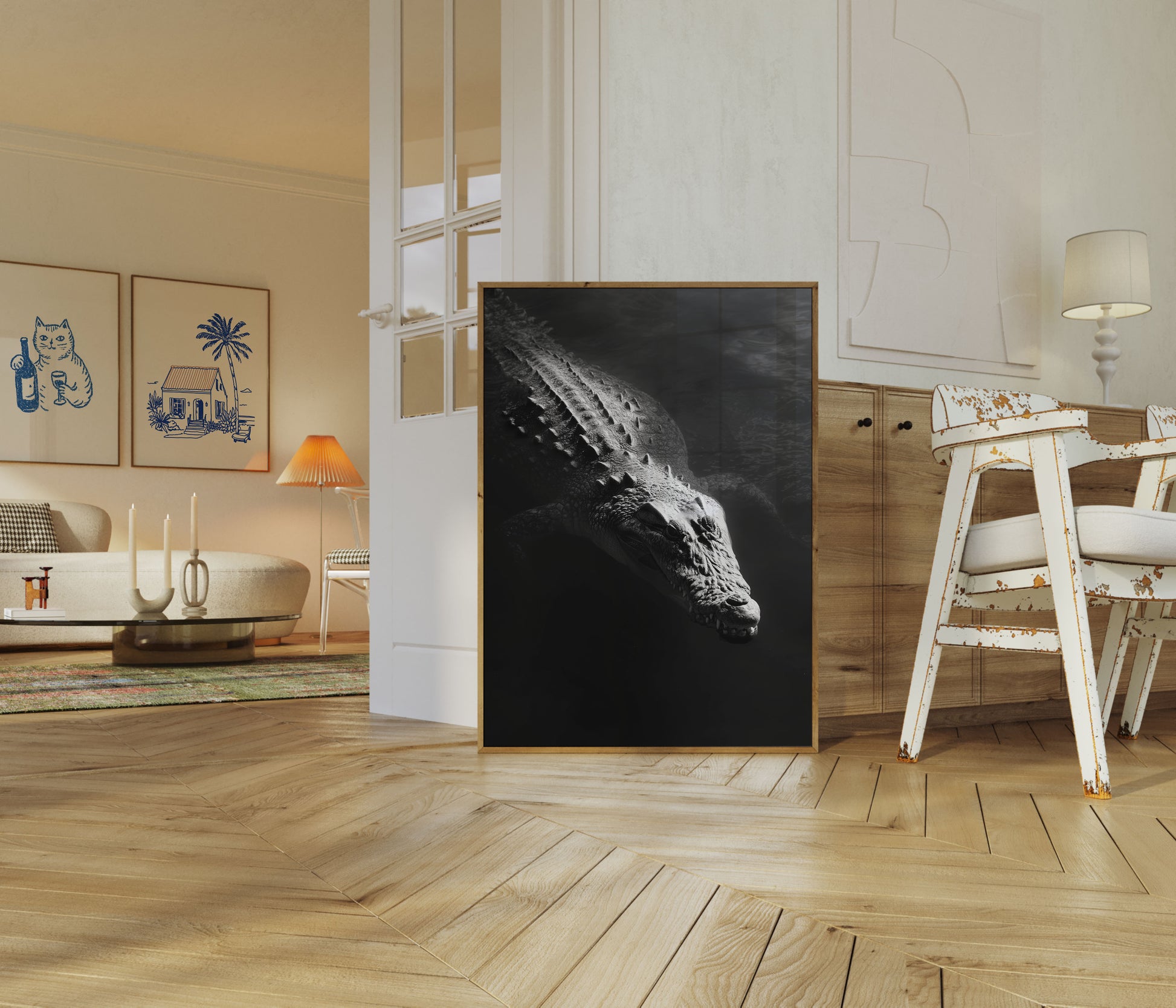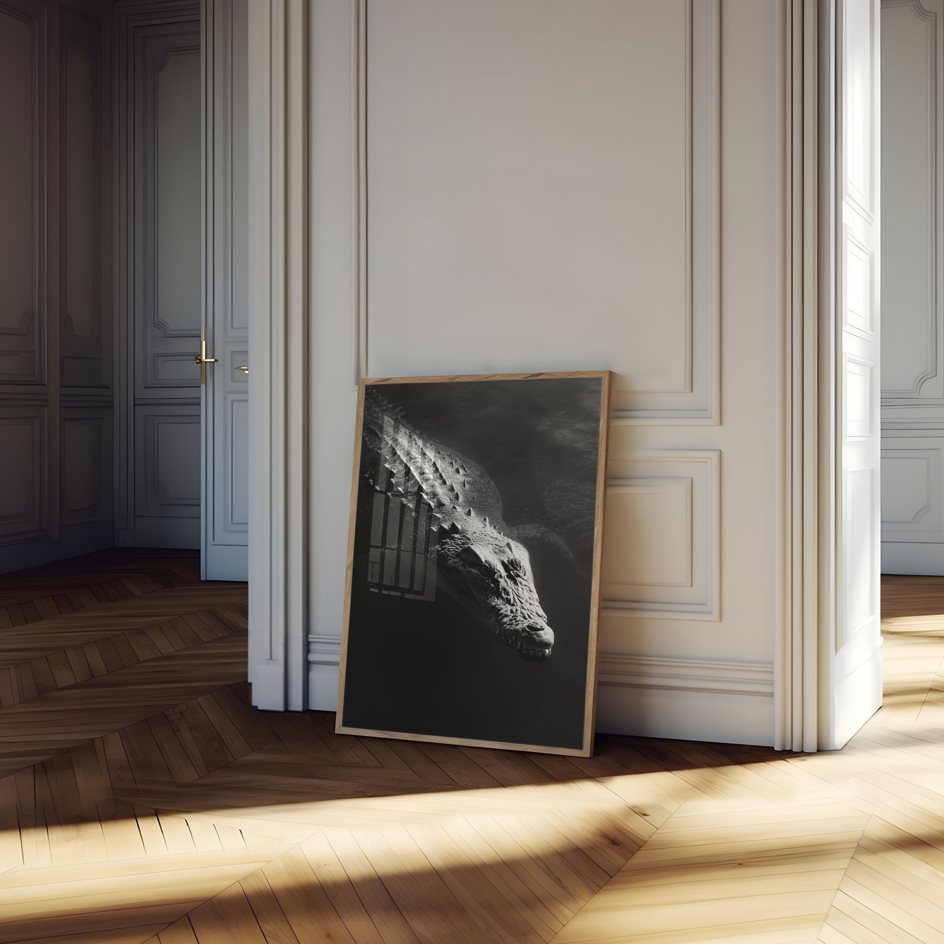 Un fascinante retrato en blanco y negro de un cocodrilo emergiendo de las profundidades sombrías. Sus escamas texturizadas y su imponente figura se capturan con impresionante detalle monocromático. La imagen revela la belleza prehistórica de este antiguo depredador, con dientes afilados como cuchillas y complejos patrones en la piel que crean una experiencia visual cautivadora y poderosa que evoca la cruda intensidad de la naturaleza.