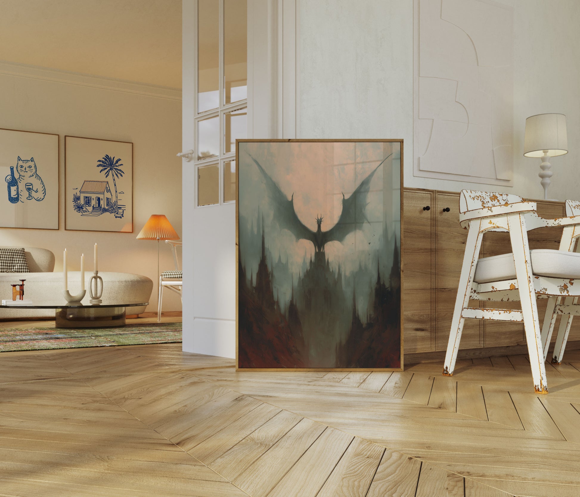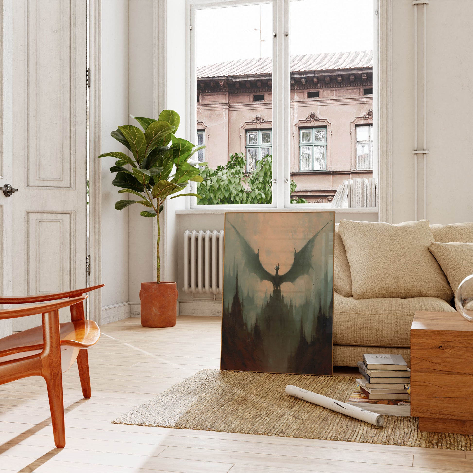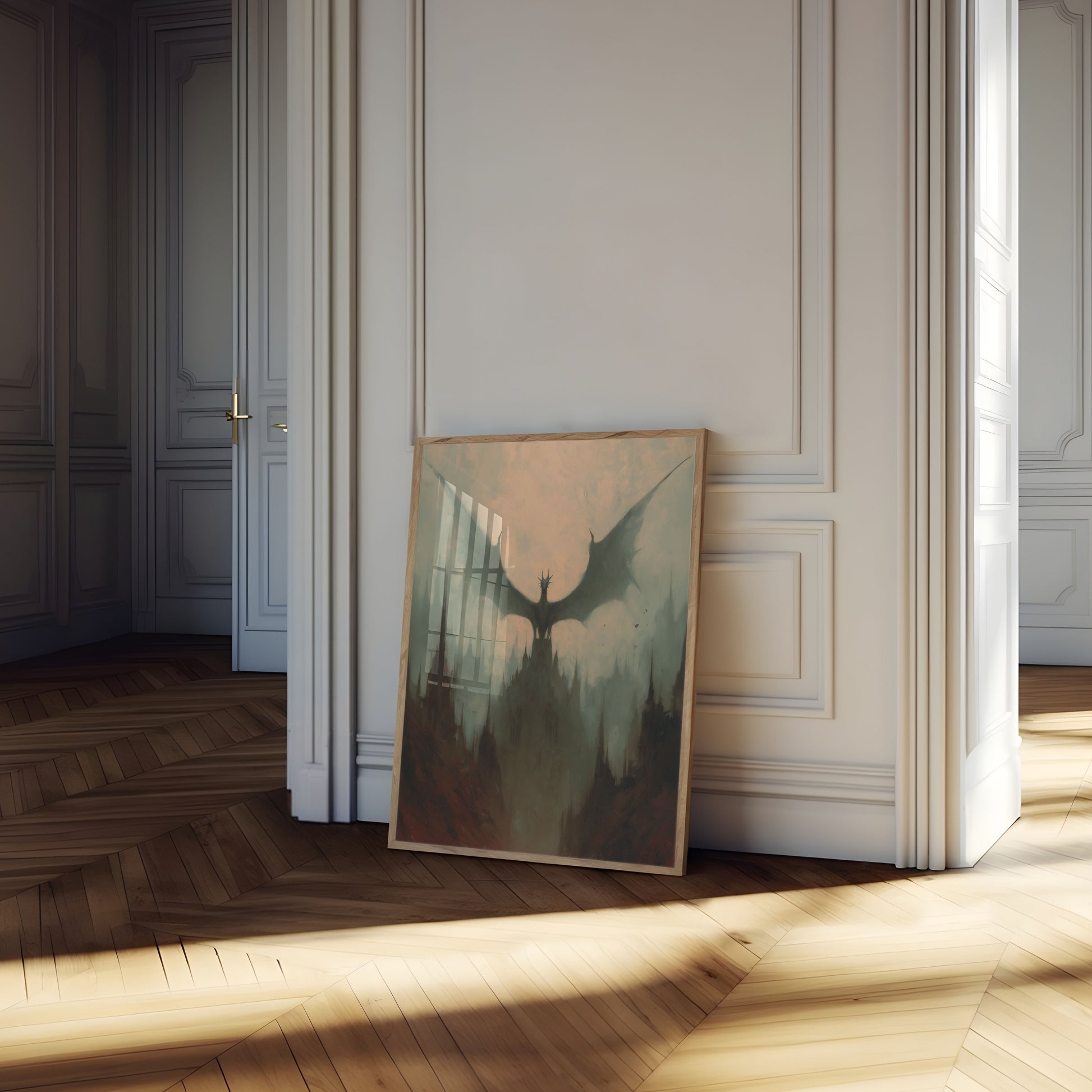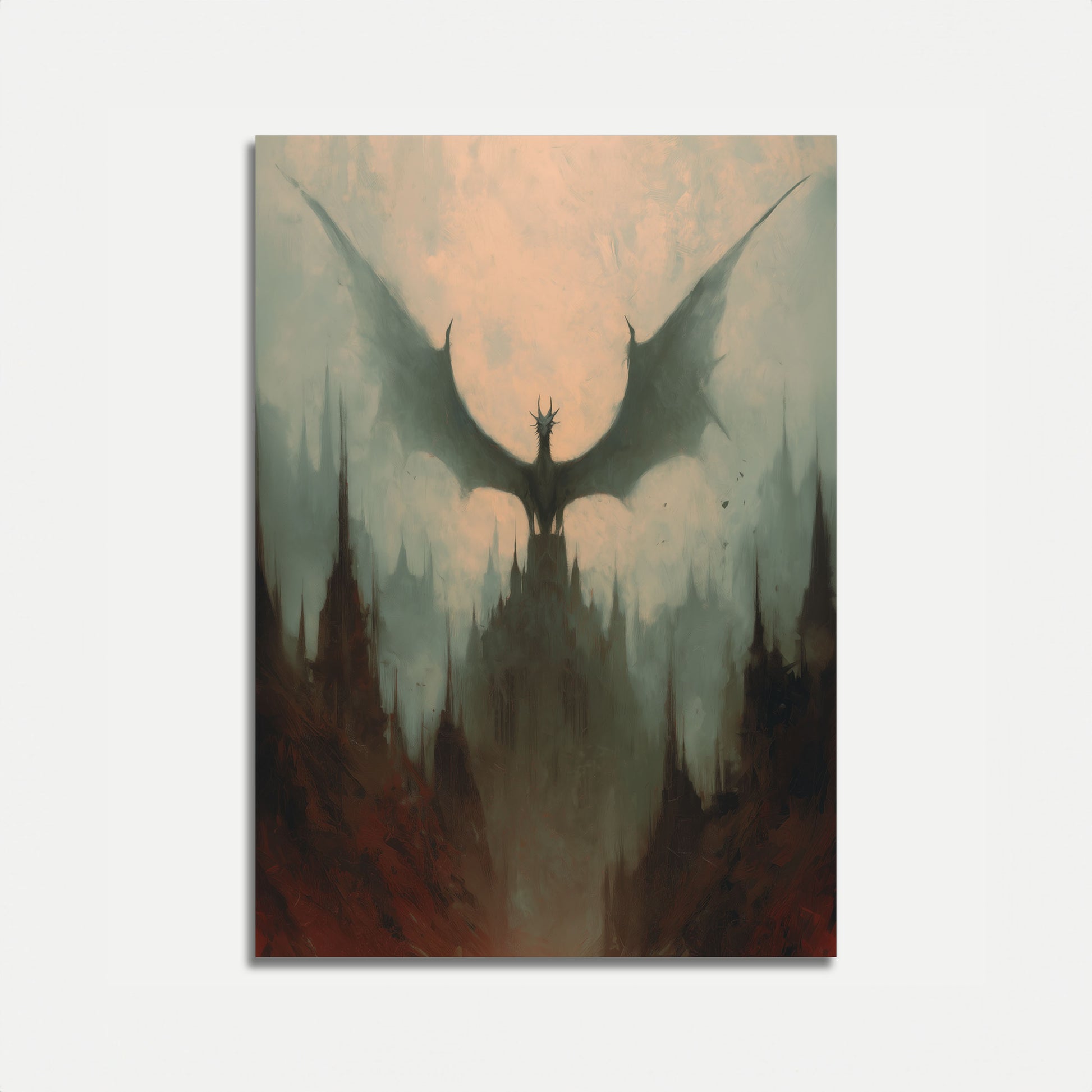 Una obra de fantasía inquietante que representa a un formidable dragón encaramado en lo alto de una aguja gótica, con sus enormes alas de murciélago extendidas sobre un fondo apagado y etéreo. Las sombrías torres de un castillo se alzan sobre un paisaje brumoso, creando una atmósfera de misterioso y melancólico poder que sumerge al espectador en un mundo de oscura fantasía medieval. La paleta de tonos verdes y óxido de la pintura evoca una sensación de amenaza ancestral y primigenia.