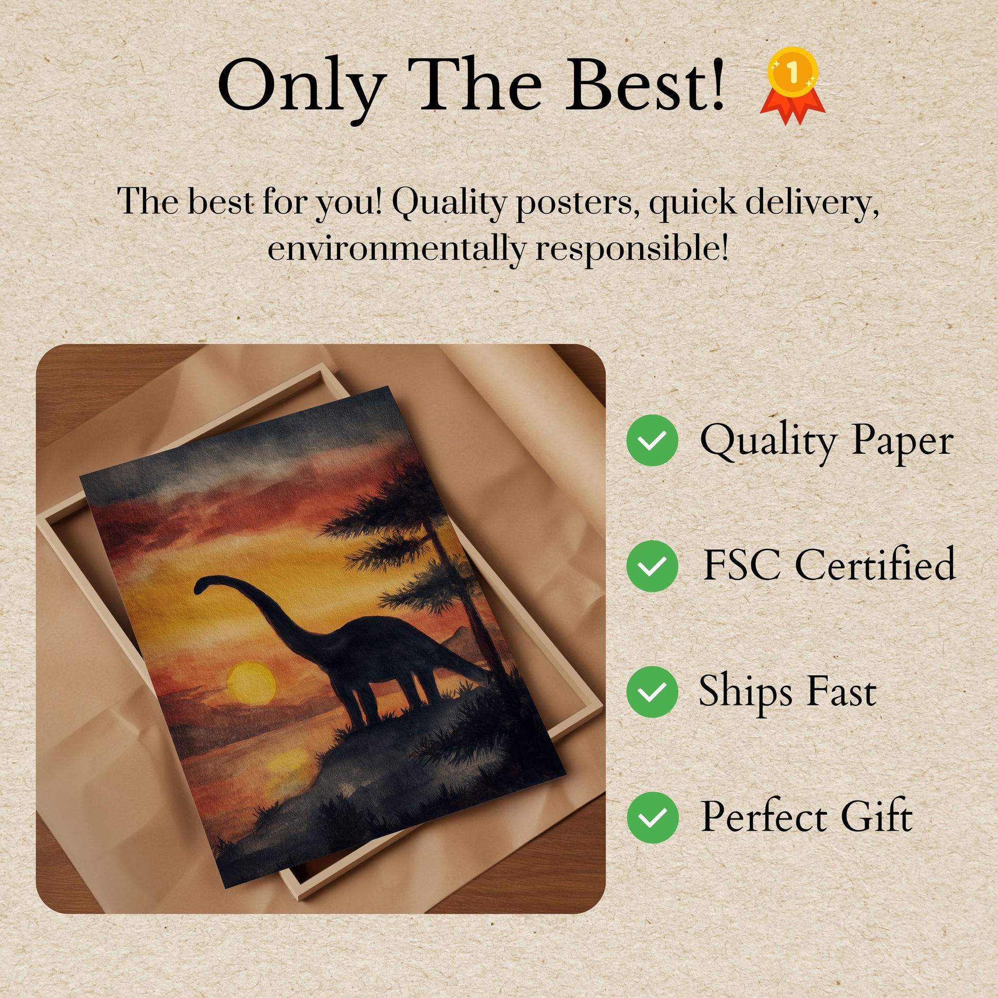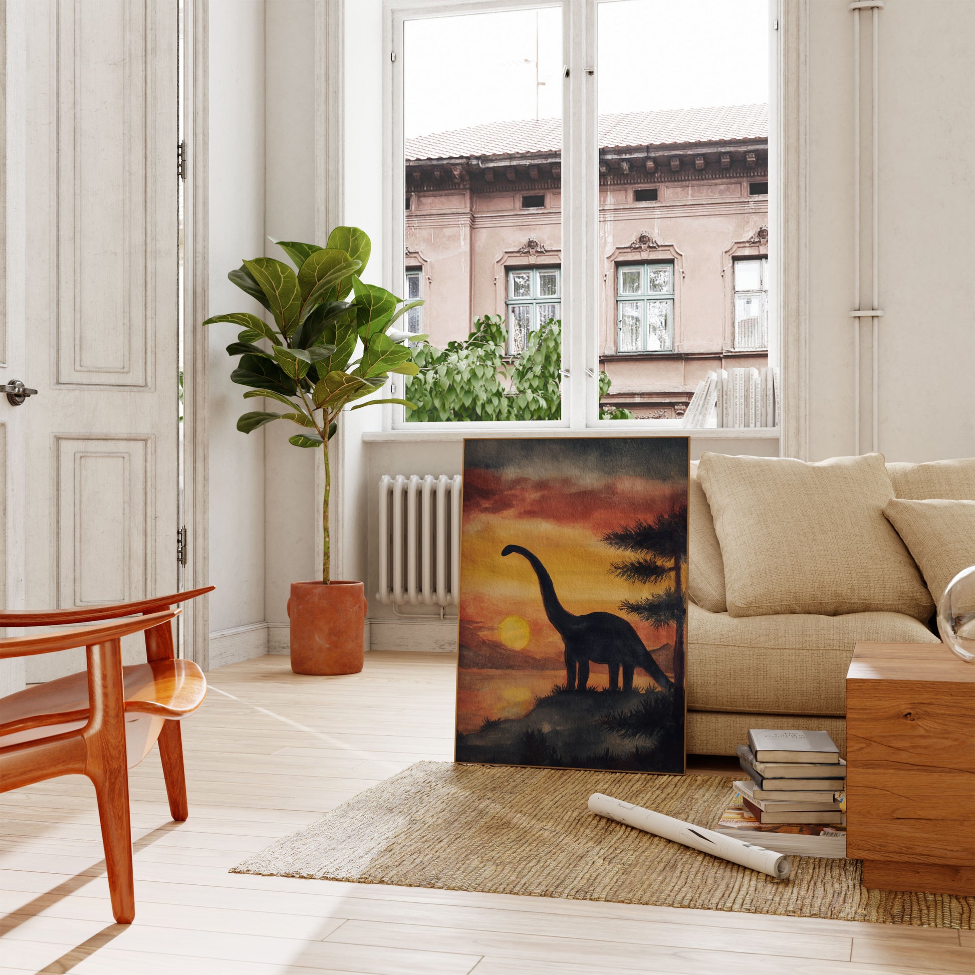 Adéntrese en un fascinante paisaje prehistórico donde un majestuoso braquiosaurio se recorta contra un dramático y ardiente atardecer. La acuarela captura un momento de tranquilidad sobrecogedor, con ricos tonos naranjas y amarillos que se funden a la perfección en el cielo, proyectando un cálido resplandor sobre antiguos pinos y un misterioso horizonte lejano. Esta encantadora escena transporta al espectador a un mundo donde los dinosaurios vagan y la belleza de la naturaleza no conoce límites.