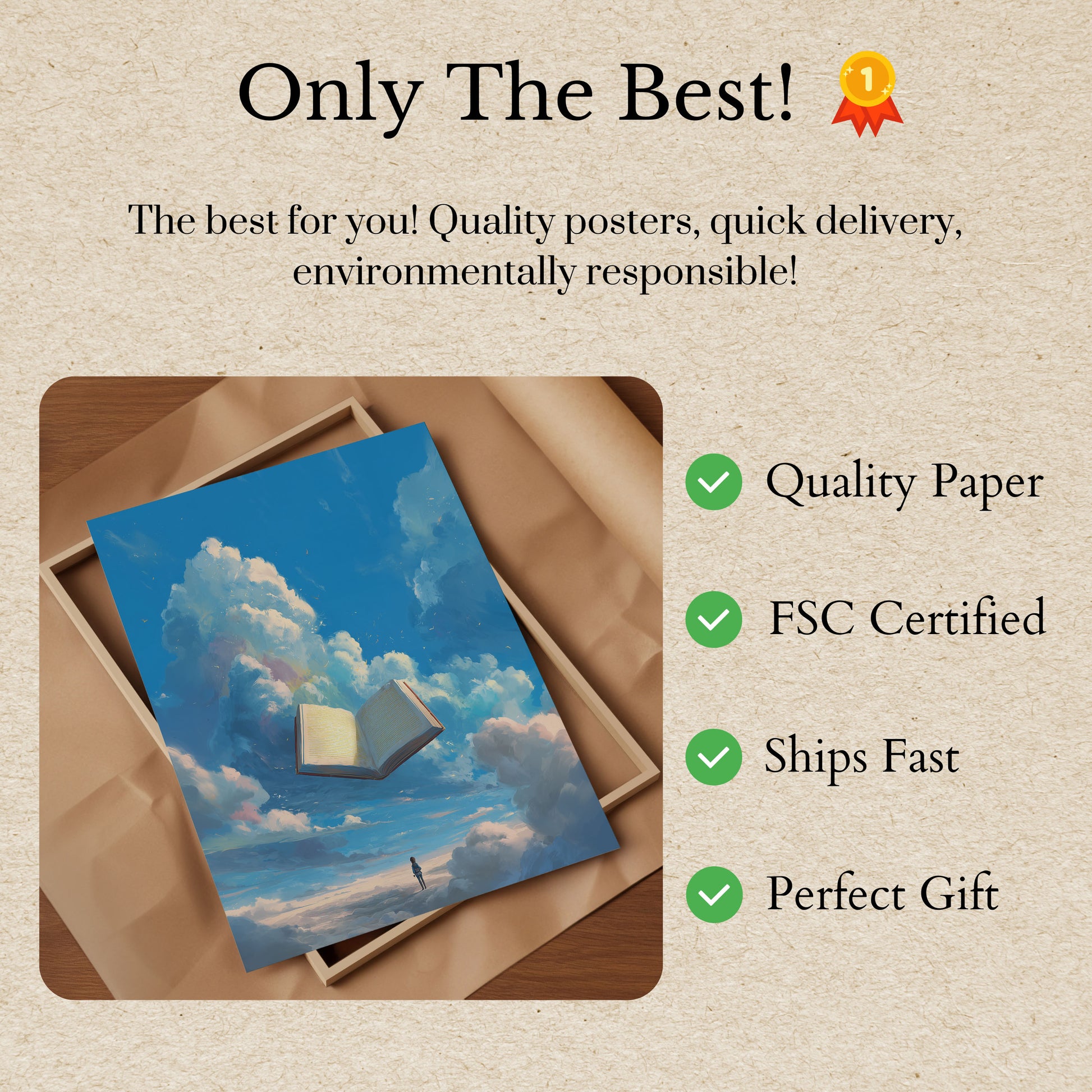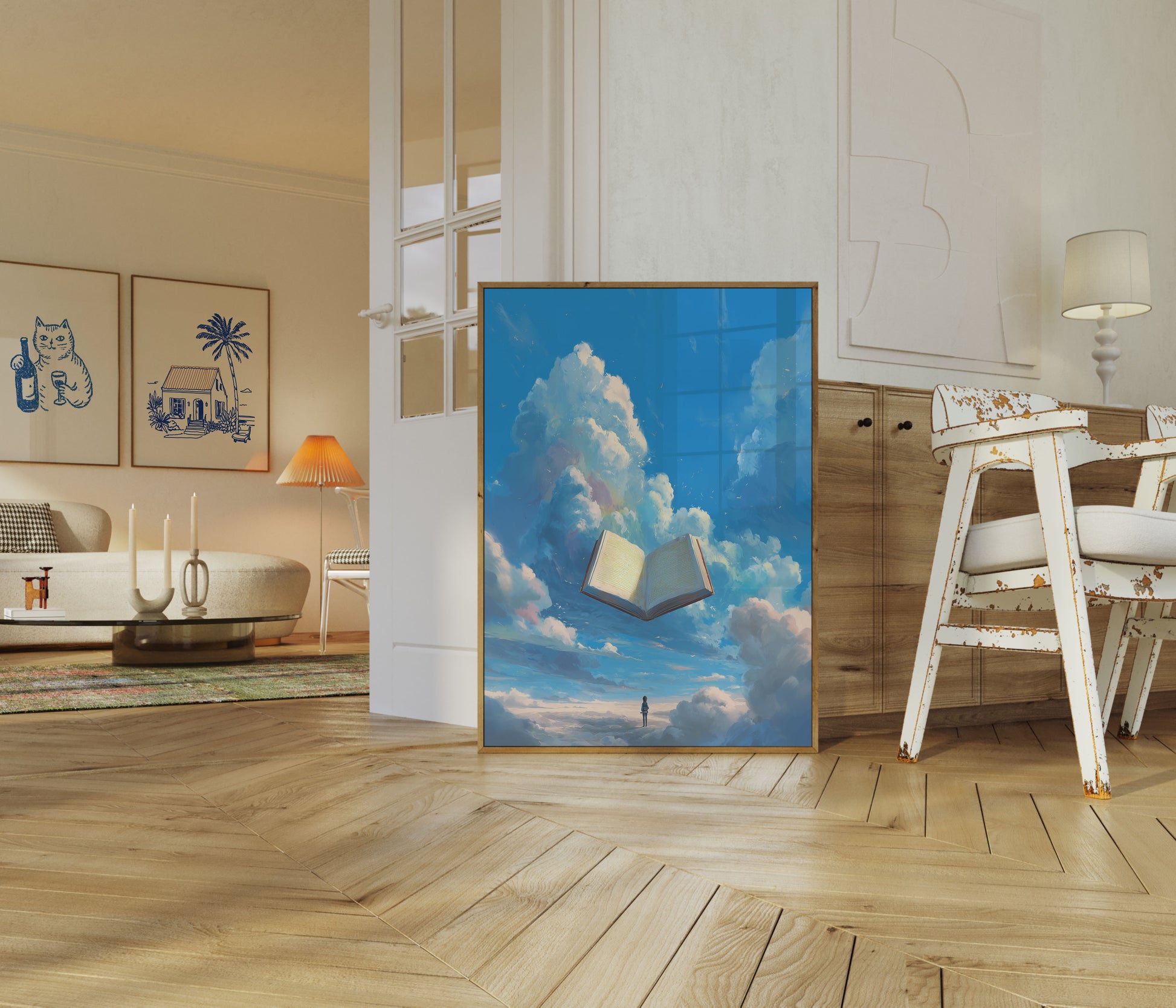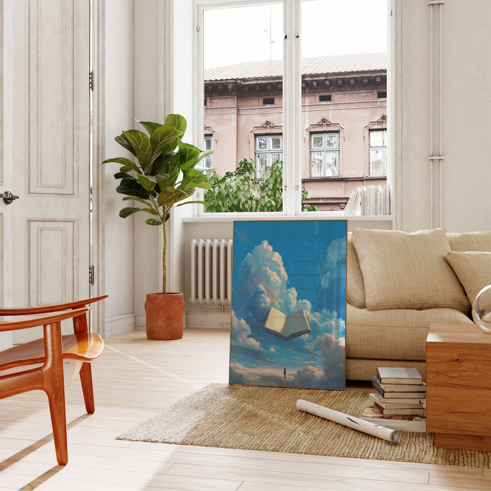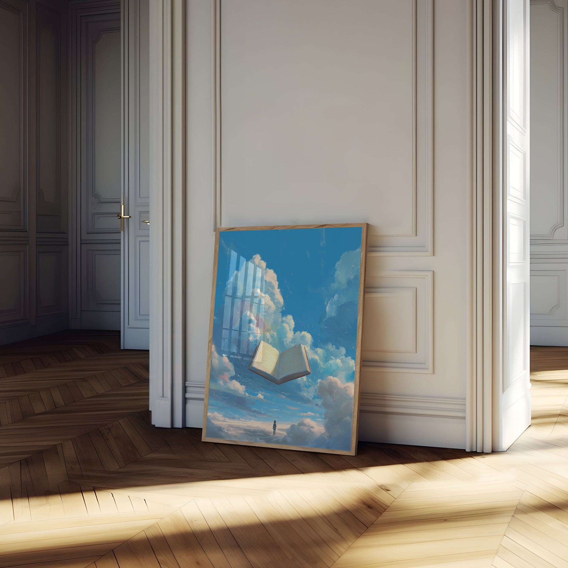 Sumérgete en un viaje visual impresionante donde un libro abierto y luminoso flota majestuosamente entre nubes ondulantes contra un cielo azul sereno. Una figura solitaria se yergue debajo, contemplando el símbolo trascendental de la sabiduría y la iluminación. Esta inspiradora obra de arte captura el poder transformador del conocimiento, invitando al espectador a explorar los inmensos reinos de la imaginación y la comprensión espiritual.