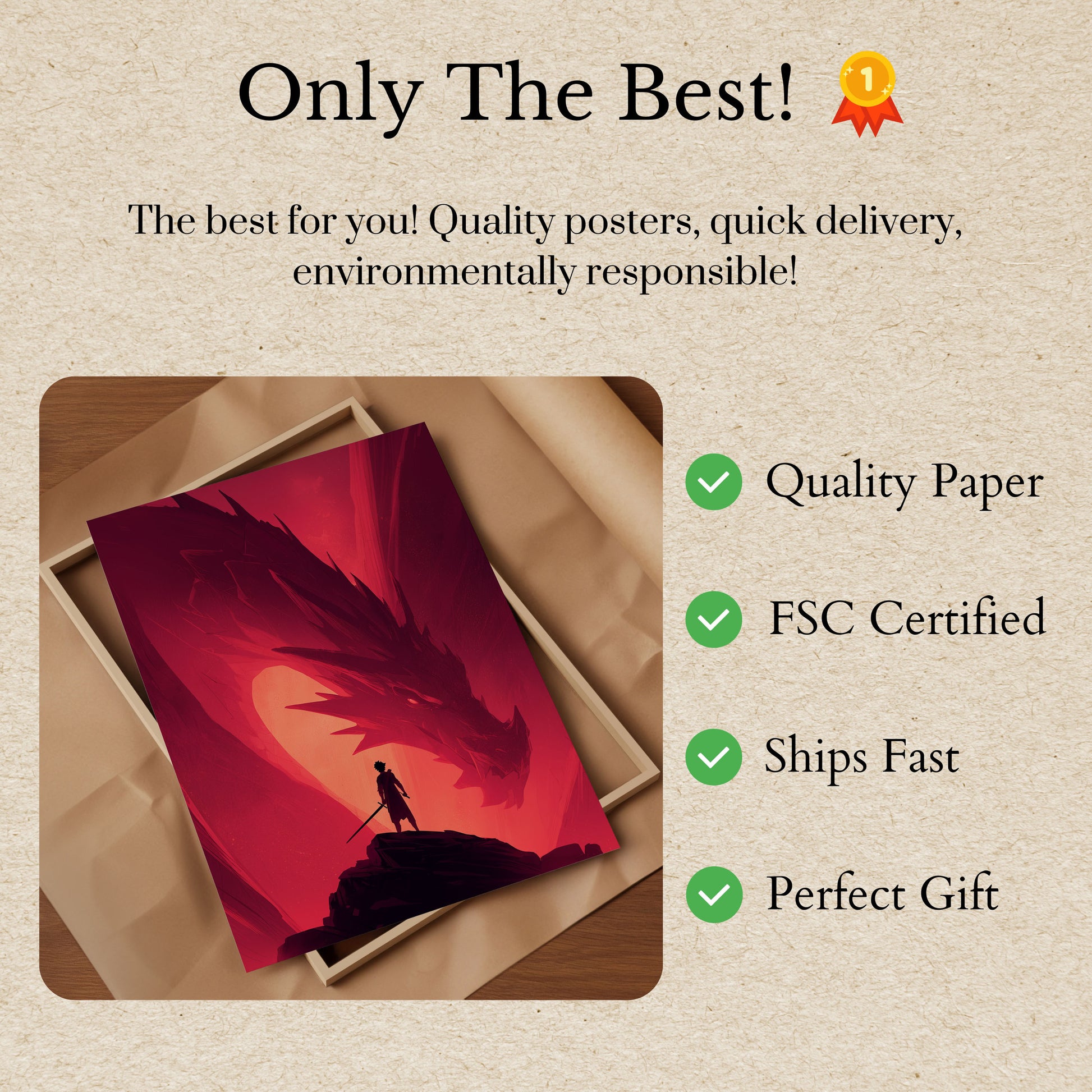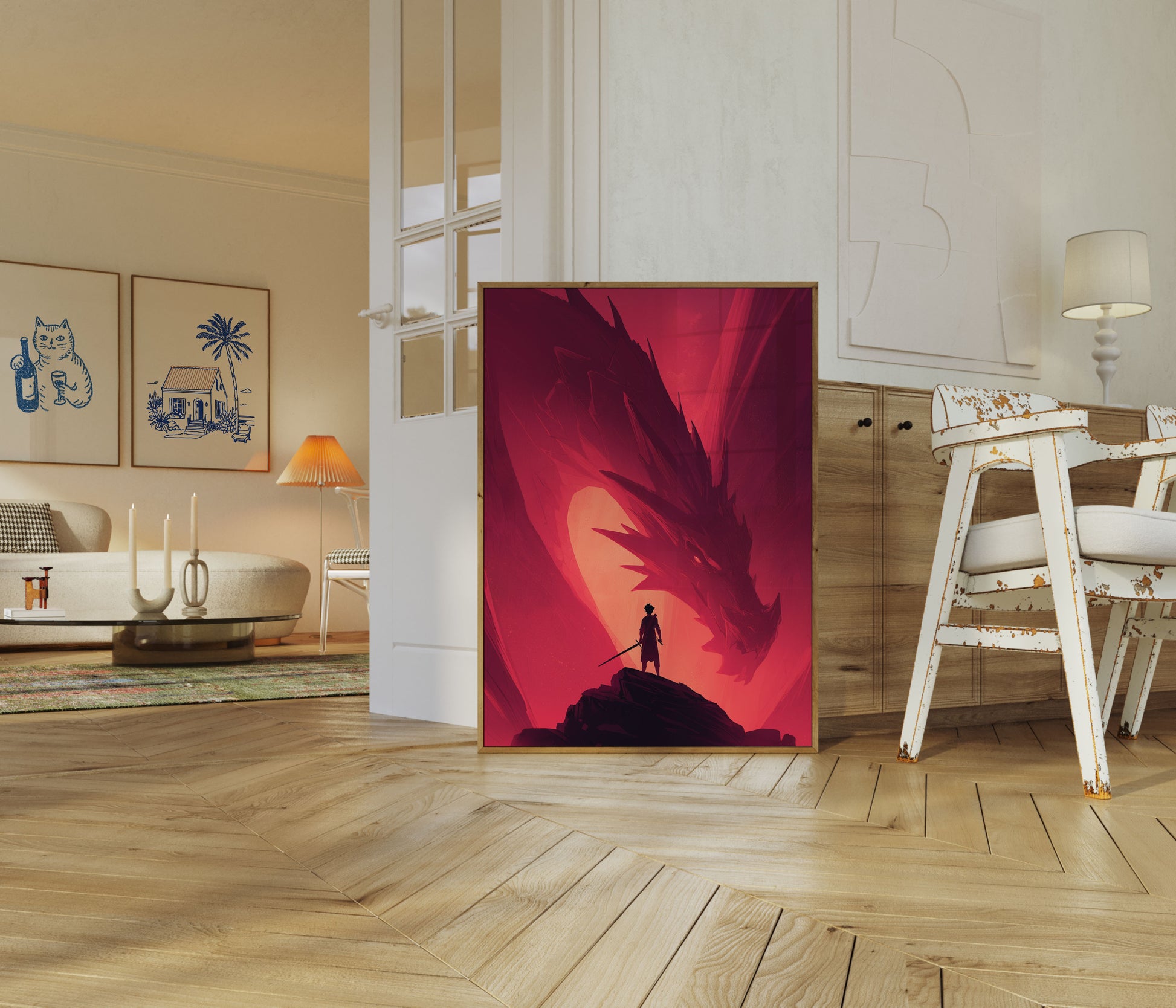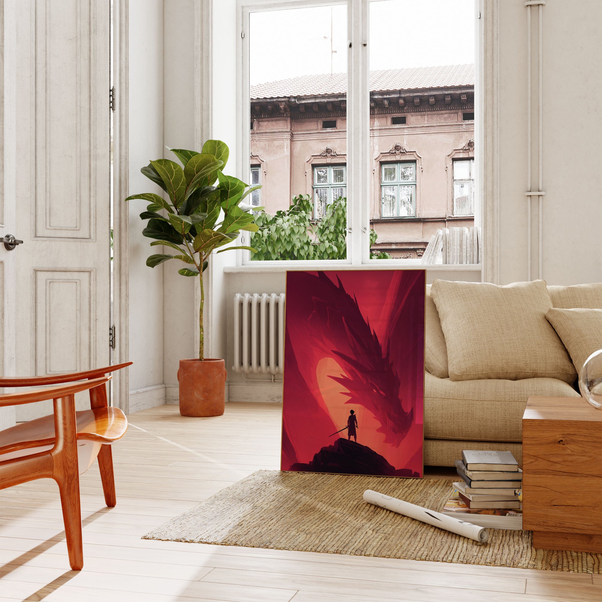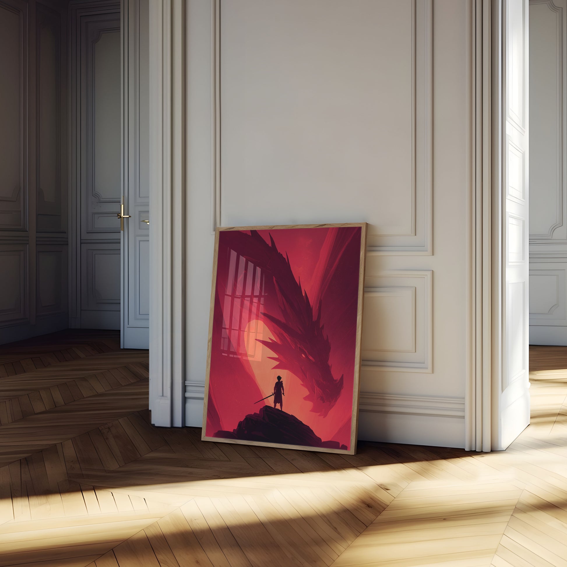 Una impresionante escena carmesí captura un enfrentamiento épico entre un guerrero solitario y un enorme y amenazante dragón. Recortada sobre un fondo rojo intenso, la figura solitaria se yergue desafiante sobre un afloramiento rocoso, espada en mano, frente a la enorme criatura serpentina que domina el paisaje. La intensa paleta de colores rojo y naranja crea una sensación de poder puro, conflicto y batalla inminente que cautivará a cualquier amante del arte fantástico.