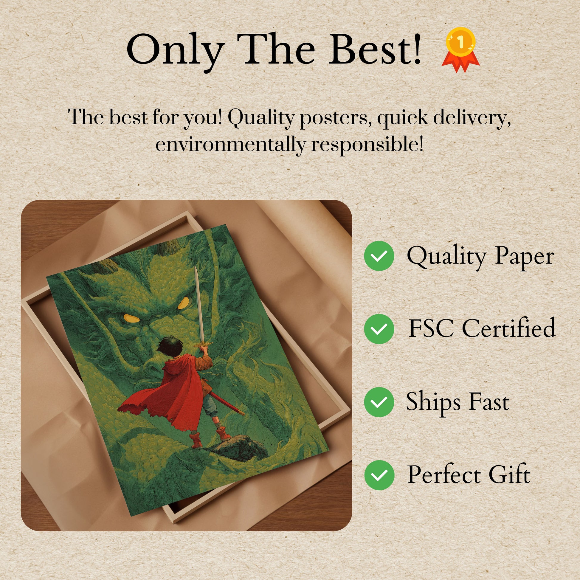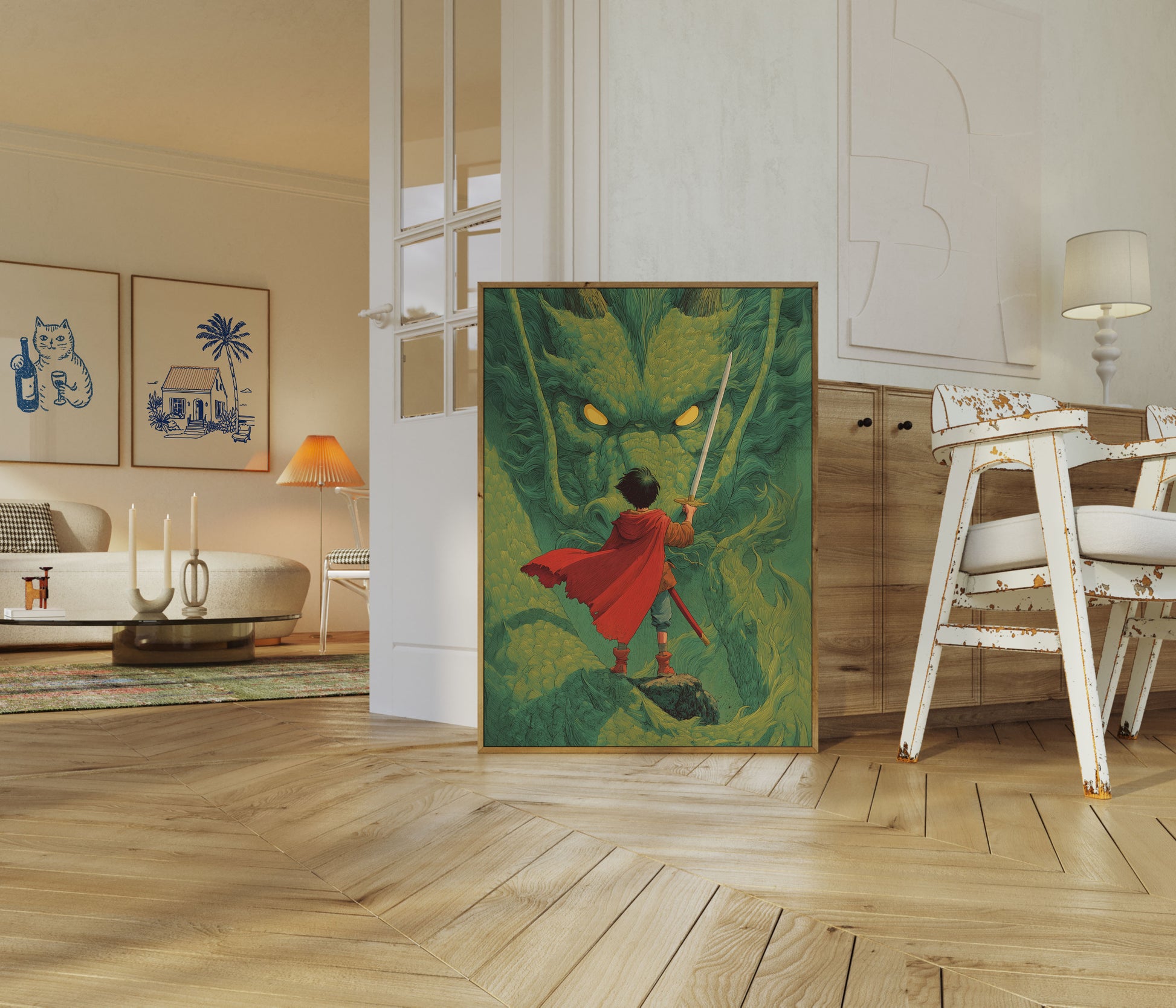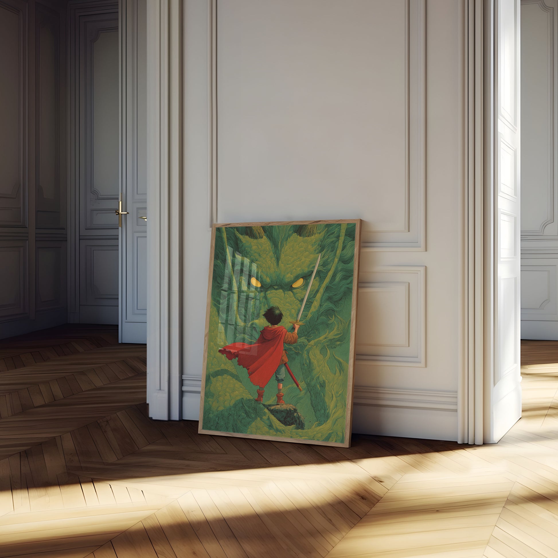 Adéntrate en un fascinante mundo de fantasía donde un valiente guerrero con una capa carmesí se yergue desafiante ante un enorme dragón serpenteante. La obra captura un momento épico de tensión, con el héroe blandiendo una espada reluciente contra un enorme dragón con textura de escamas que emerge de un fondo verde y amarillo que gira. Los intensos ojos amarillos del dragón atraviesan la escena, creando un momento sobrecogedor de potencial batalla y desafío heroico.