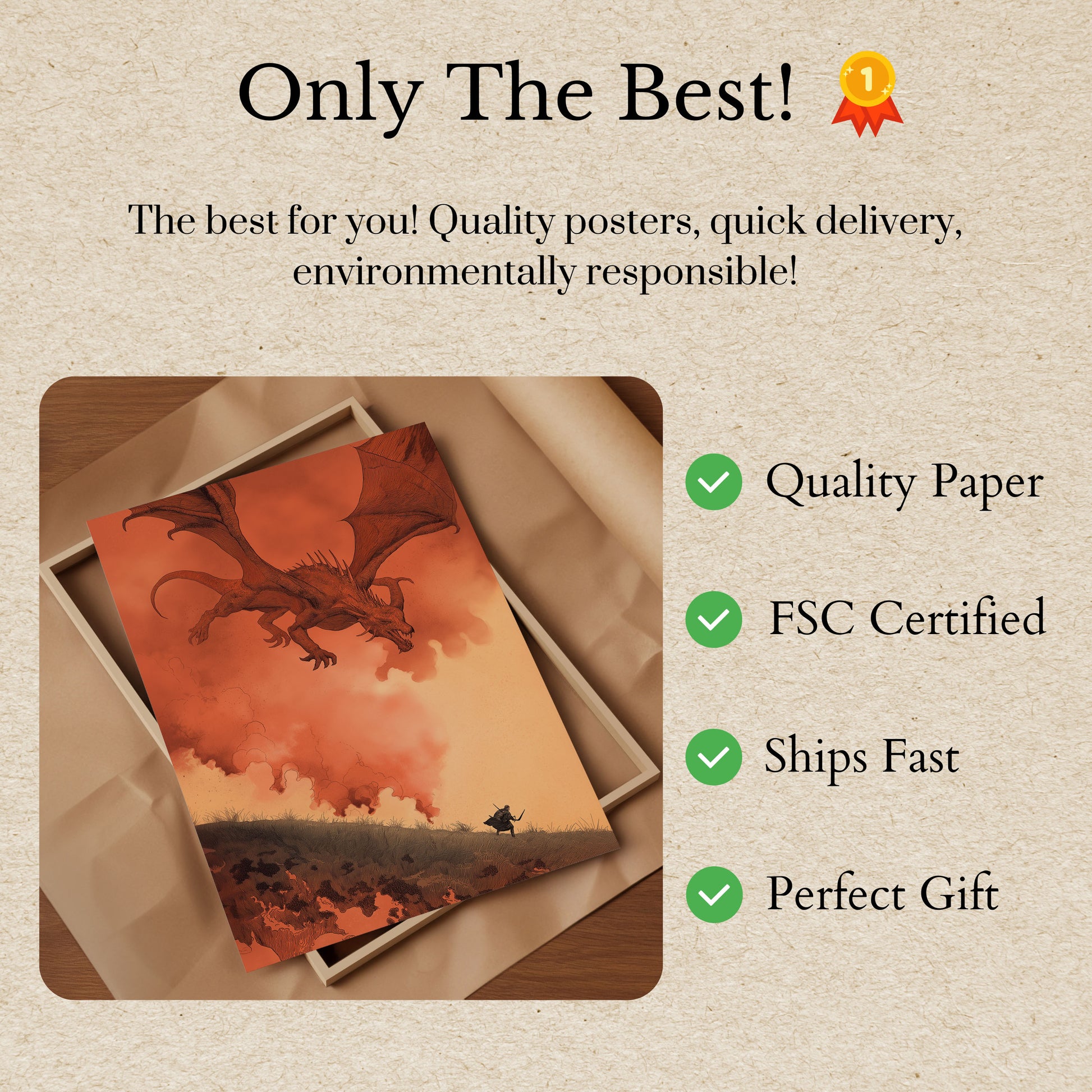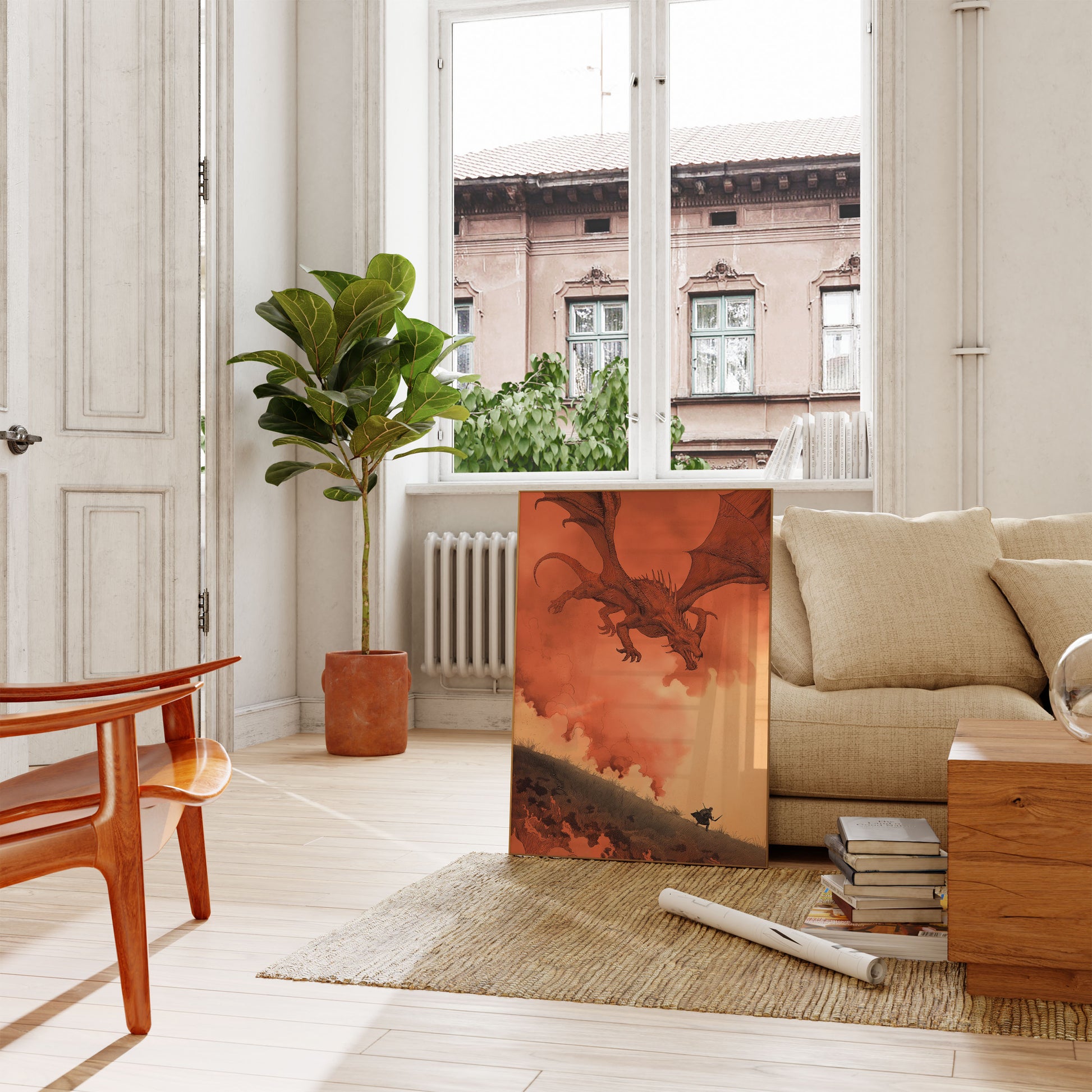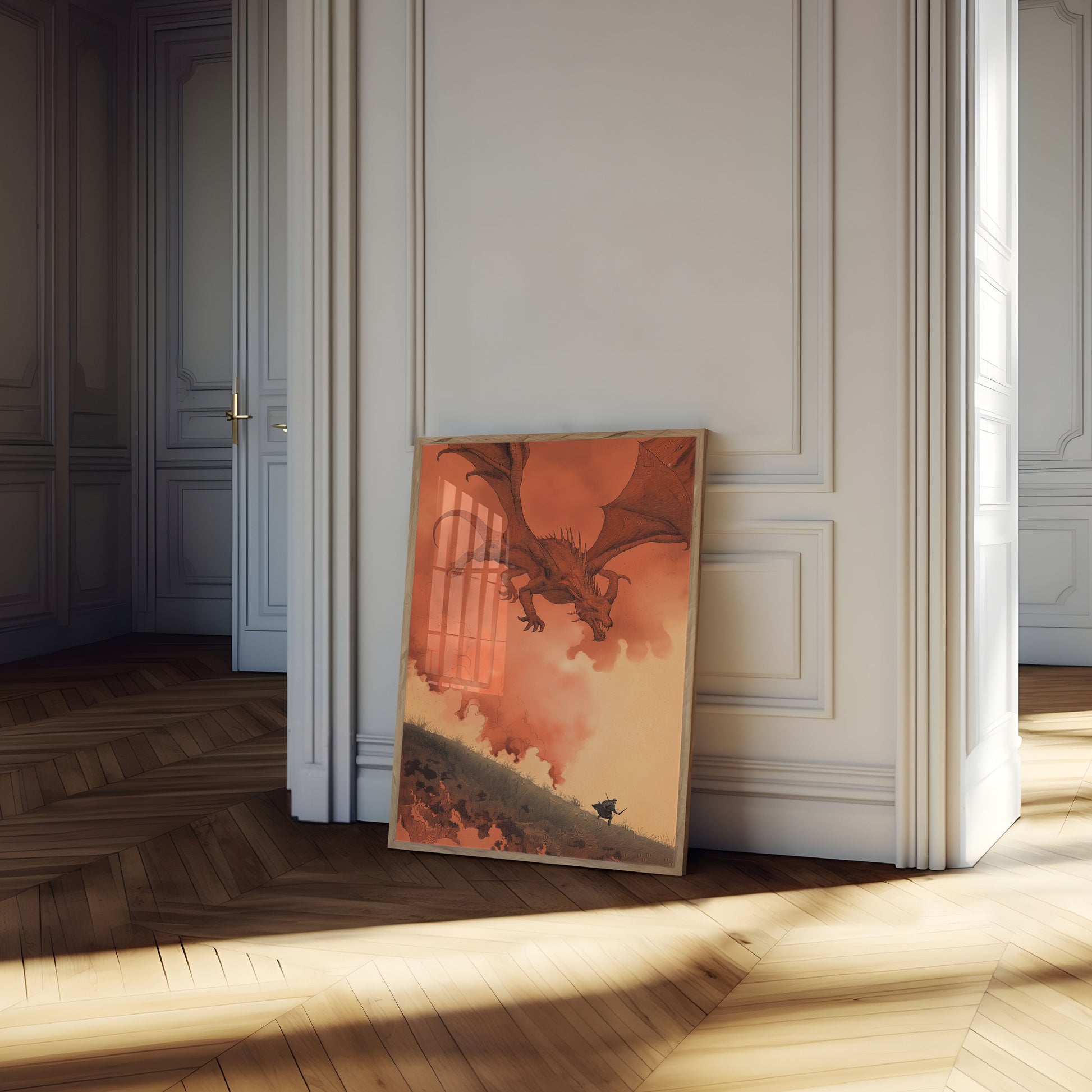 Una fascinante obra de arte de fantasía que representa a un amenazante dragón surcando un cielo naranja abrasador, proyectando una sombra siniestra sobre un paisaje en llamas. El intrincado trazo y la paleta de colores cálidos e intensos crean una dramática escena de conflicto mítico, con una figura solitaria corriendo para sobrevivir por una ladera envuelta en humo. Este póster captura la fuerza bruta y la intensidad apocalíptica de un legendario encuentro con un dragón.