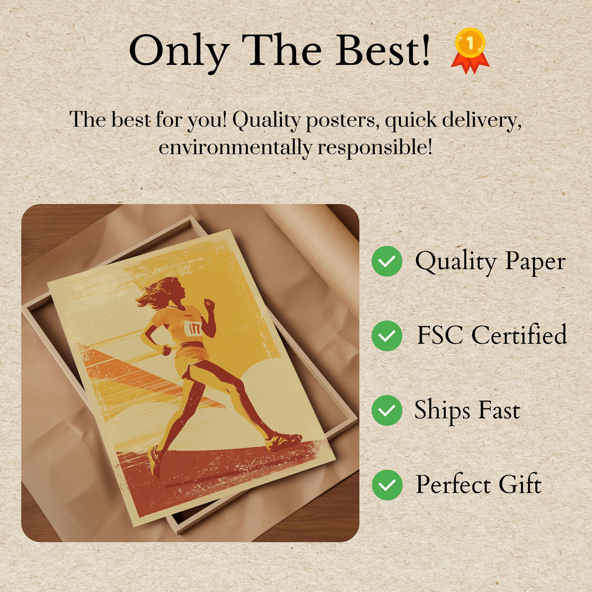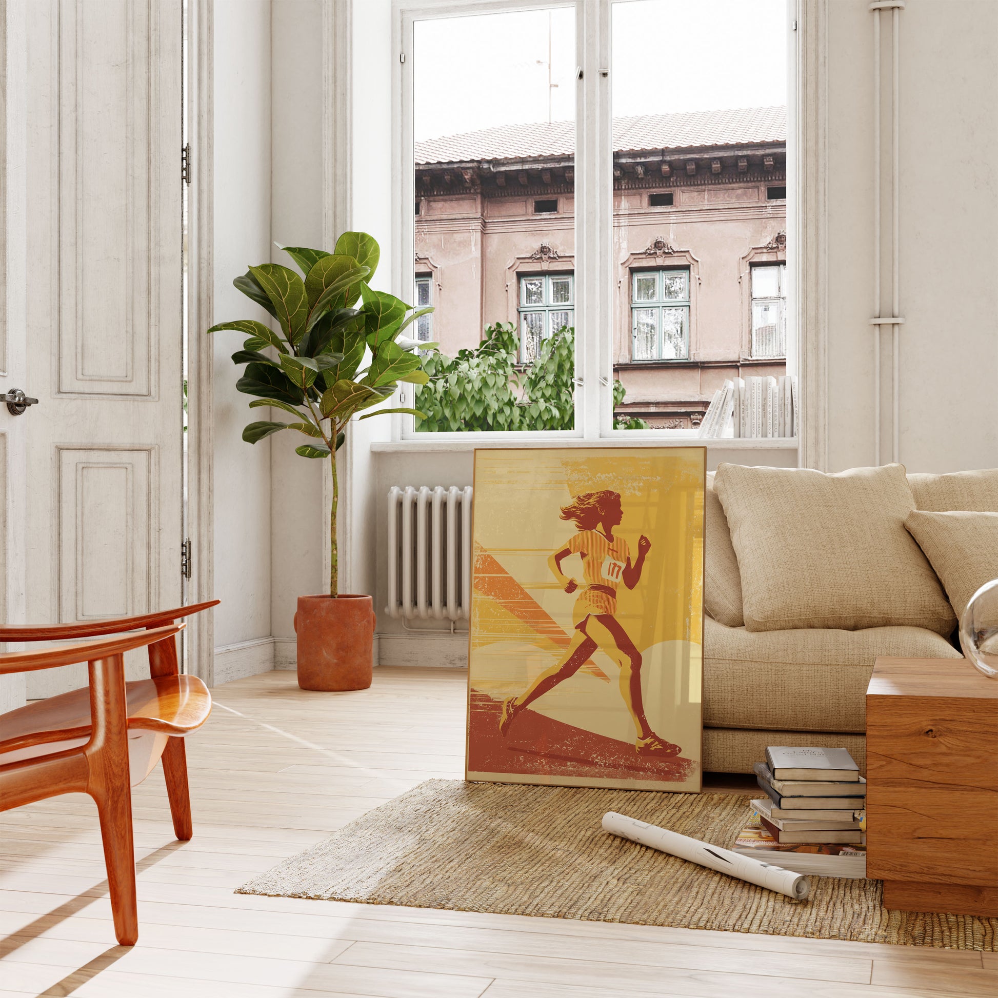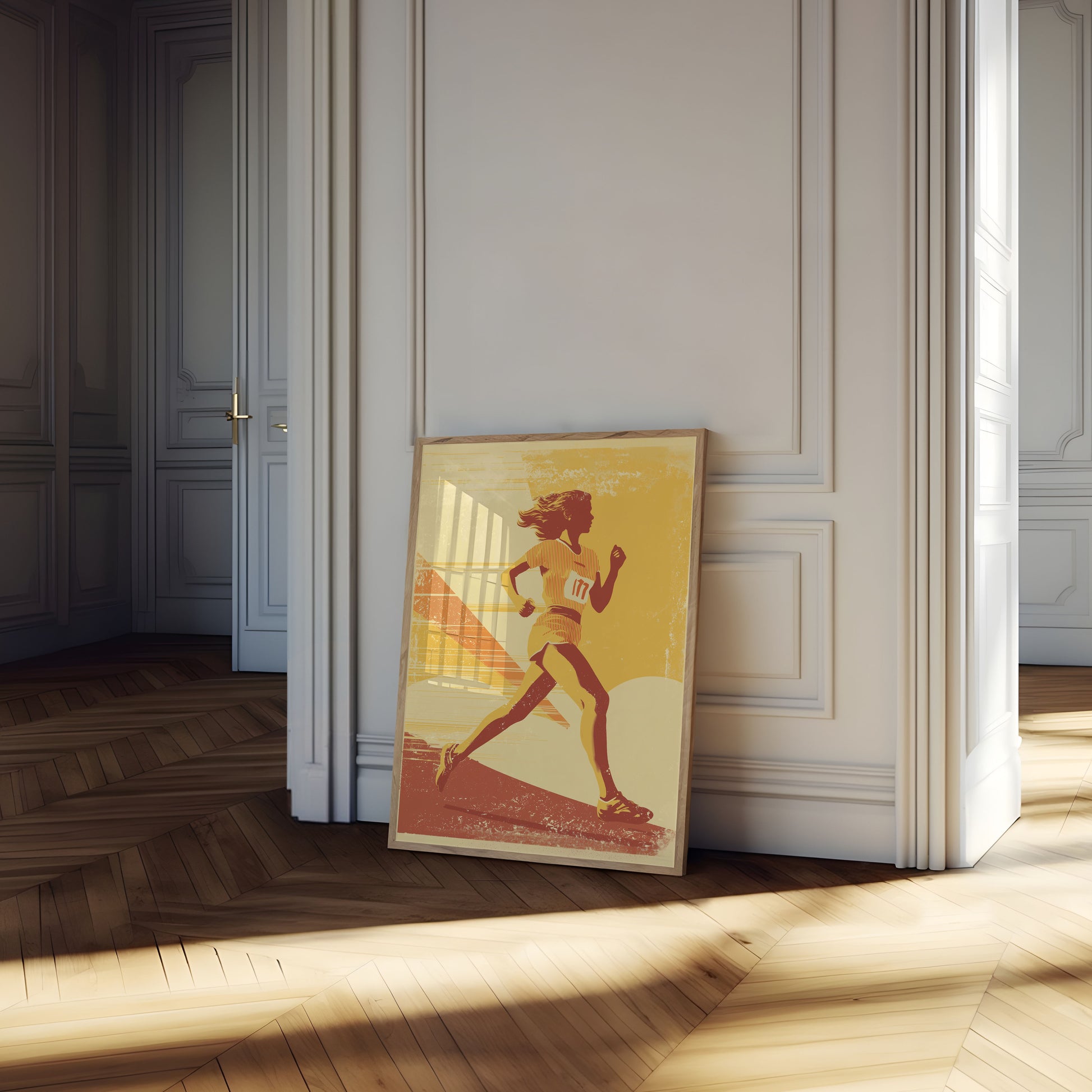 Capture the essence of athletic determination with this vibrant vintage-inspired running poster. Rendered in warm sunset hues of yellow, orange, and red, the silhouetted runner embodies motion and energy, with dynamic lines suggesting speed and momentum. The retro graphic style and textured overlay create a powerful visual celebration of athletic achievement and personal endurance.