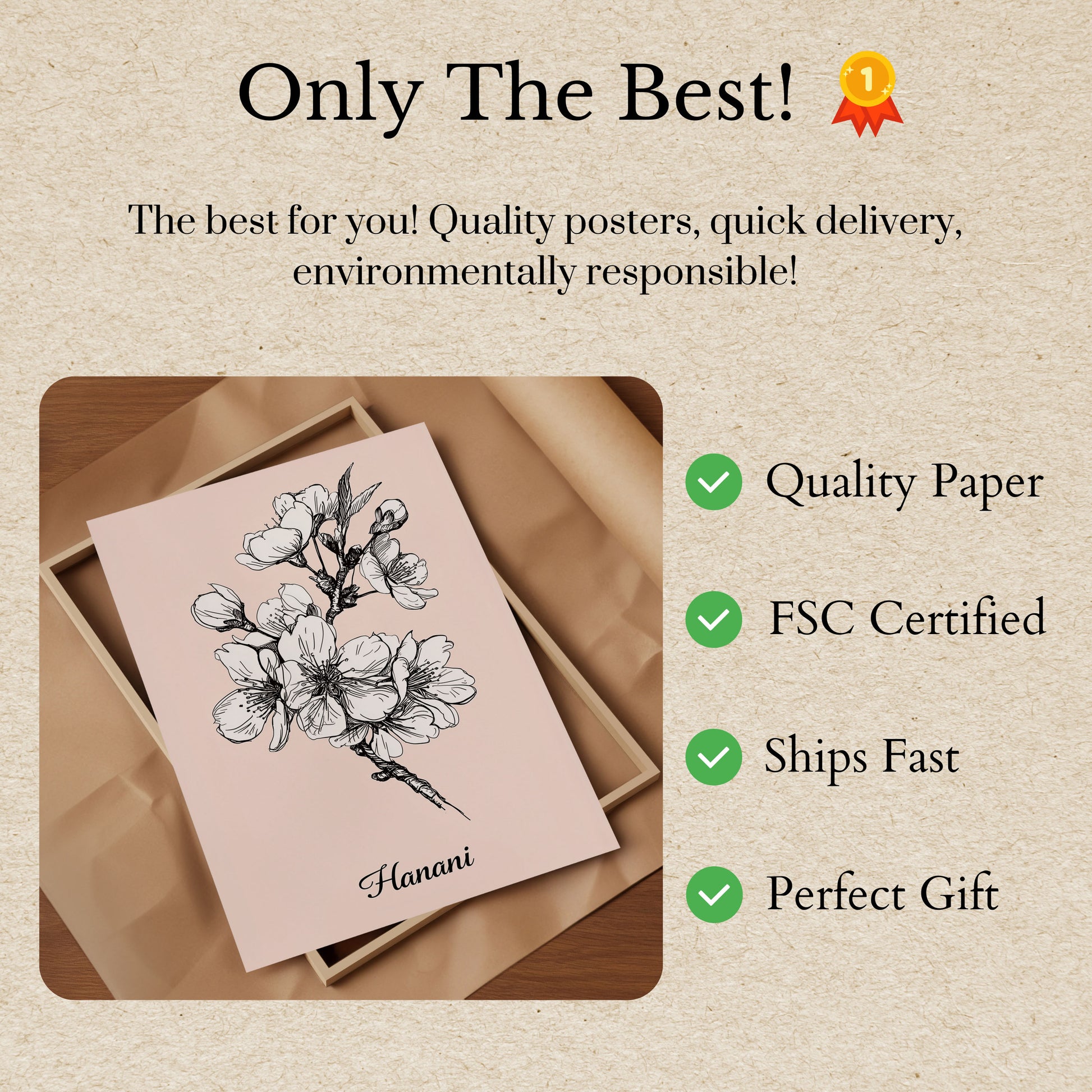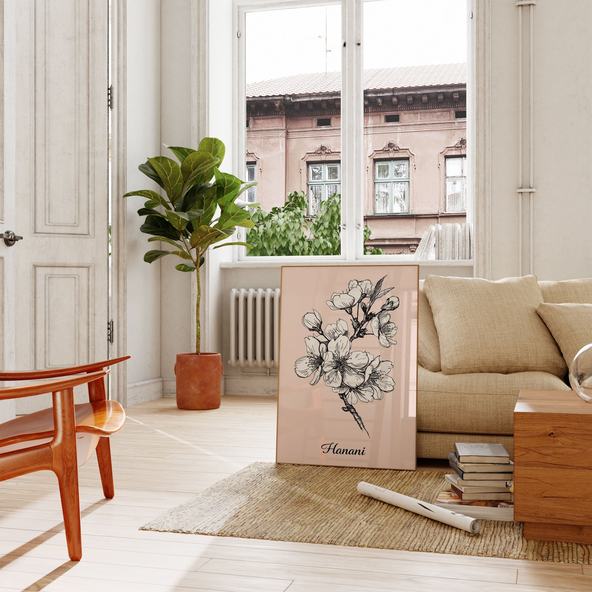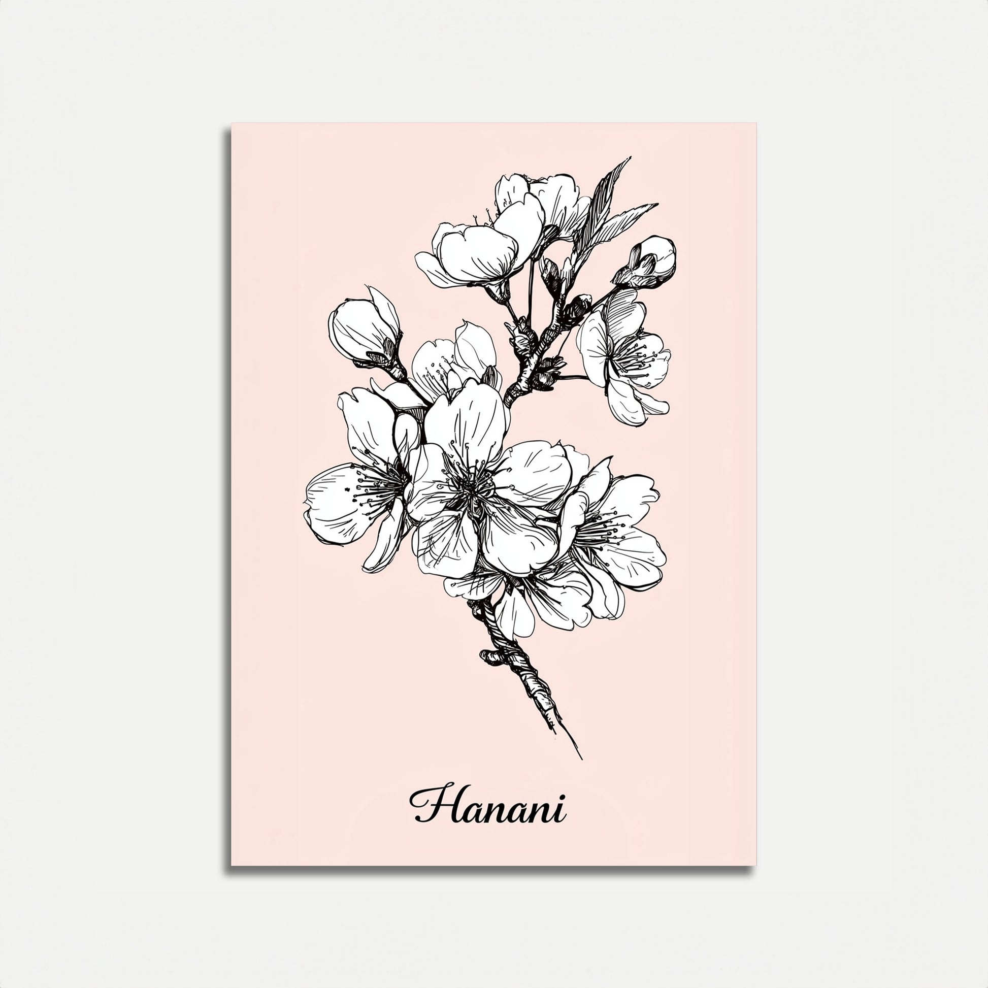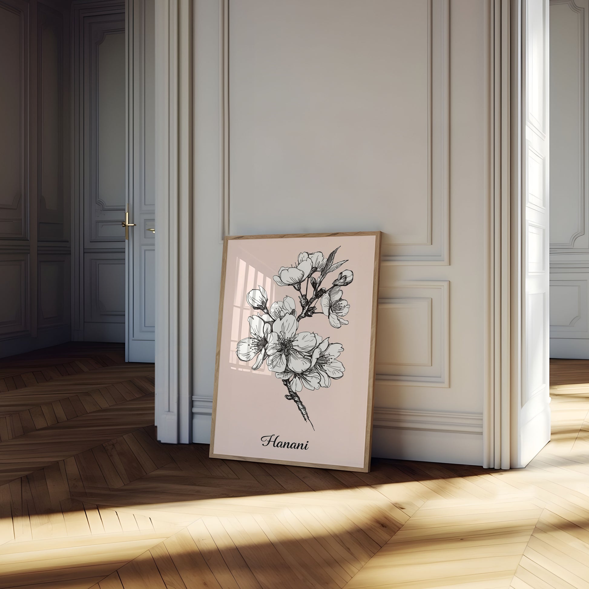Descubra la delicada belleza del arte botánico de inspiración japonesa con esta exquisita ilustración de flores Hanani. Representado en un impresionante blanco y negro, el detallado boceto captura los suaves e intrincados pétalos y los delicados estambres de una rama floreciente sobre un delicado fondo rosado. Esta impresión artística aporta tranquilidad y gracia natural a cualquier espacio interior, ideal para quienes aprecian el diseño botánico minimalista.