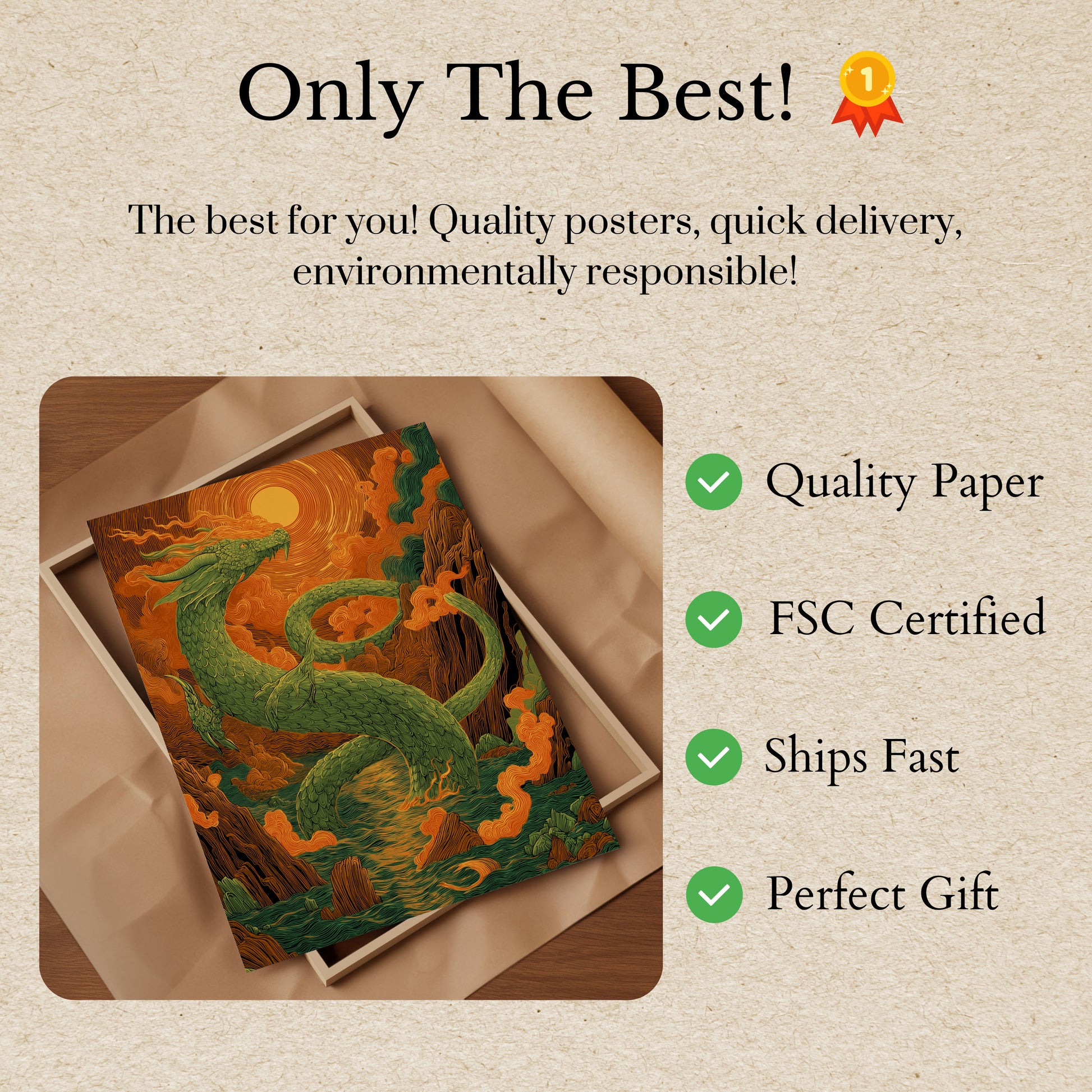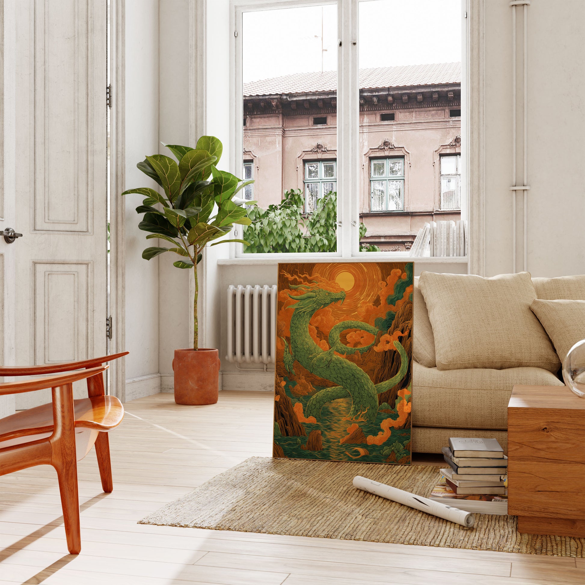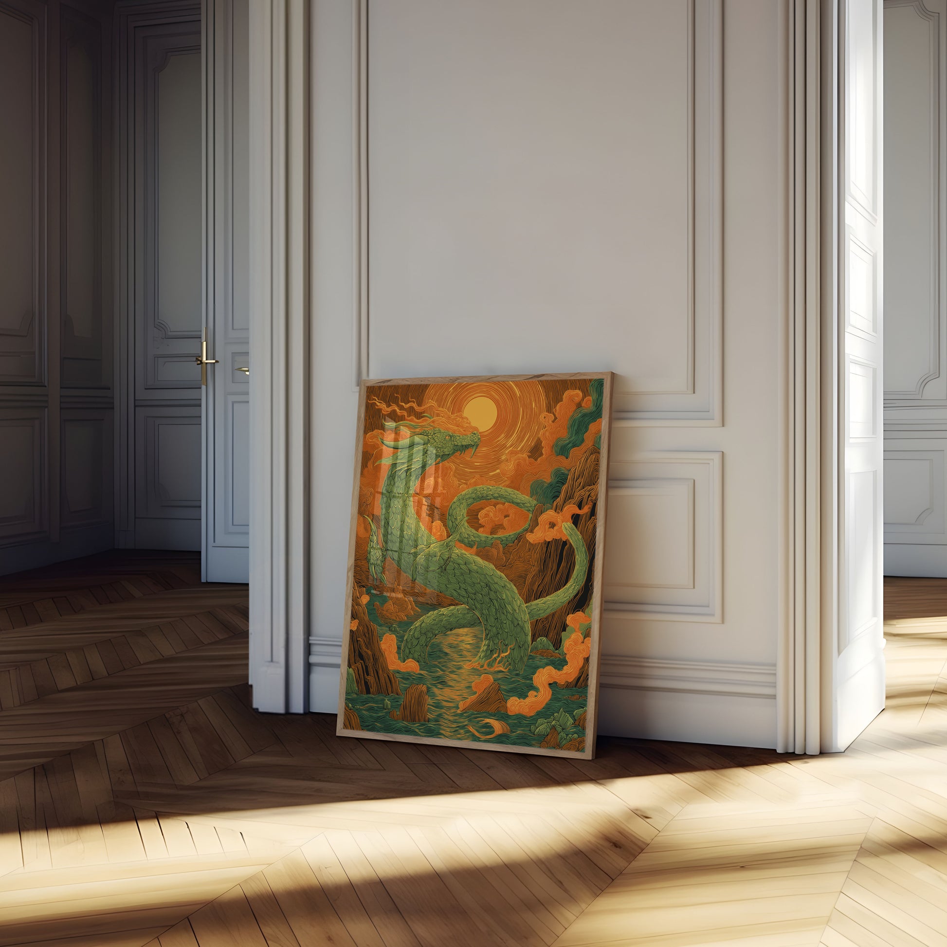 Sumérgete en un fascinante mundo de maravillas míticas con esta impresionante ilustración de dragón, donde una magnífica criatura serpenteante y verde serpentea por un paisaje de vibrantes tonos naranjas y dorados. La obra captura una puesta de sol sobrenatural, con el cuerpo escamoso del dragón curvándose elegantemente sobre un fondo de nubes en espiral y un brillante sol circular. Las líneas ricas y texturizadas crean una sensación de movimiento y energía que sumerge al espectador en este reino fantástico.