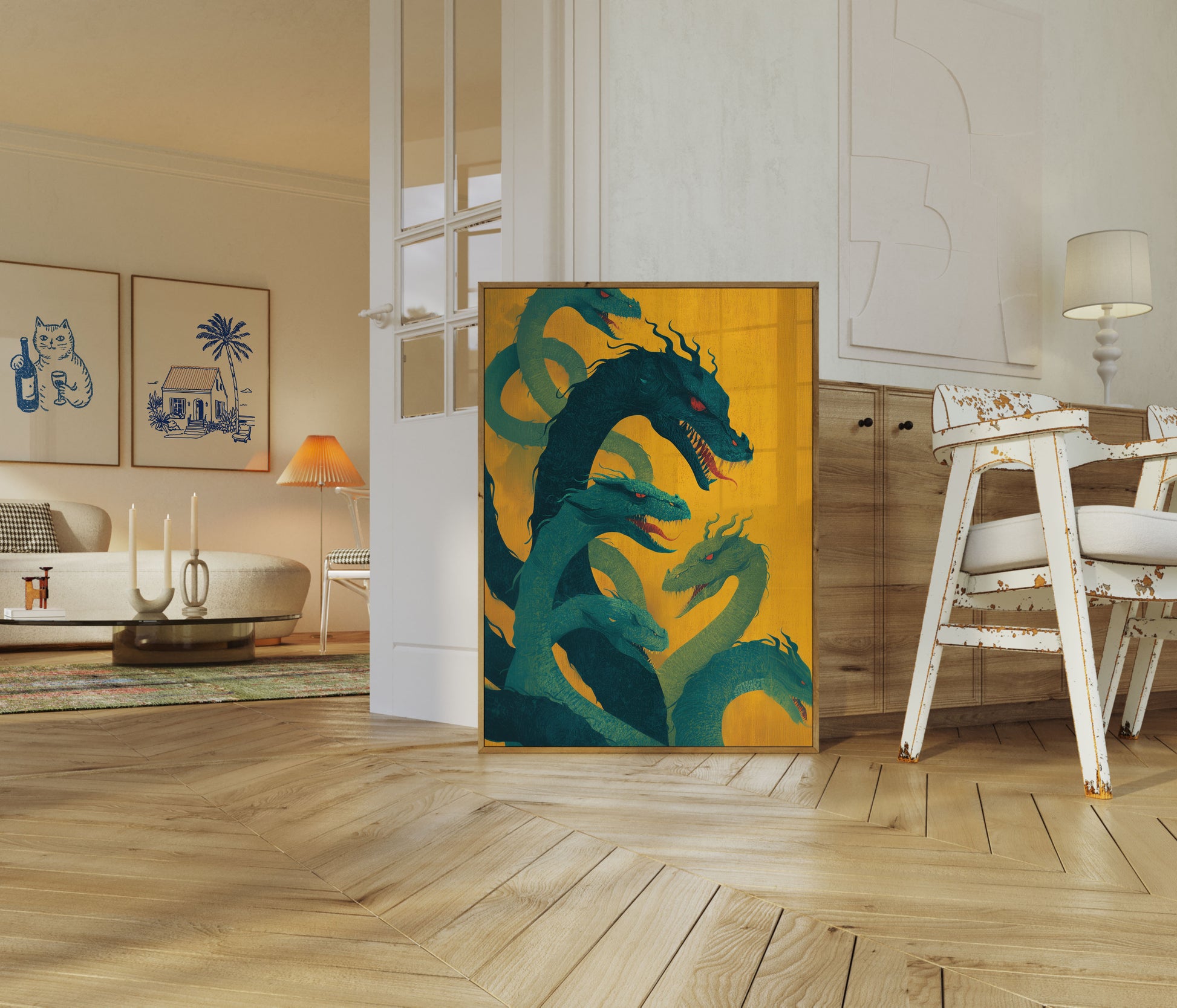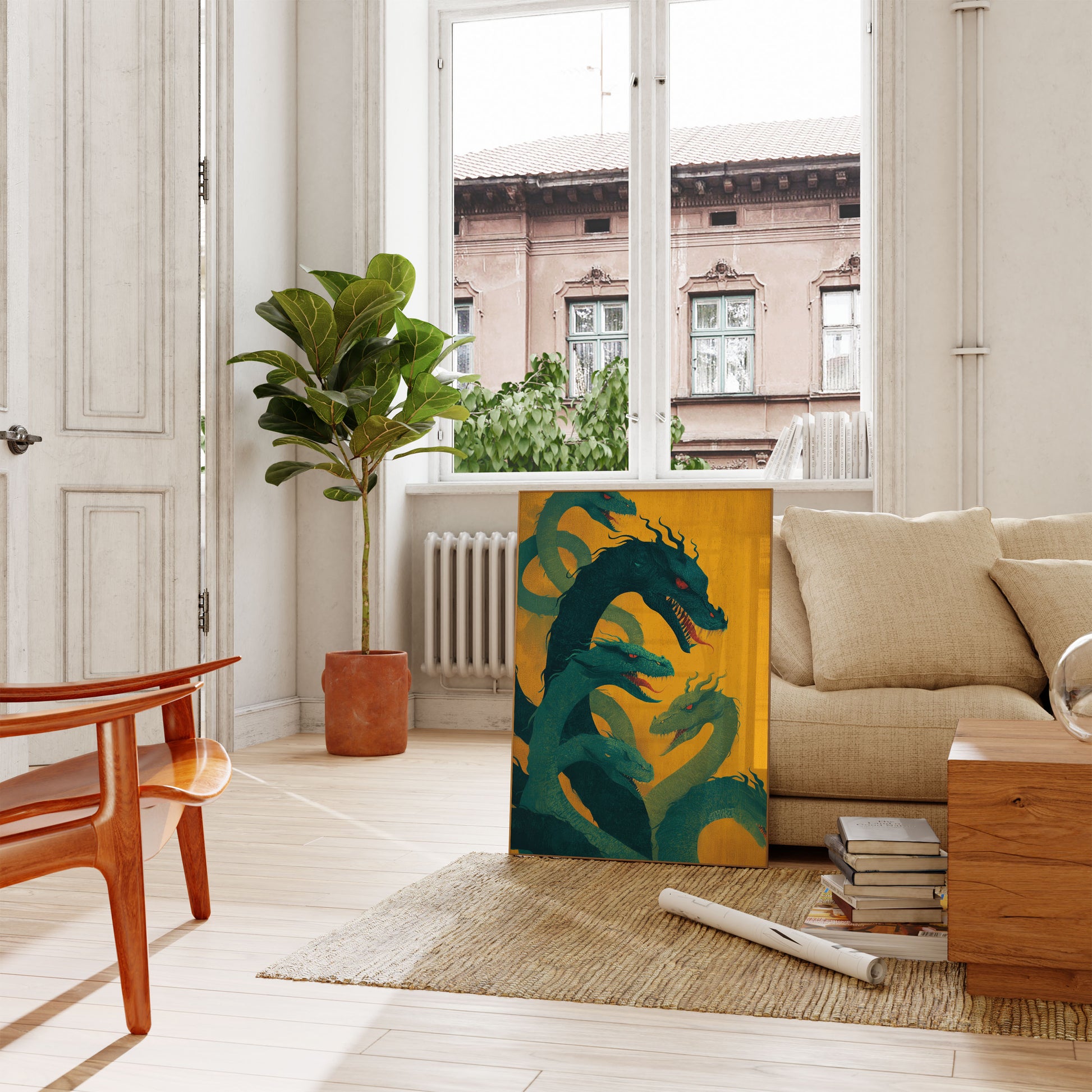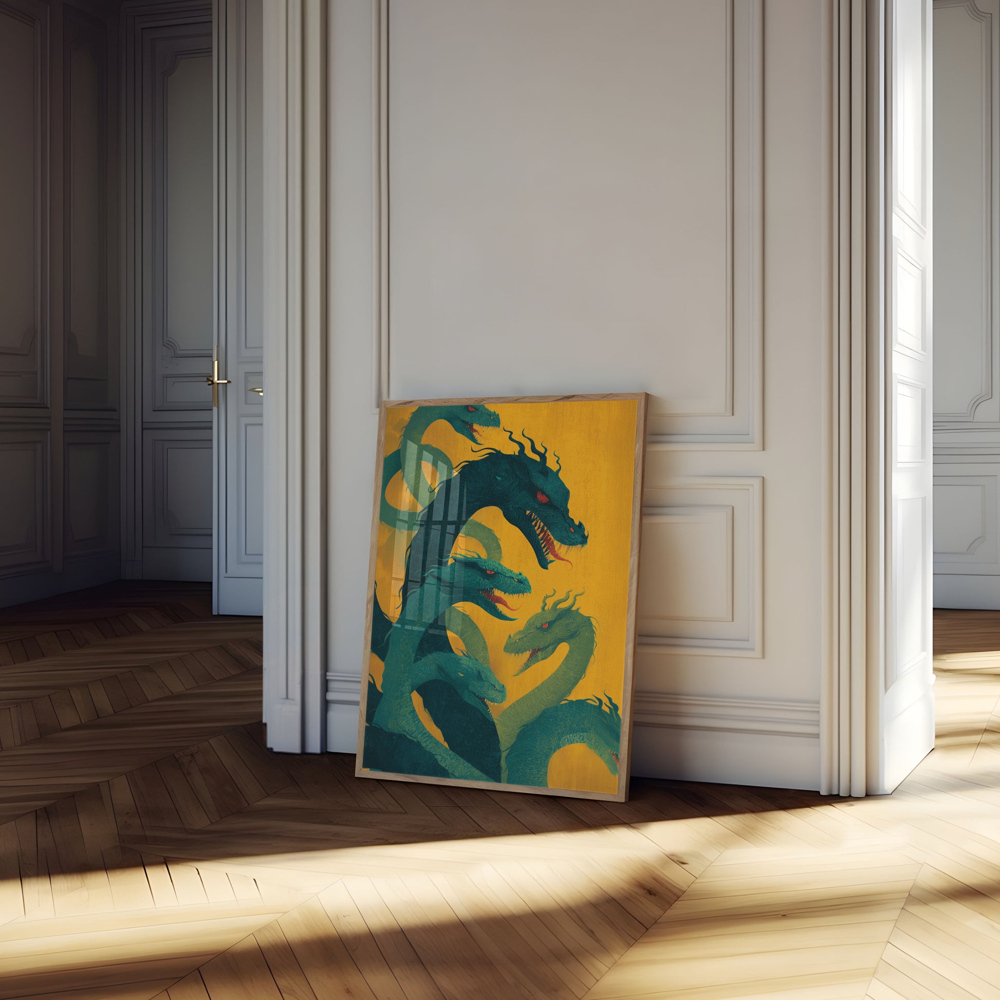 Sumérgete en un fascinante mundo de dragones místicos, donde feroces criaturas reptiles se entrelazan sobre un impactante fondo amarillo dorado. Cada forma serpentina ostenta cautivadores ojos rojos y dientes afilados, creando una intensa y dinámica sinfonía visual de escamas esmeralda y verde azulado. La obra de arte captura una energía mítica primigenia que late con un poder prehistórico puro.