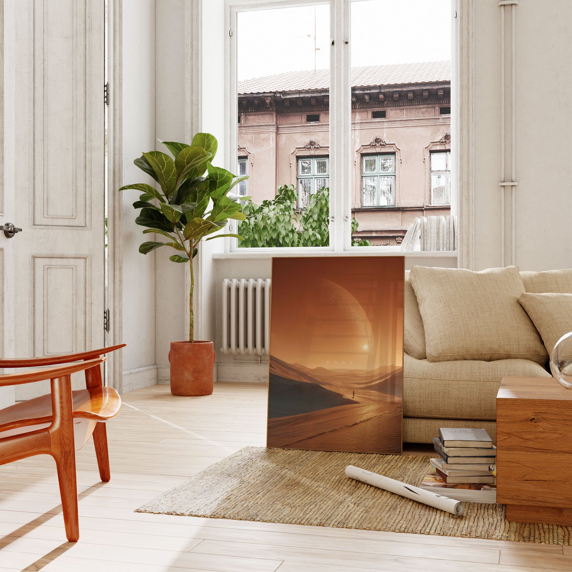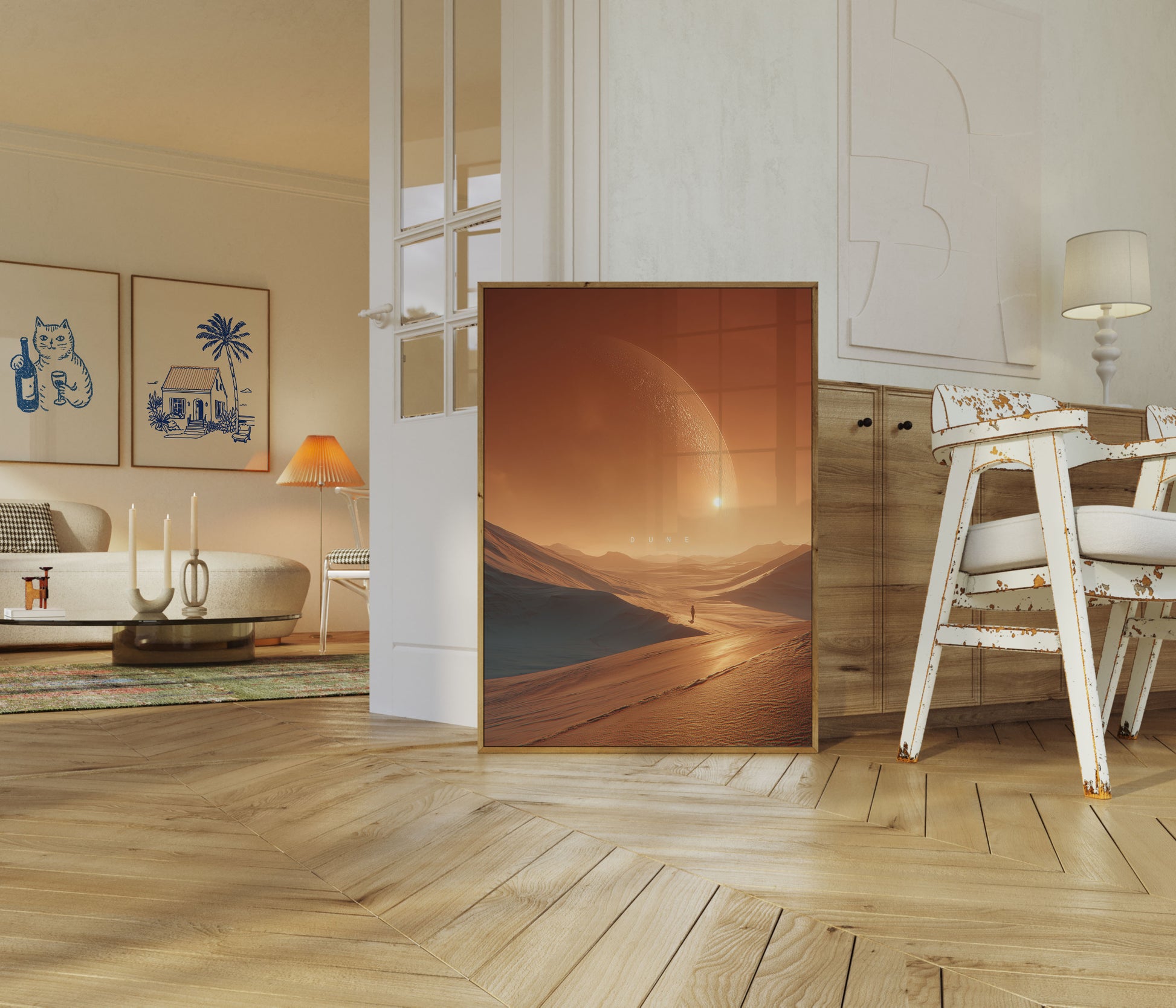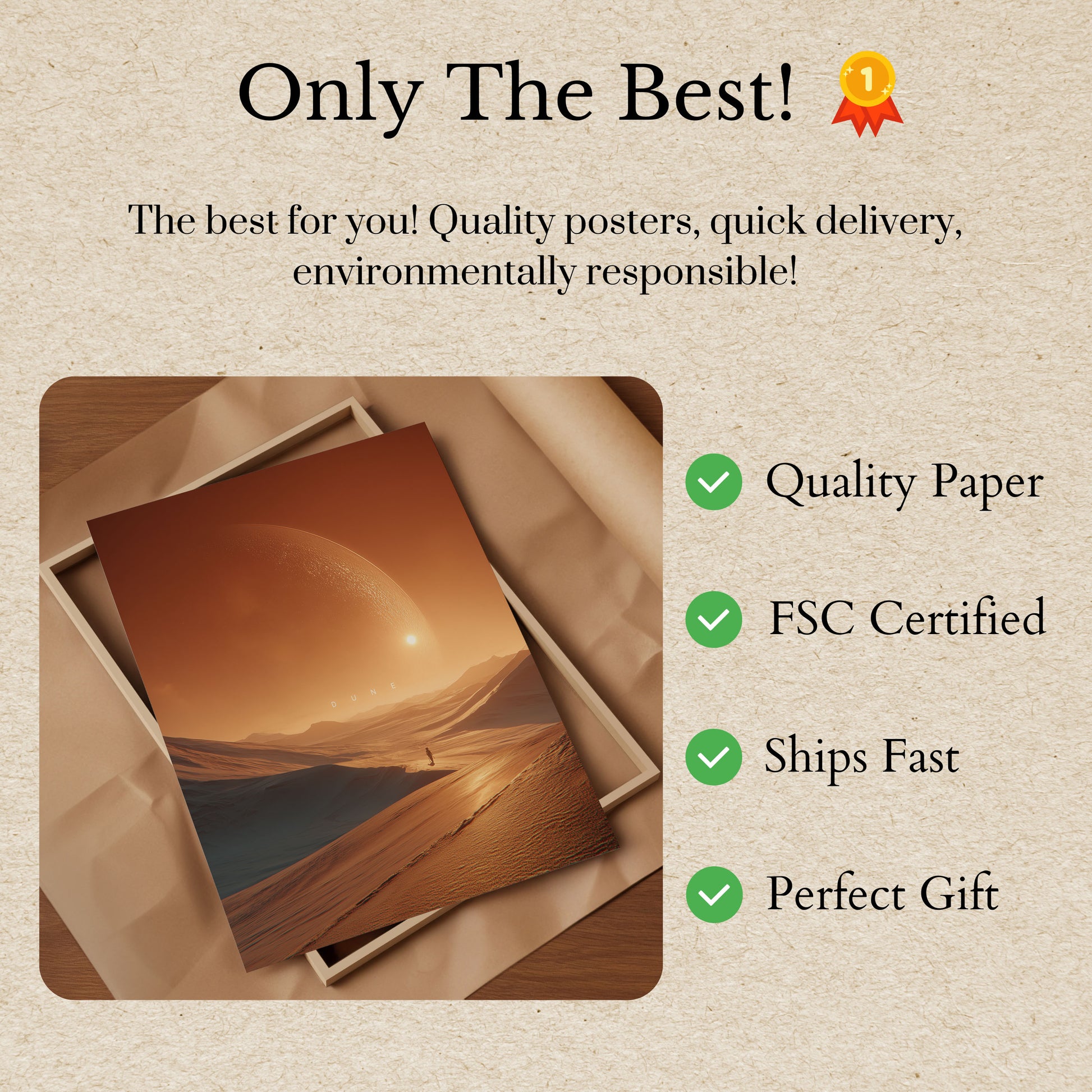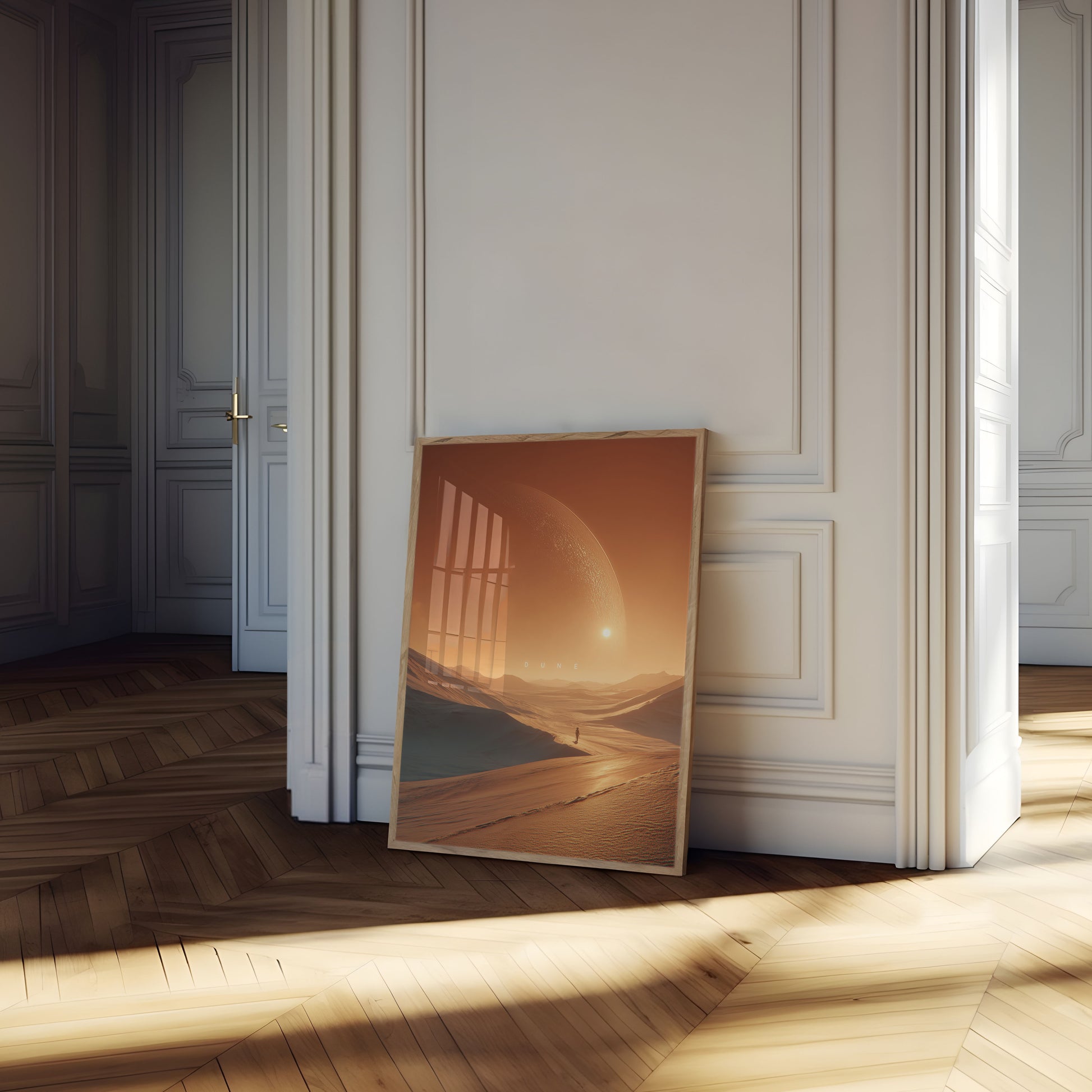 Sumérgete en la imponente inmensidad de un mundo desértico alienígena, donde las dunas de arena dorada se extienden infinitamente bajo un planeta enorme y texturizado que domina el cielo ámbar. Una figura solitaria se yergue diminuta contra el imponente paisaje, capturando la escala épica y el aislamiento de esta fascinante vista de ciencia ficción. Los cálidos y luminosos tonos naranja y dorado crean una sensación de belleza sobrenatural y aventura misteriosa.