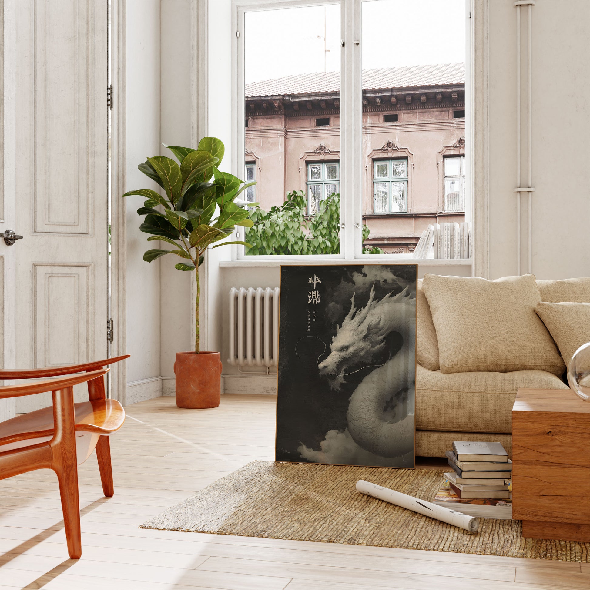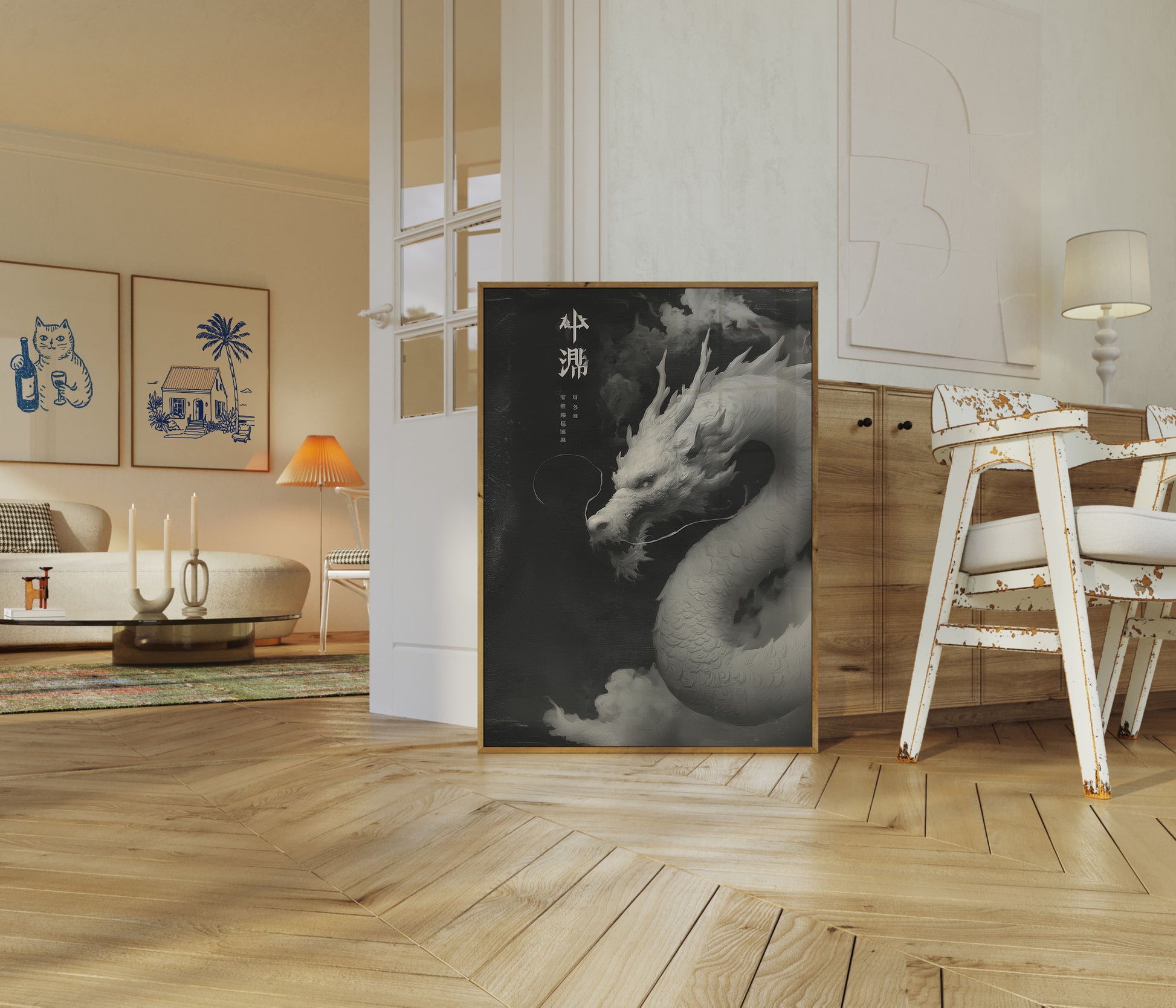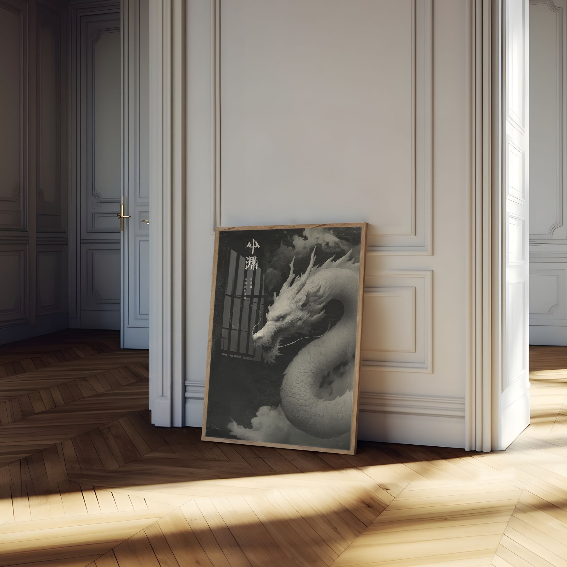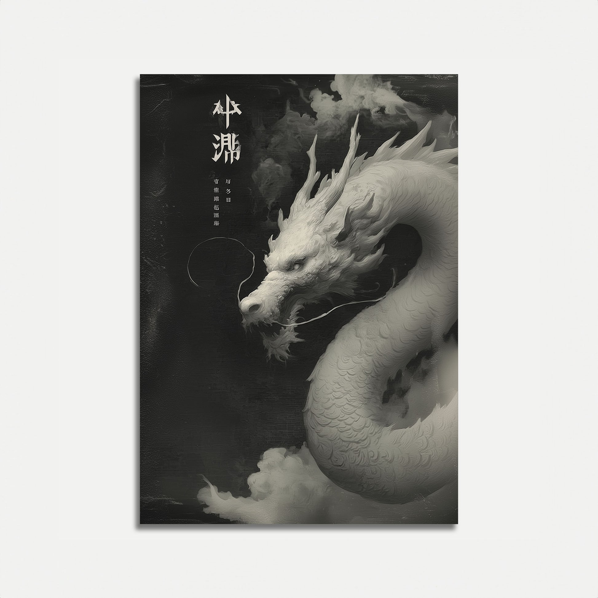 Sumérgete en la cautivadora belleza de esta obra monocromática de dragón, donde nubes místicas y escamas intrincadas convergen en un impresionante despliegue de fantasía y emoción. El dragón emerge de una suave y ondulante nube de humo, con su forma escultural representada en una impresionante escala de grises que captura cada delicada textura y feroz expresión. Esta cautivadora pieza transforma cualquier espacio en un portal de antiguas maravillas mitológicas.